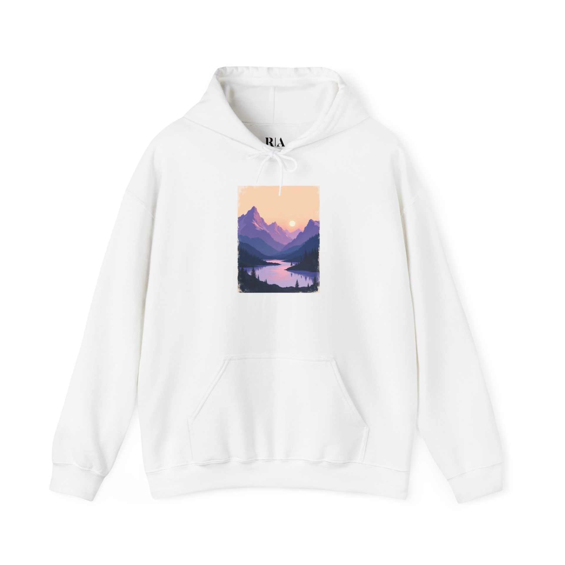 Carry the magic of twilight with you in the Alpine Afterglow hooded sweatshirt. This isn’t just apparel—it’s an experience. Featuring a breathtaking design of rugged mountain peaks reflected in serene waters under a glowing sunset, it’s a wearable tribute to nature’s beauty.