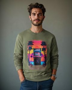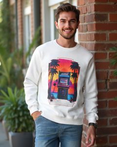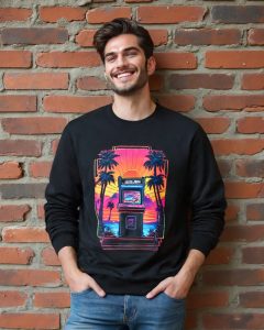 Step into nostalgia with this retro-inspired sweatshirt! Featuring a bold synthwave design, it showcases a classic arcade cabinet set against a striking tropical sunset. Neon-outlined palm trees and a gradient sky of hot pink, orange, and yellow create a stunning vaporwave vibe that instantly turns heads. This vibrant artwork perfectly fuses 80s arcade nostalgia with modern streetwear style, making it a must-have for gamers and retro fashion fans alike. Comfortable, stylish, and unapologetically bold, this sweatshirt isn’t just clothing—it’s a statement of your love for gaming culture and vintage aesthetics.