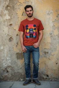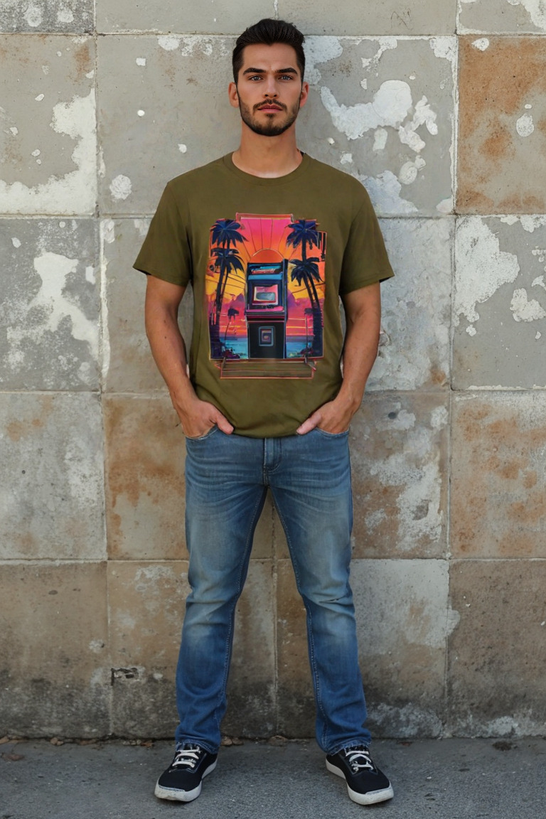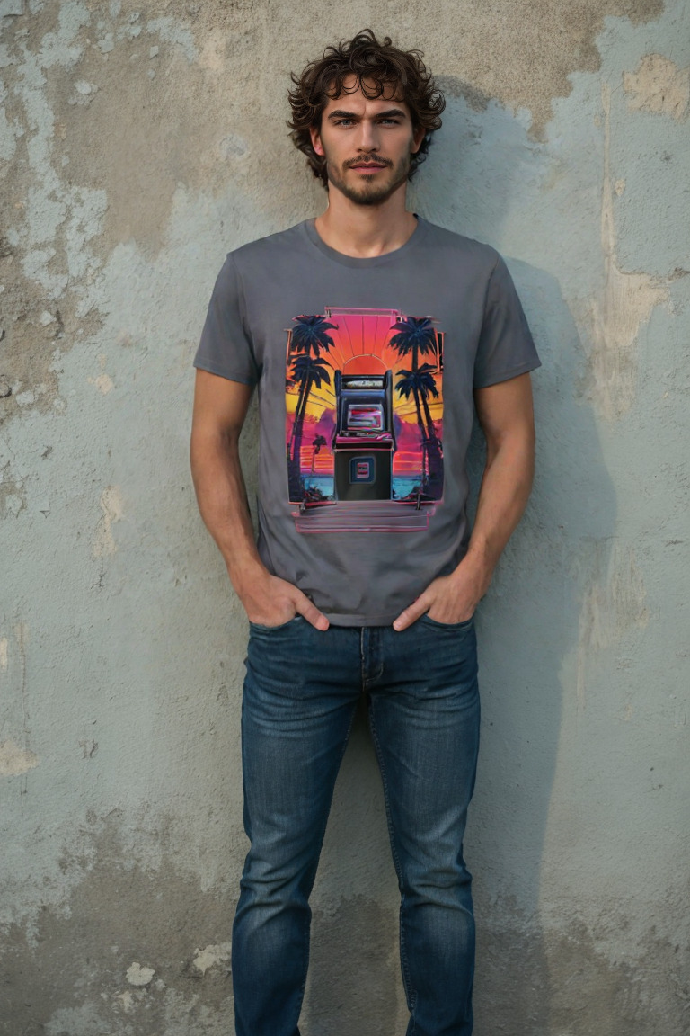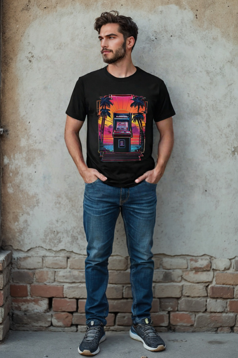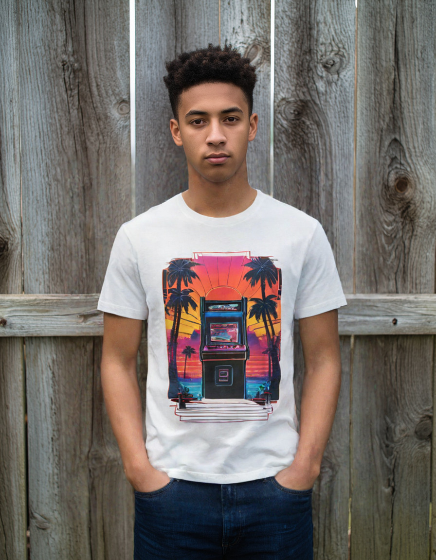 Level up your wardrobe with our “Arcade Oasis” t-shirt—where retro gaming and eternal summer vibes hit the high score. Picture this: a classic arcade cabinet basking in the glow of a synthwave sunset, flanked by palm trees so cool even Miami Vice would do a double-take. Game on, style up.