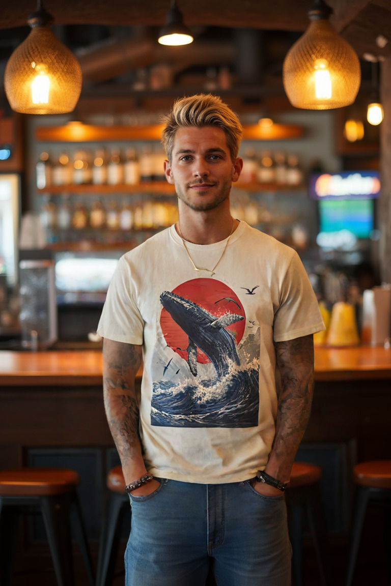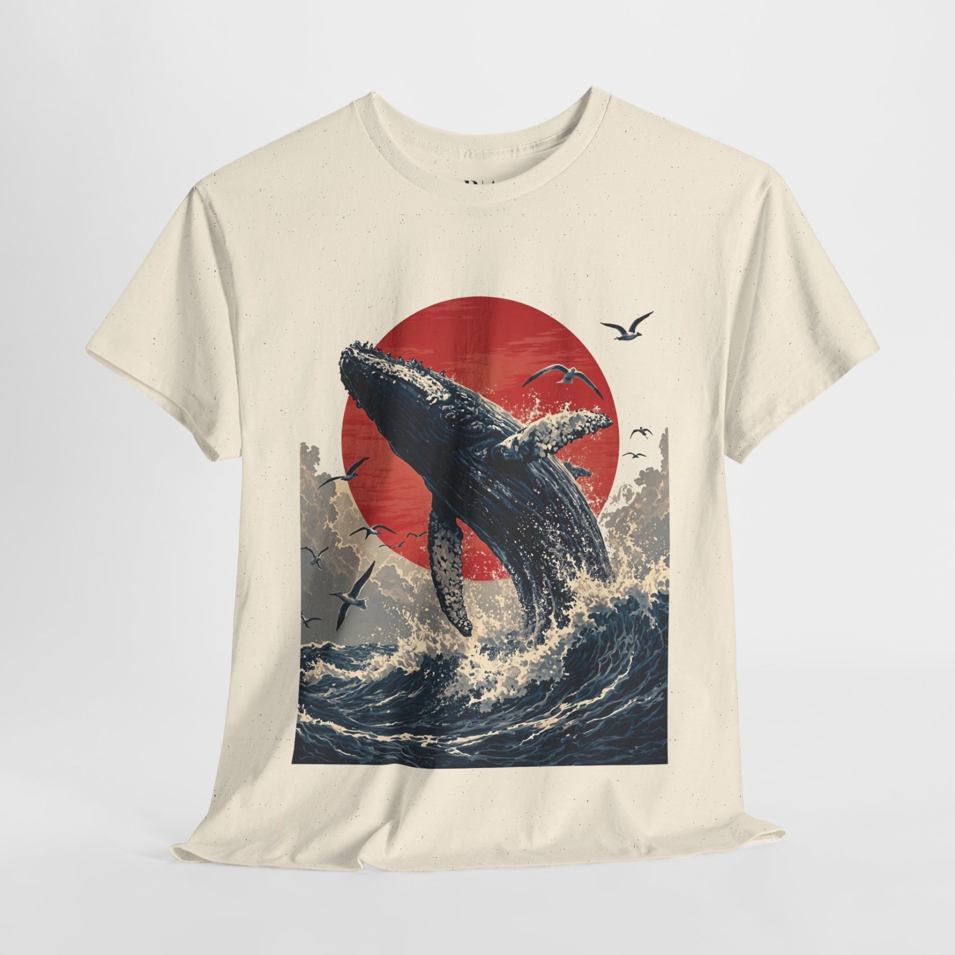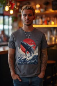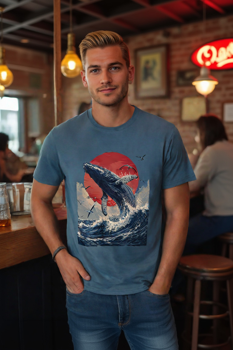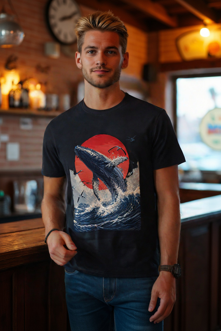 Make a splash with the “Breaking the Surface” T-shirt. Featuring a breathtaking illustration of a majestic whale breaching the ocean waves against a vivid red sun, this design captures the raw power and beauty of nature’s giants. Surrounded by soaring seabirds and dynamic waves, the artwork evokes a sense of awe and freedom. Crafted from 100% cotton for ultimate comfort, this tee is available in multiple colors—perfect for ocean lovers and anyone inspired by the wild, untamed sea