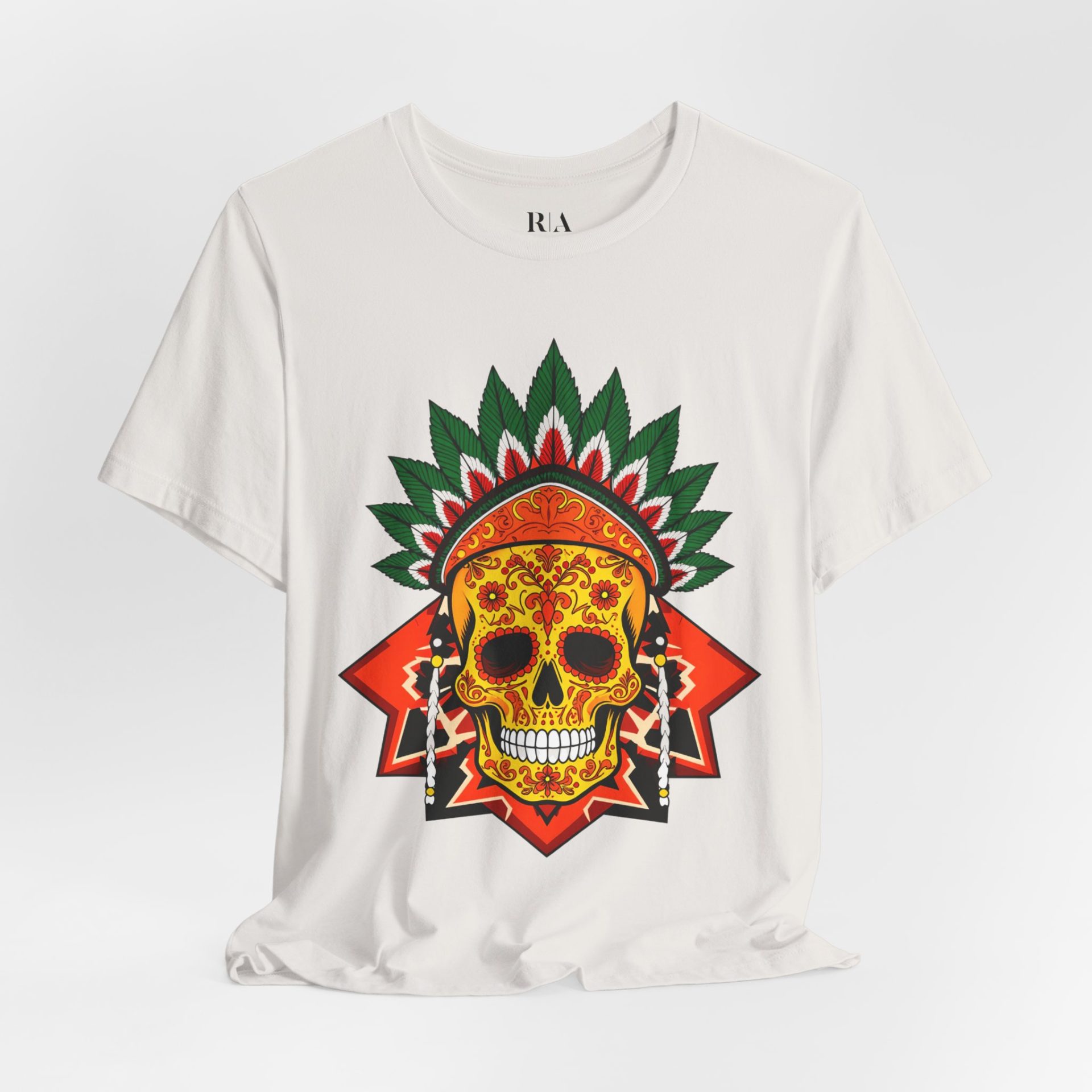 Unleash your inner warrior with the Colorful Guardian tee. Made from 100% jersey cotton, this graphic tee channels bold festival energy into your daily style. The front features a vibrant, intricately patterned skull crowned with a striking headdress, blending folk art mystique with a modern edge. Soft, breathable, and available in multiple colors, this shirt is perfect for those who live for statement art and refuse to blend in. Stand out and stay comfortable with this masterpiece of wearable art.