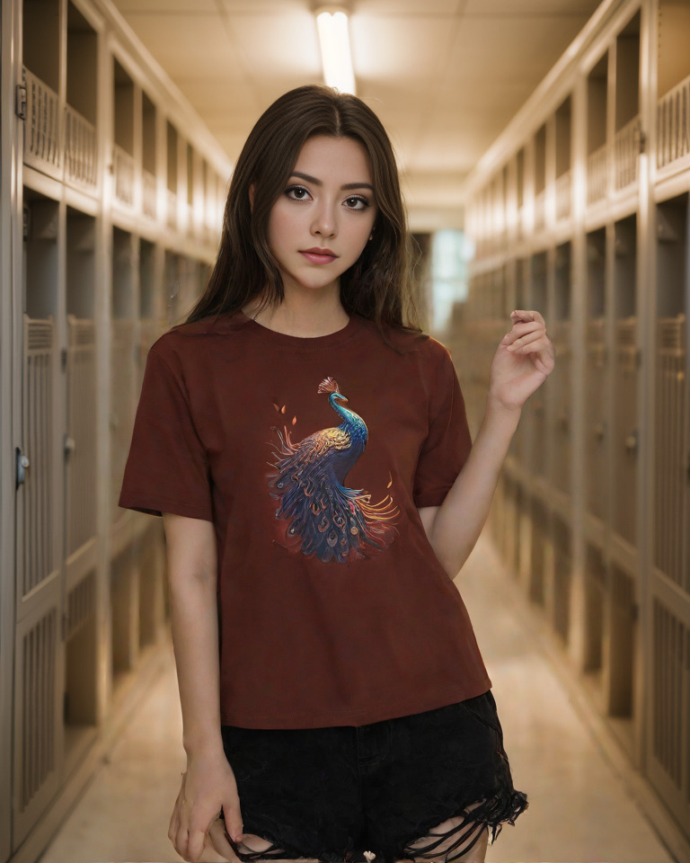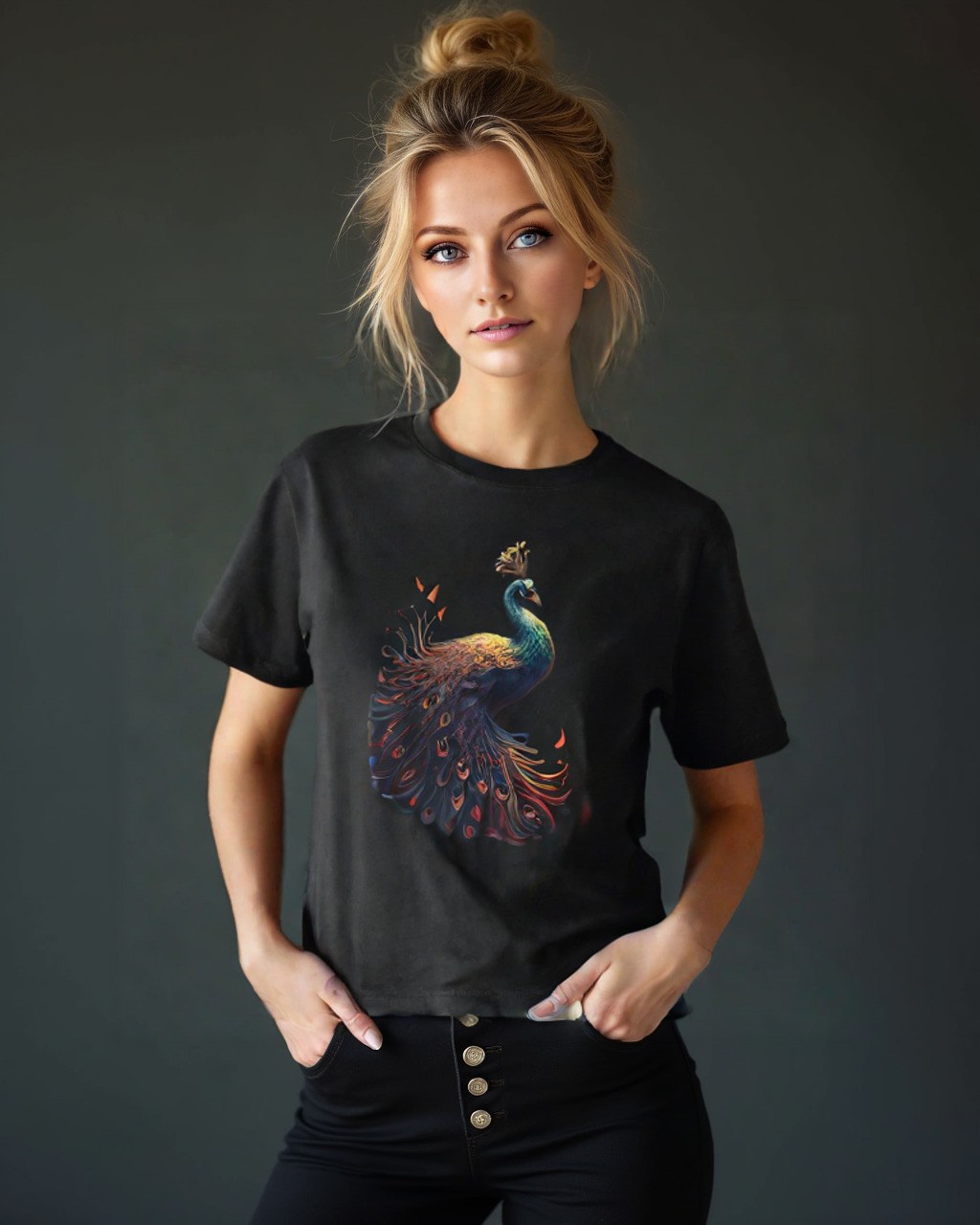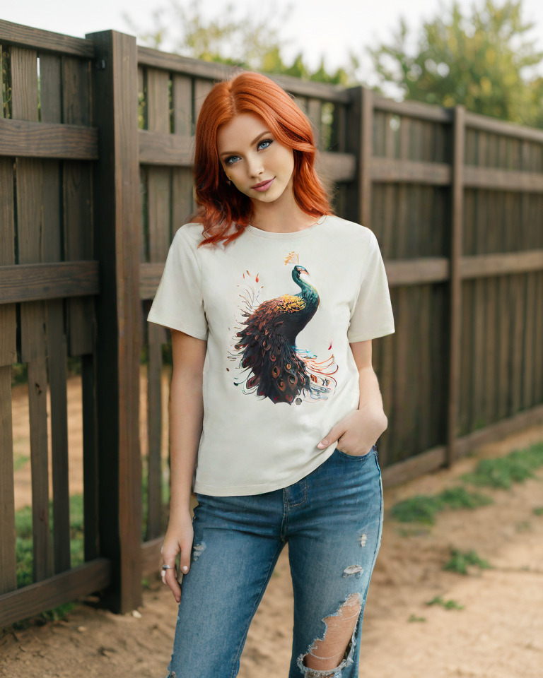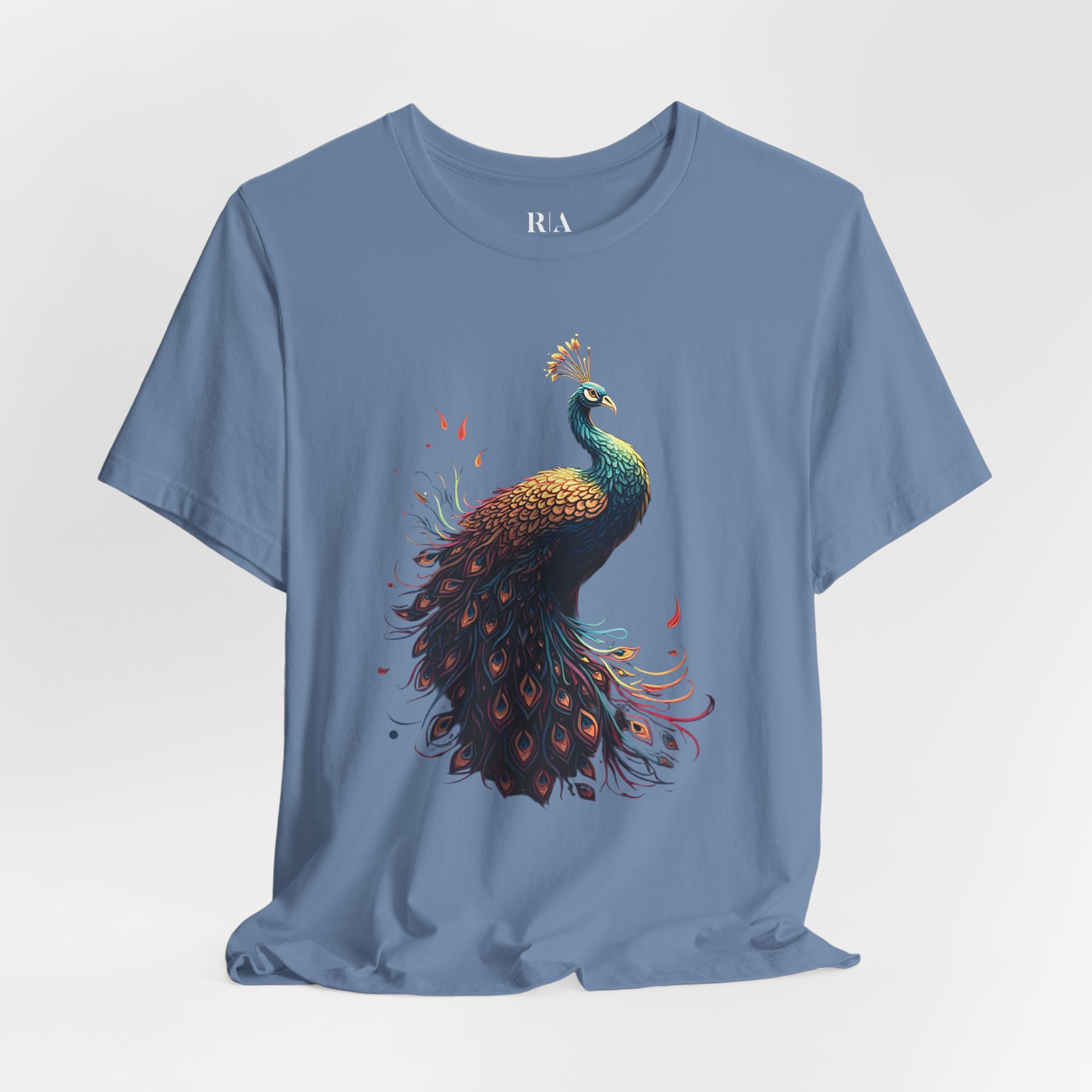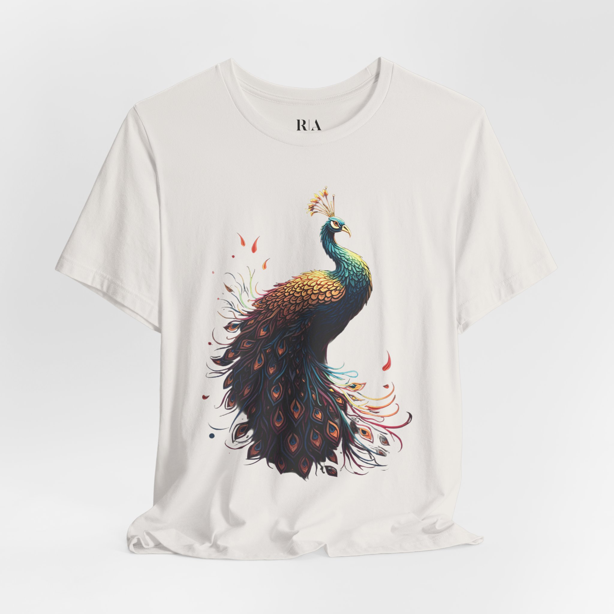 At the heart of the design is a majestic peacock with intricately detailed feathers that radiate elegance and movement. Delicate pops of red add a mystical energy, making this shirt more than just an outfit—it’s wearable art.