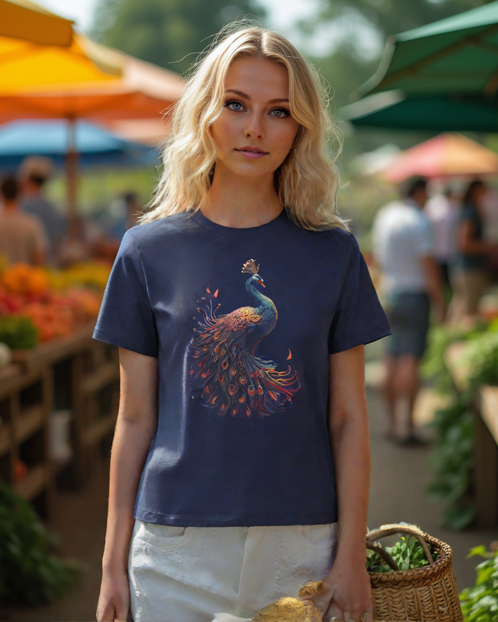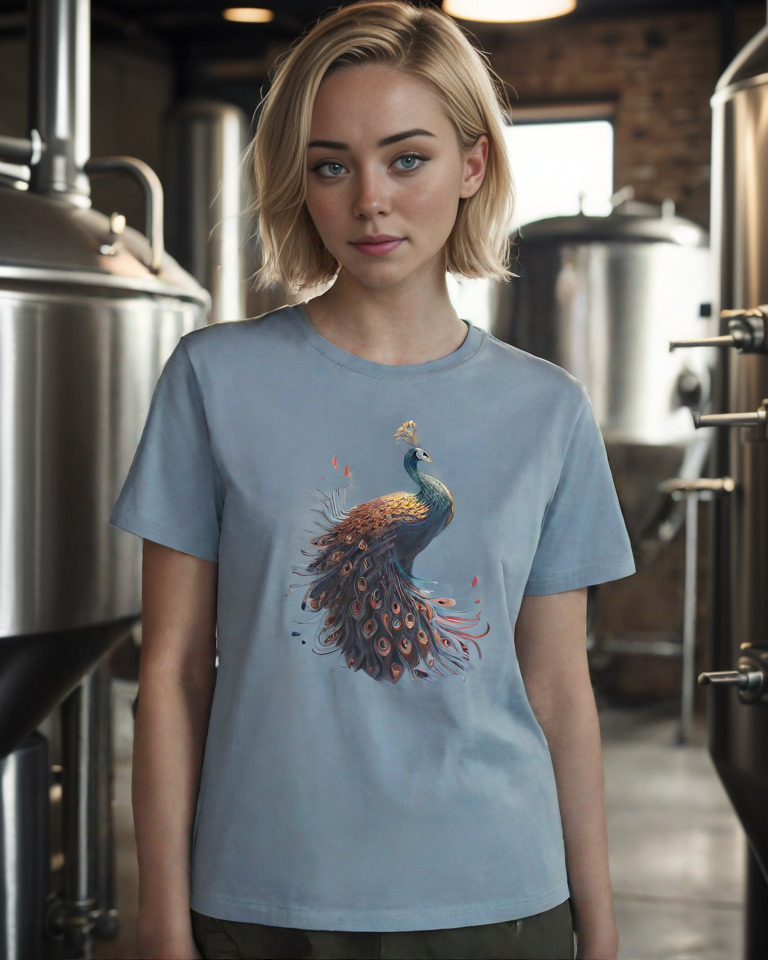 Meet the Cosmic Peacock – a t-shirt that transforms everyday wear into a masterpiece. This eye-catching design showcases a breathtaking peacock, brought to life with vibrant turquoise, rich golds, and deep navy hues that seem to dance across the soft white fabric.