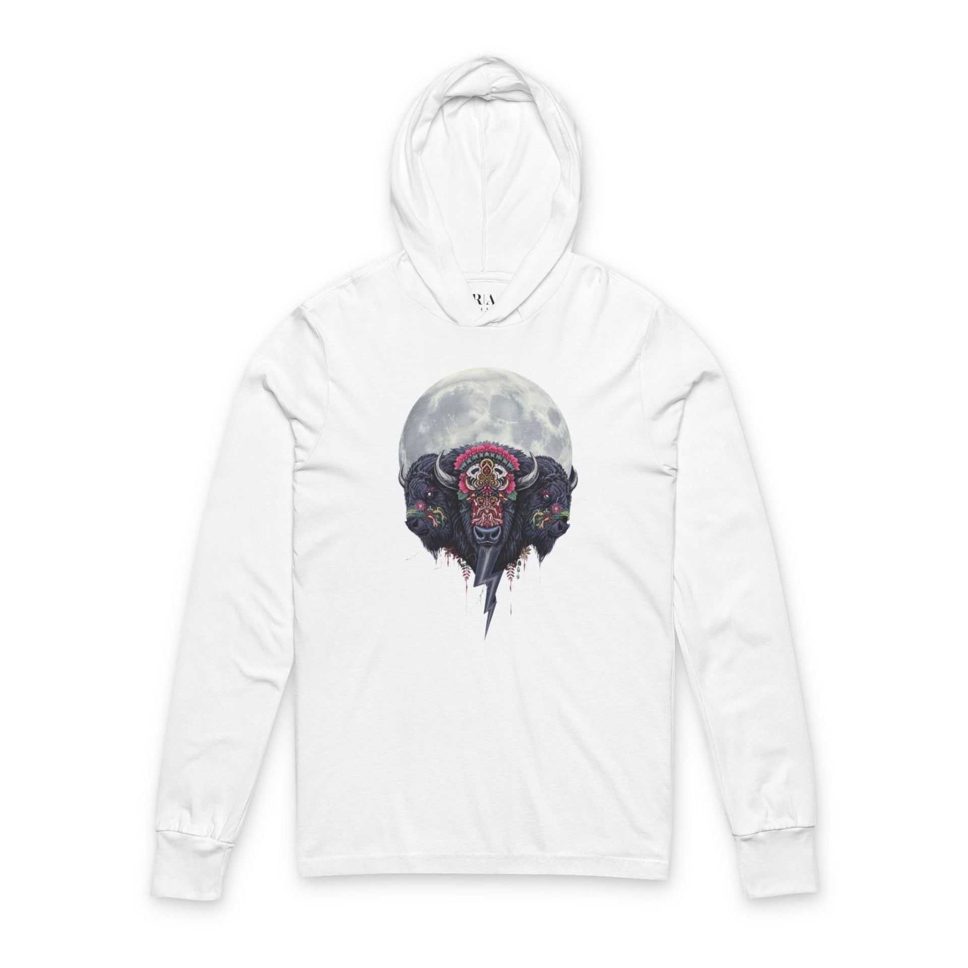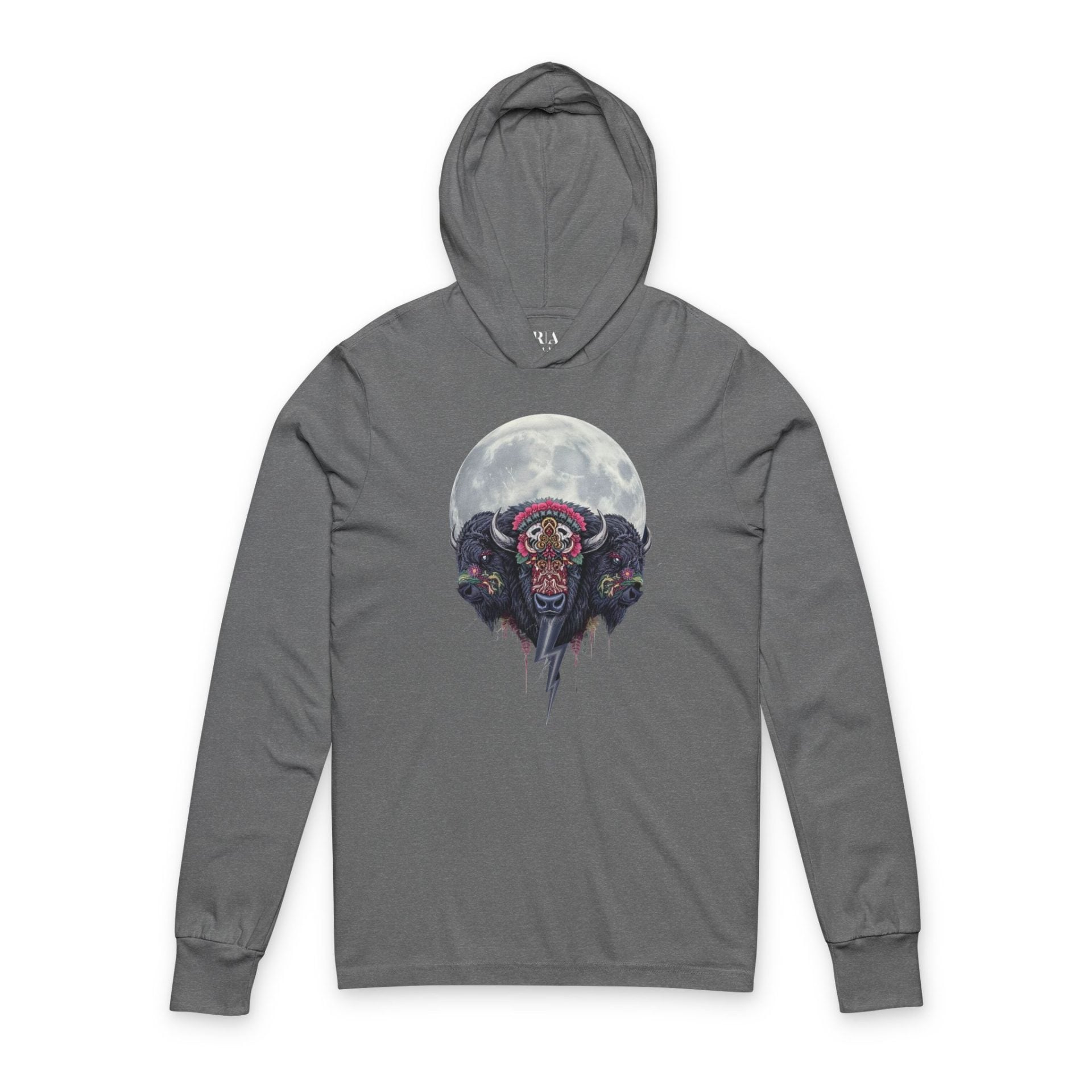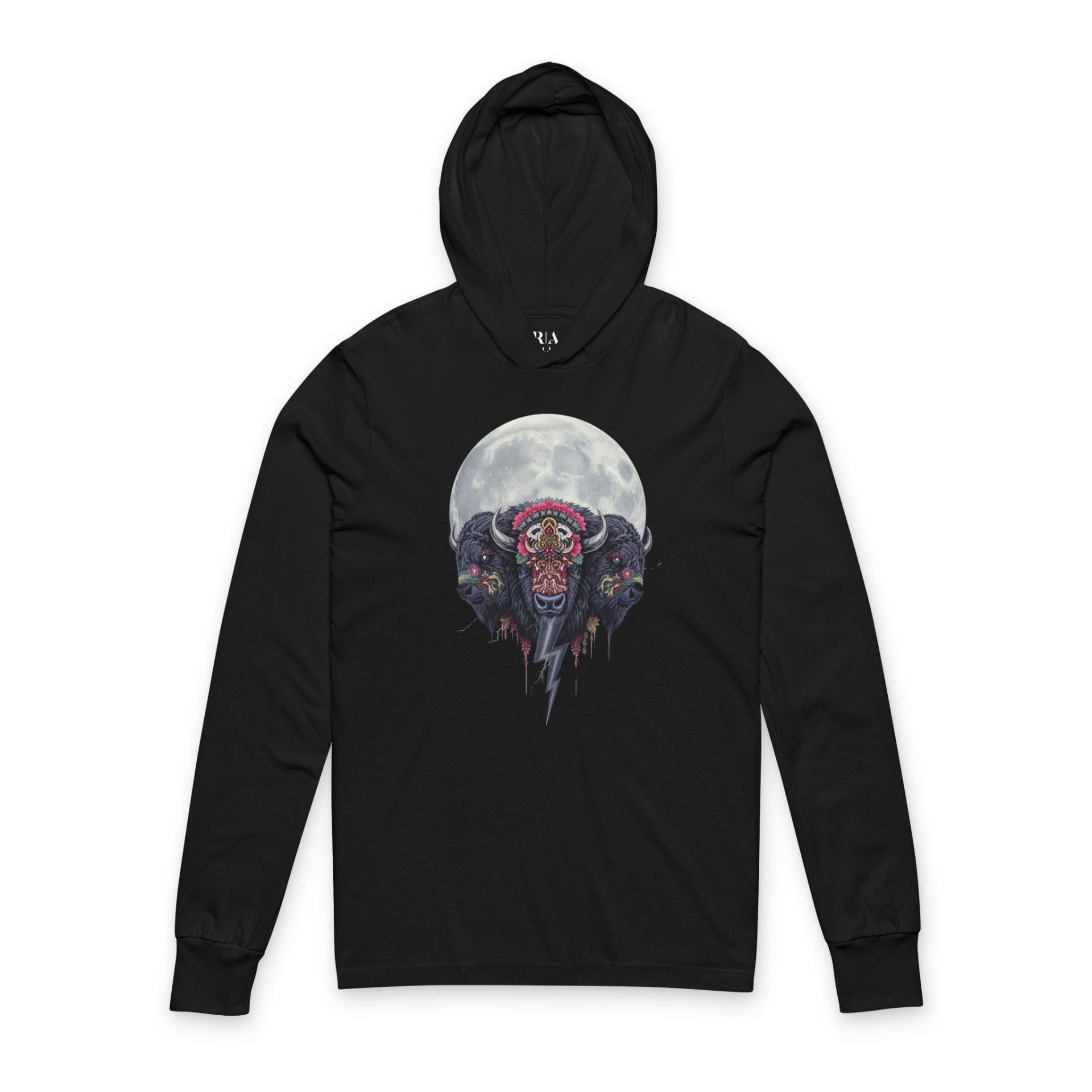 Unleash your adventurous side with the Cosmic Stampede Hooded T-shirt! Made from ultra-soft 100% ring-spun cotton, this tee is all about comfort and bold style. The stunning design features three powerful bison under a glowing full moon, brought to life with vibrant cosmic patterns and a dramatic lightning bolt. Available in a variety of colors, it’s perfect for turning heads and making a statement wherever you go. Stand out. Be bold. Dare to be wild!