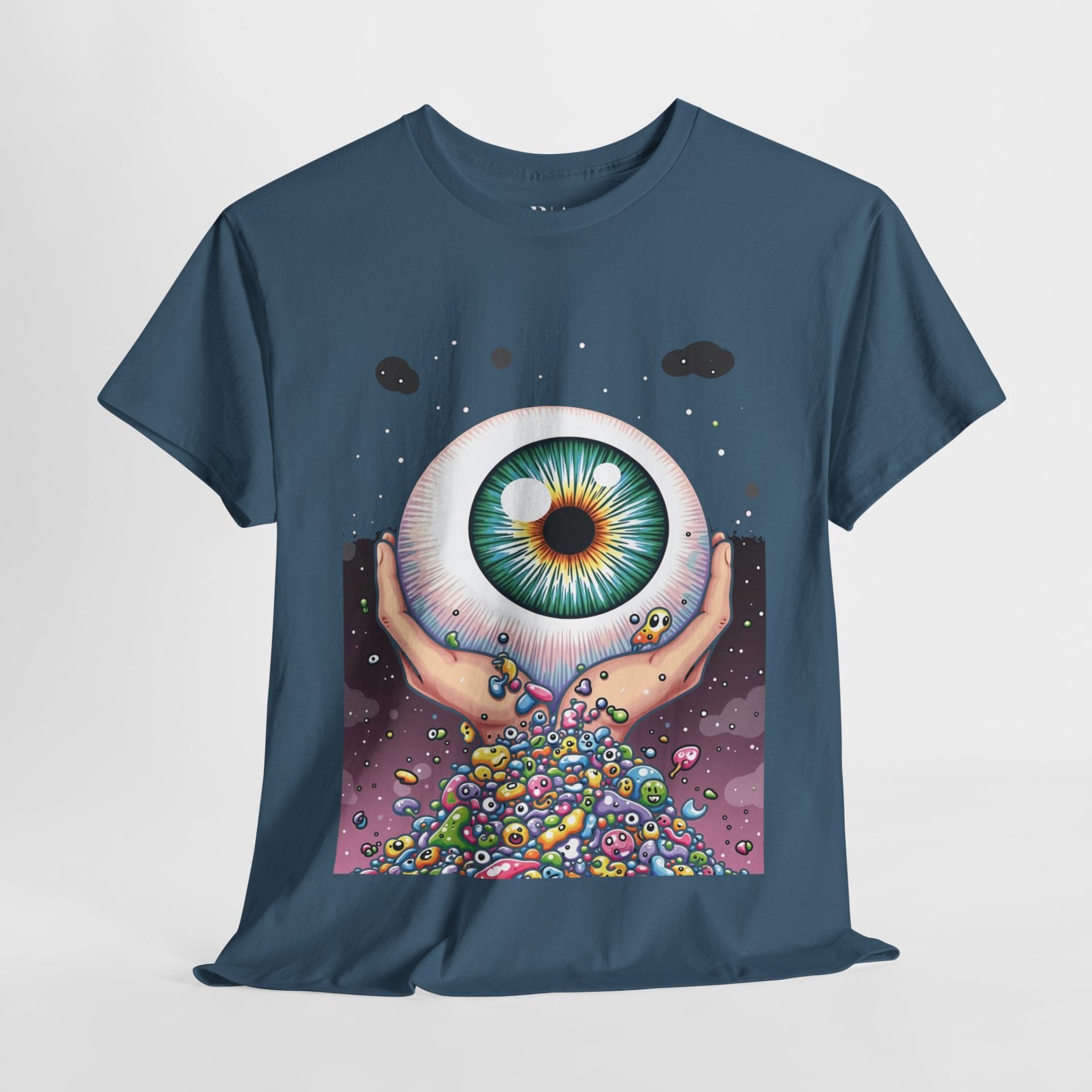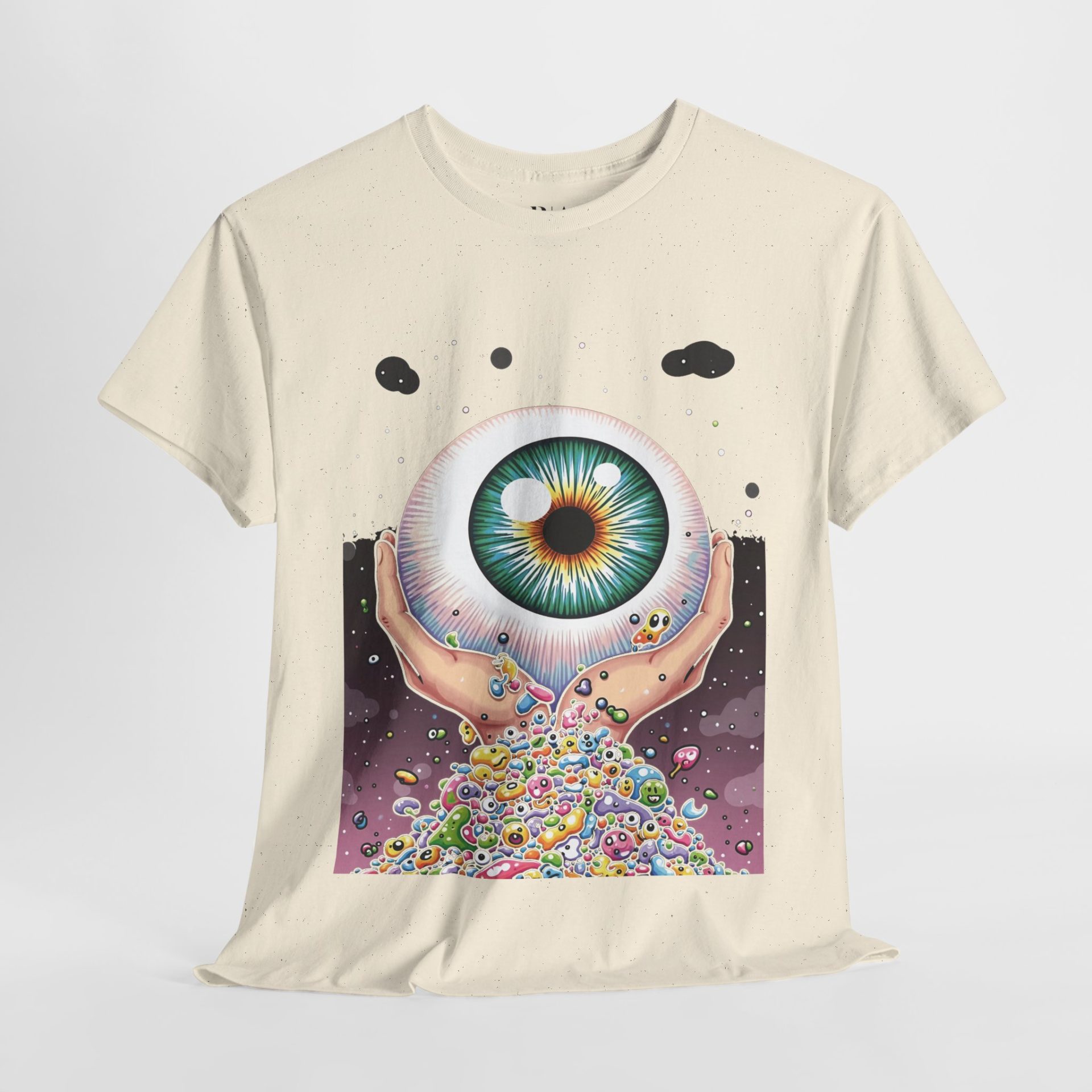 Step into a world of surreal wonder with the “Cradling the Cosmic Eye” T-shirt. This captivating design features a pair of hands gently holding a vibrant, detailed eyeball, from which a cascade of colorful, otherworldly shapes flows outward. The artwork evokes a sense of cosmic mystery and psychedelic imagination, making it a perfect statement piece for those who love bold, artistic fashion. Made from 100% cotton for ultimate comfort, this tee is available in multiple colors to suit your unique style