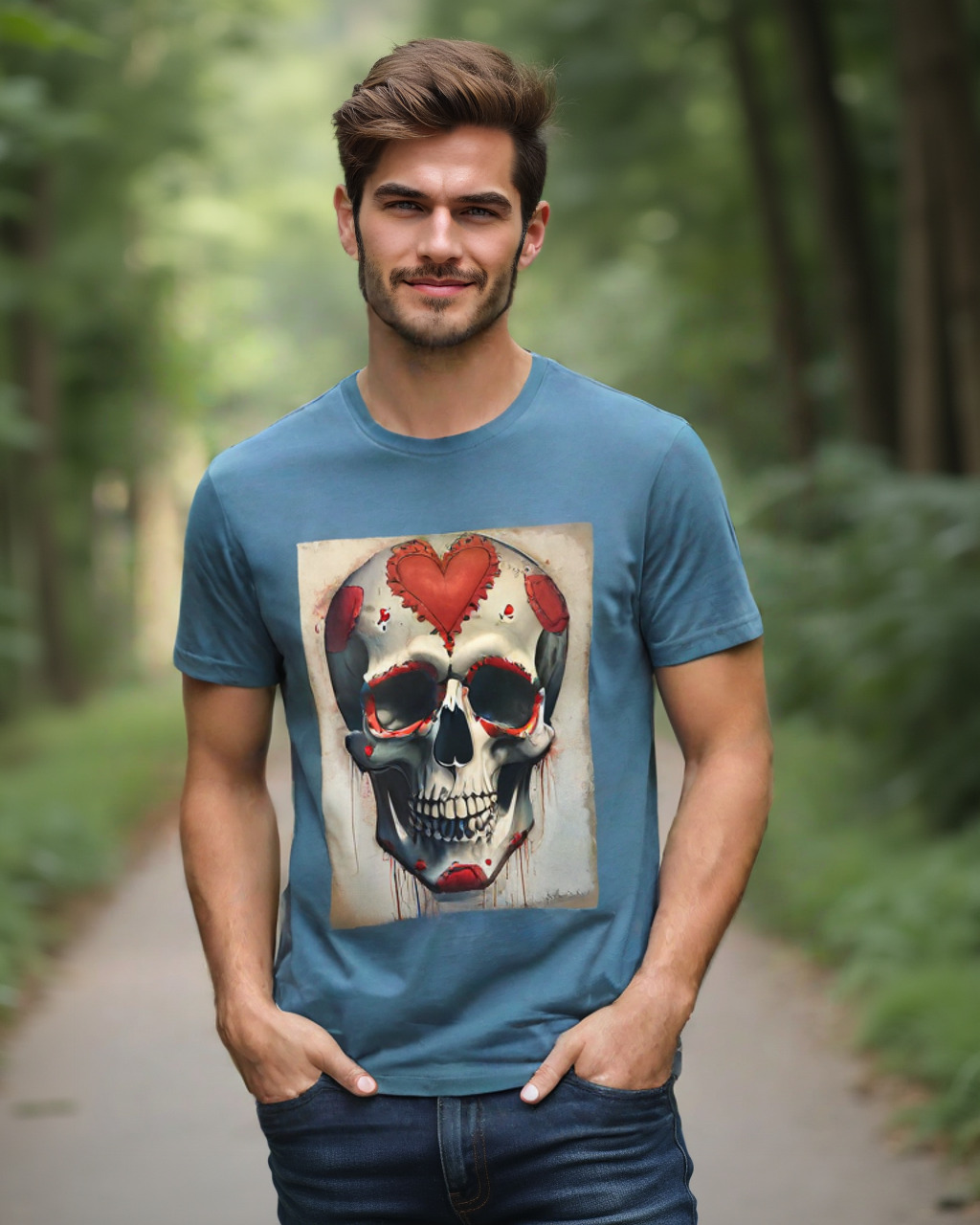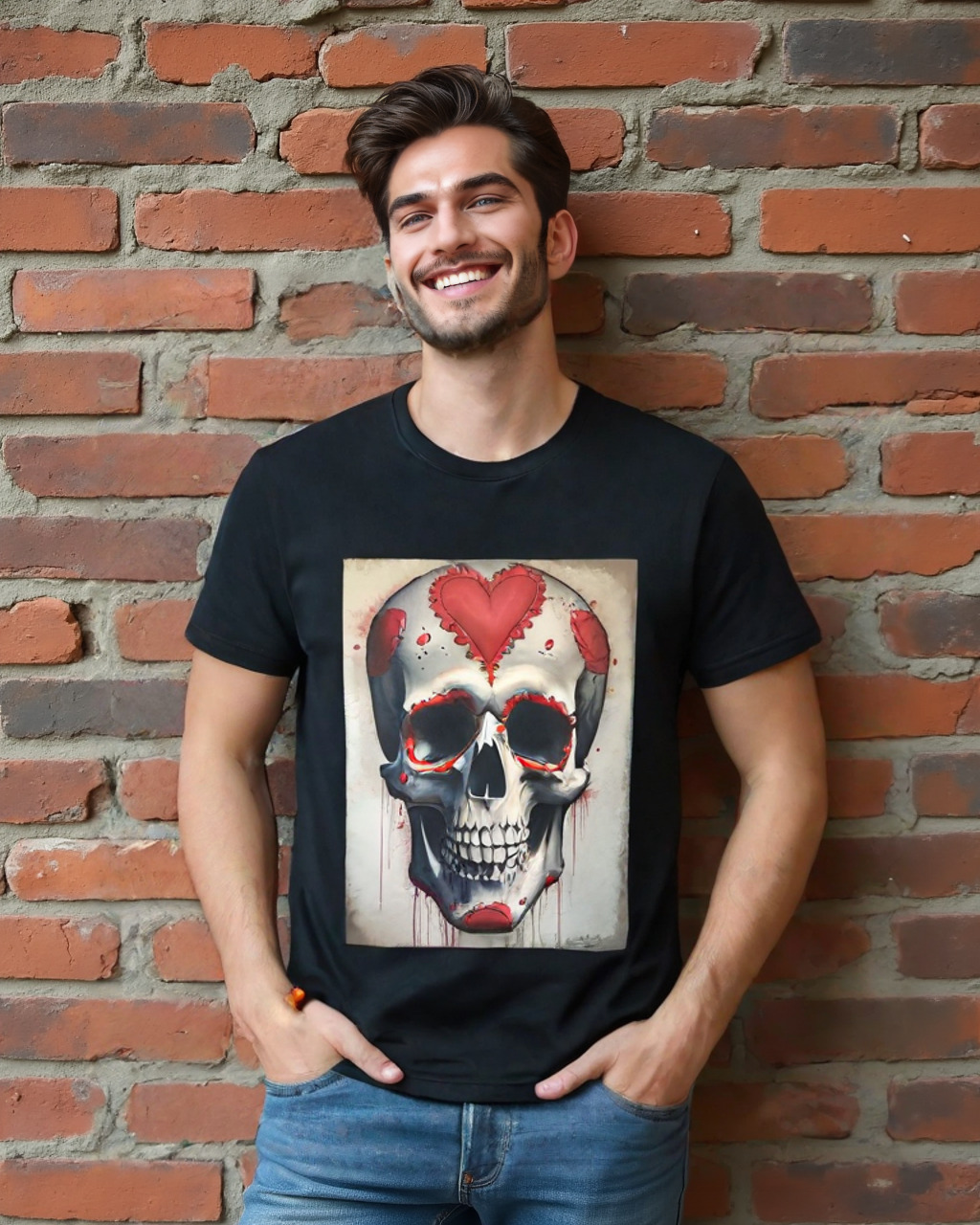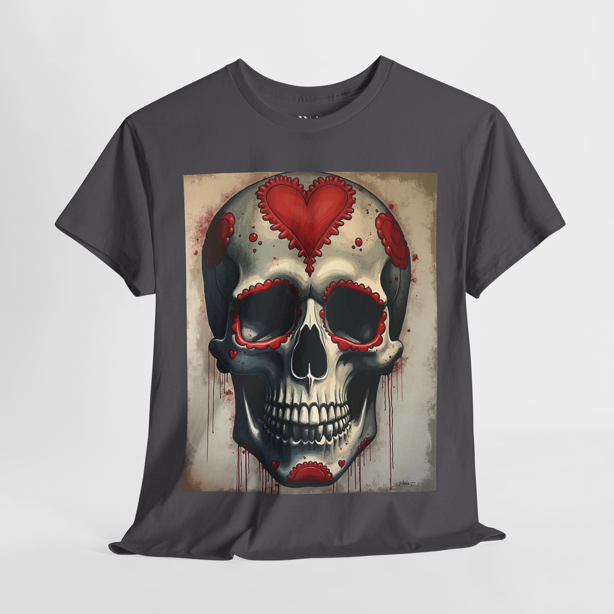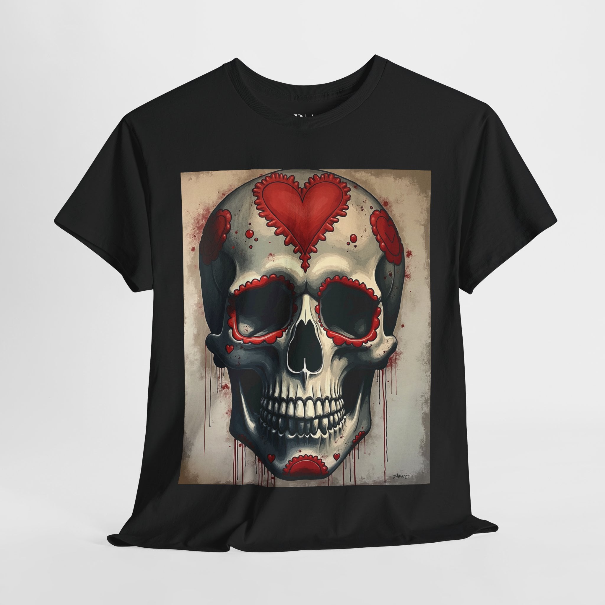 Embrace the darker side of romance with our “Dark Valentine” t-shirt, featuring a hauntingly beautiful skull design that perfectly balances macabre with love. The centerpiece showcases a masterfully detailed skull adorned with ornate red heart motifs and delicate lace-like embellishments.