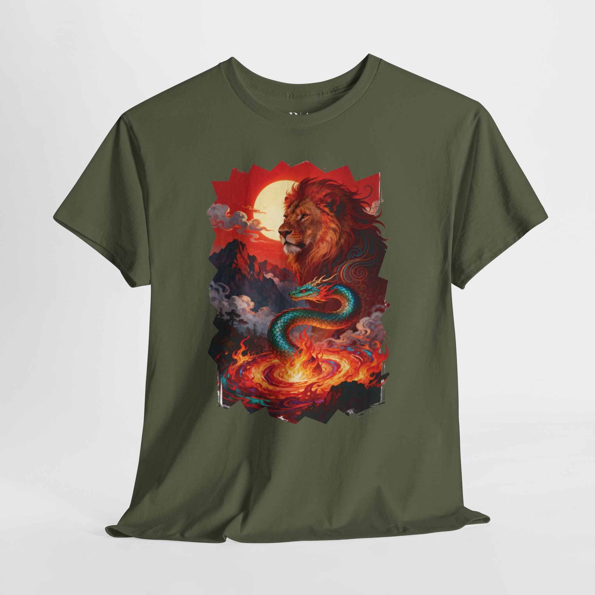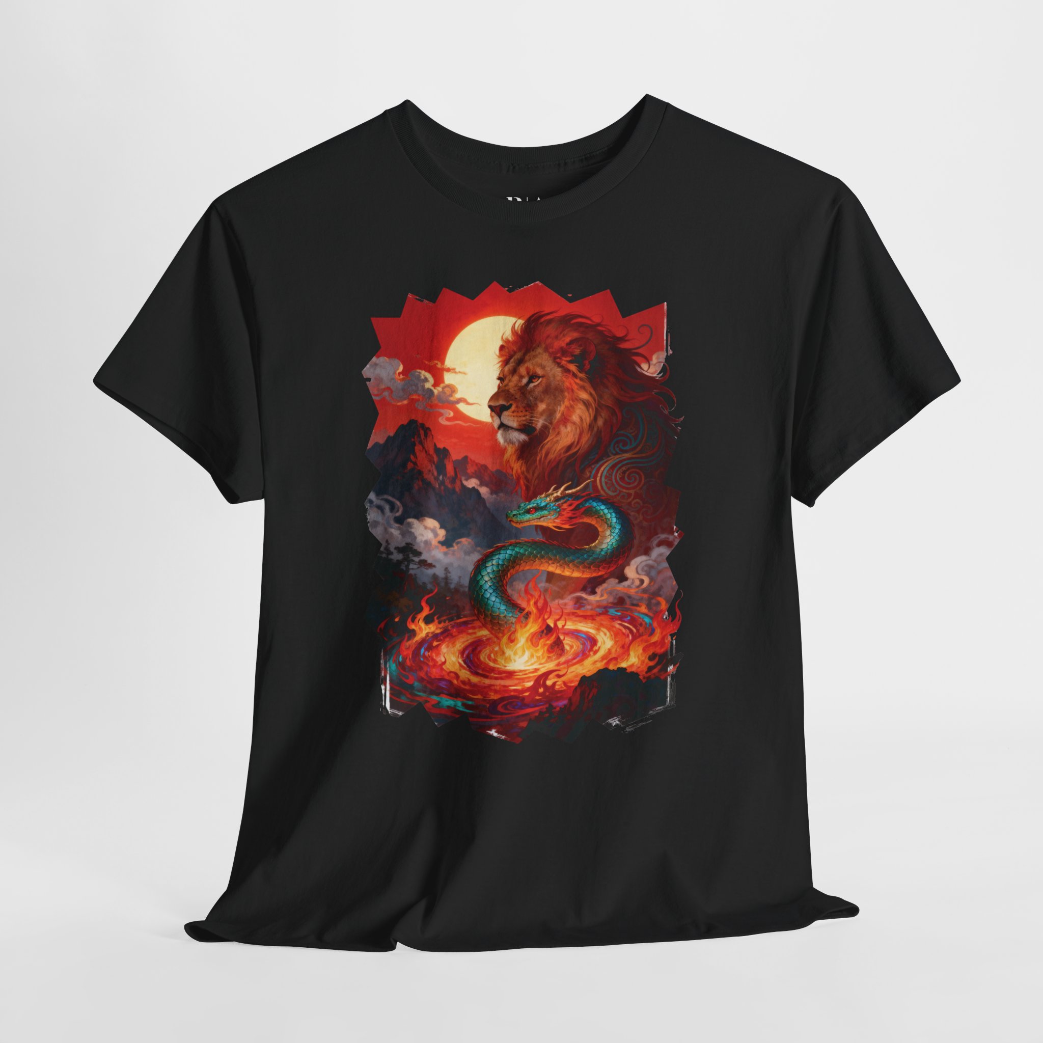 Command the elements with the Ember King and Scaled Sentinel tee, featuring a regal lion crowned by a blazing sun and a coiled dragon rising from swirling fire. Printed on soft 100% cotton and available in multiple colors, this graphic shirt brings mythic, high‑fantasy power to your everyday armor