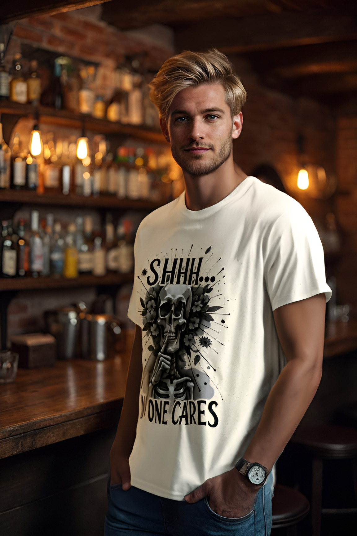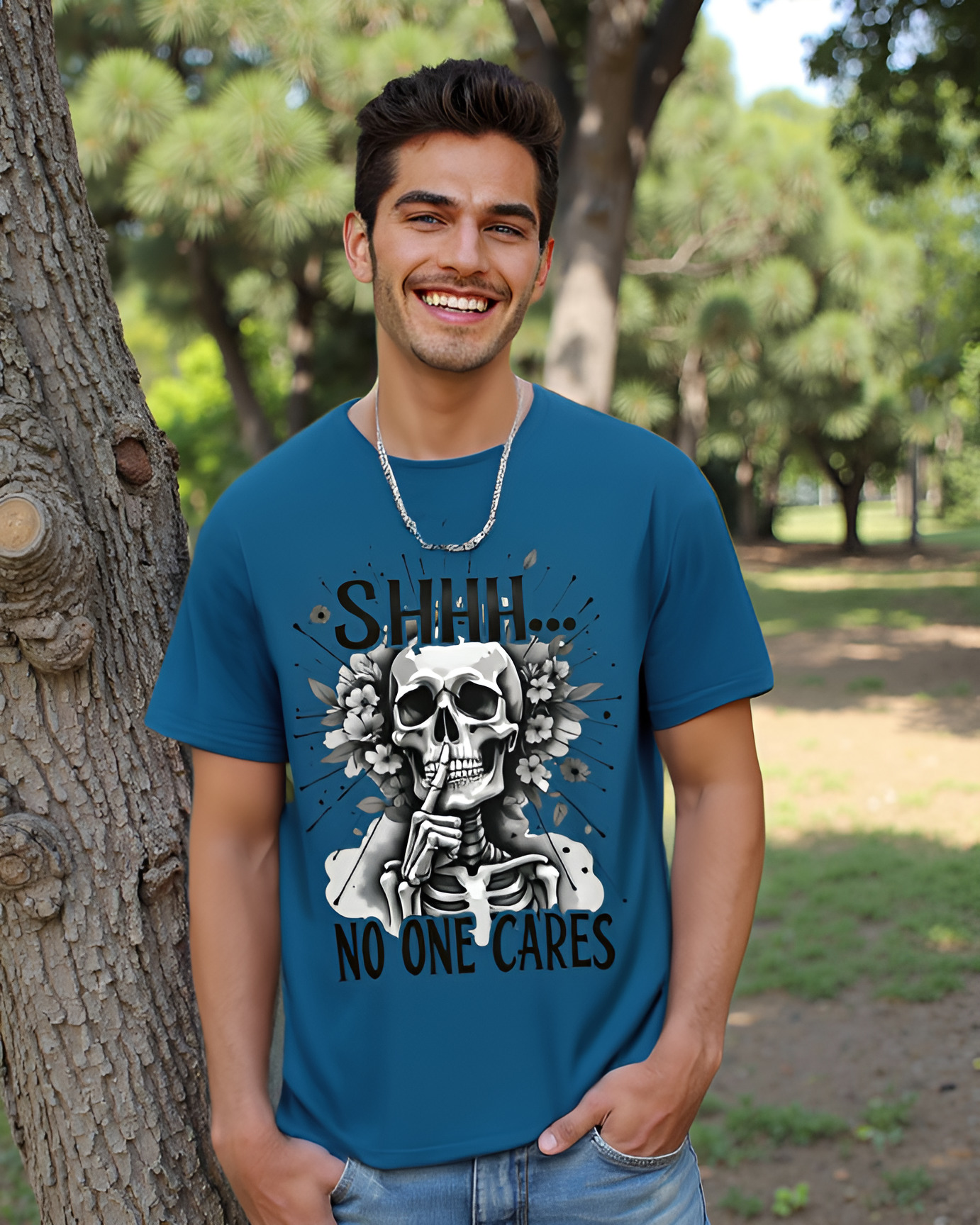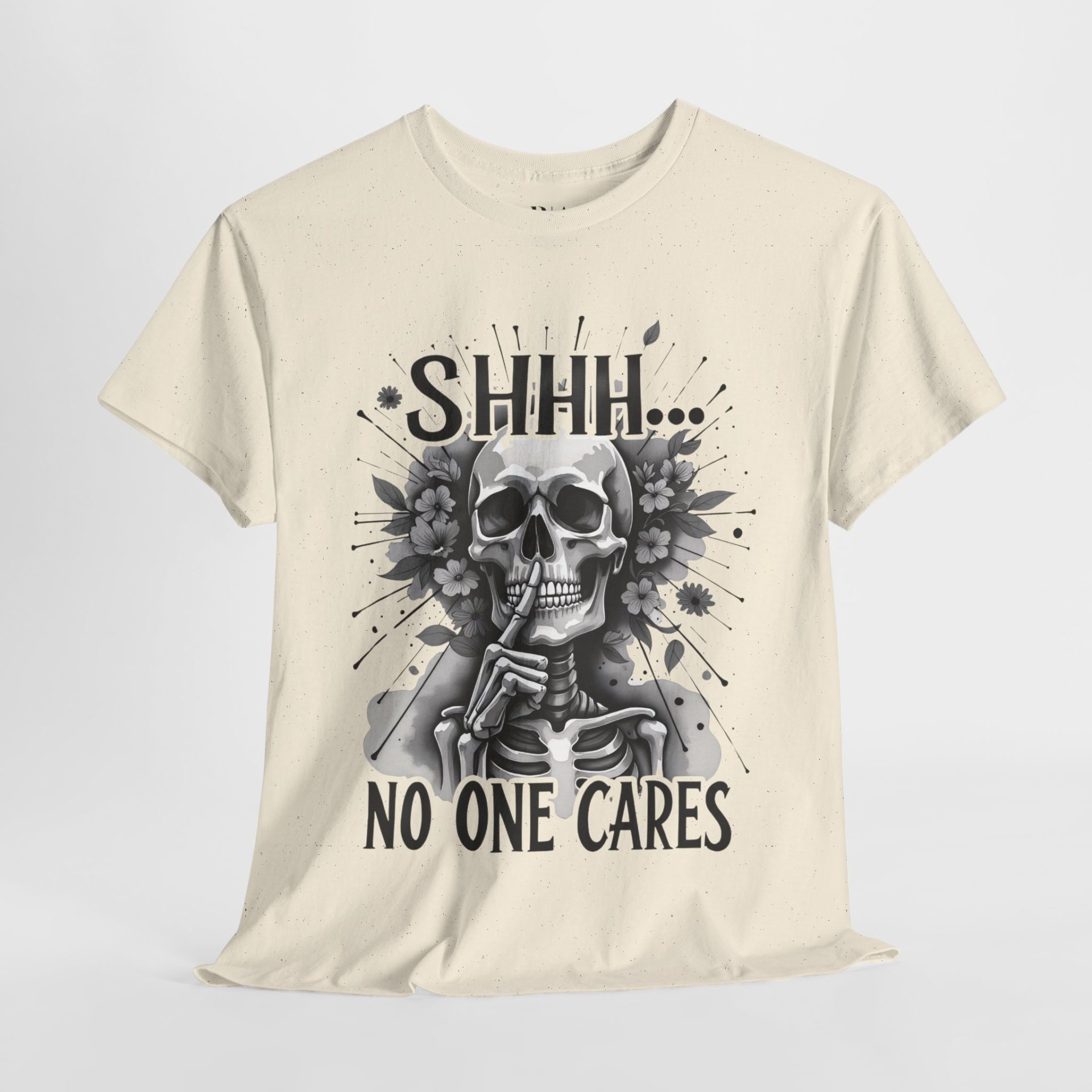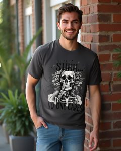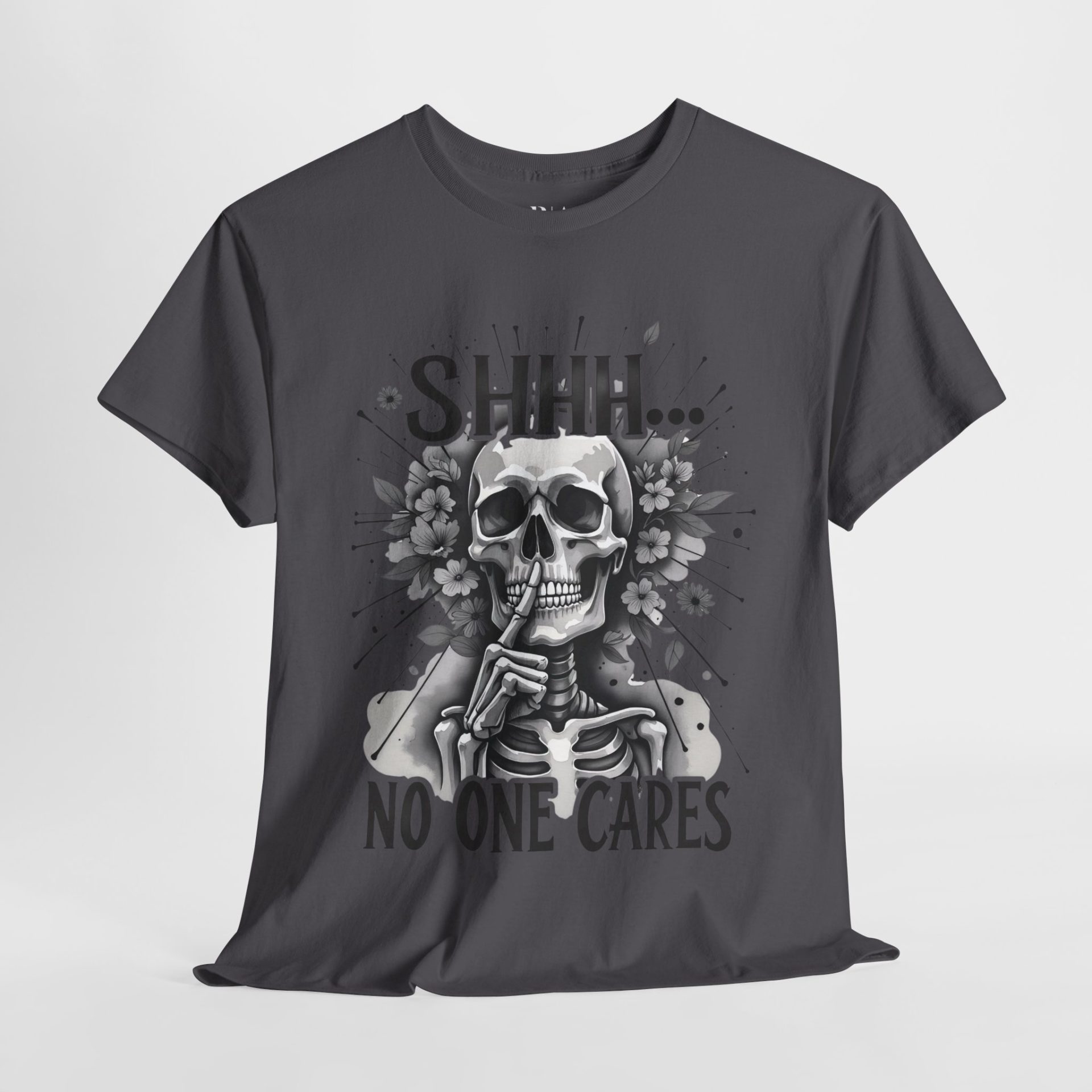 The “Eternal Indifference” t-shirt delivers a bold, tongue-in-cheek message with its striking monochrome design. At the center, a detailed skeleton holds a finger to its lips in a classic “shhh” gesture, surrounded by blooming flowers and radiating lines for dramatic effect. Above and below, the text reads: “SHHH… NO ONE CARES,” perfectly capturing a mood of timeless apathy and sardonic humor. Made from 100% cotton and available in multiple colors, this tee is ideal for those who appreciate dark wit and a laid-back attitude