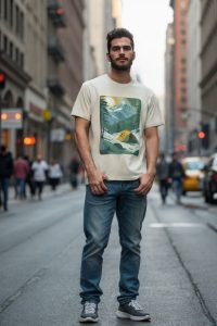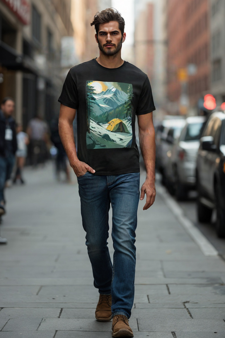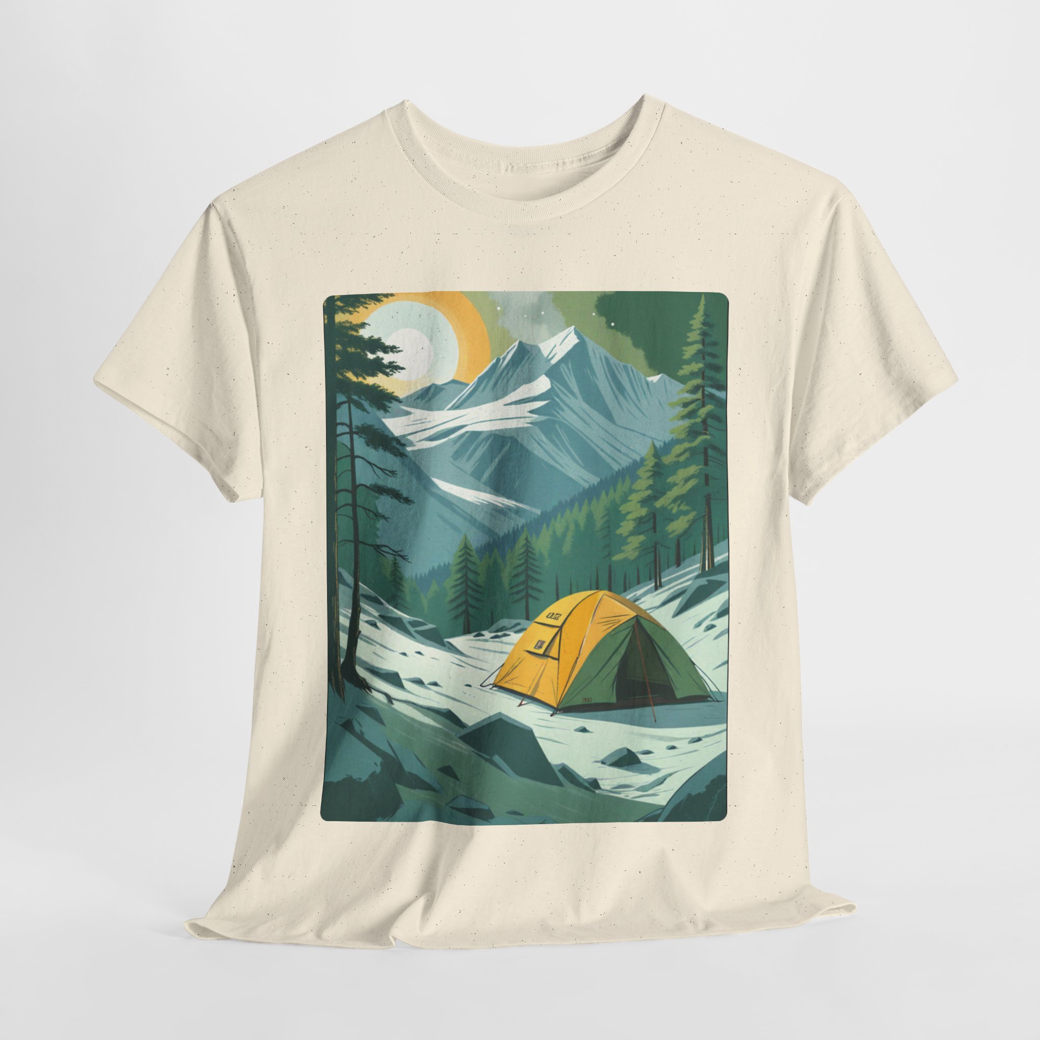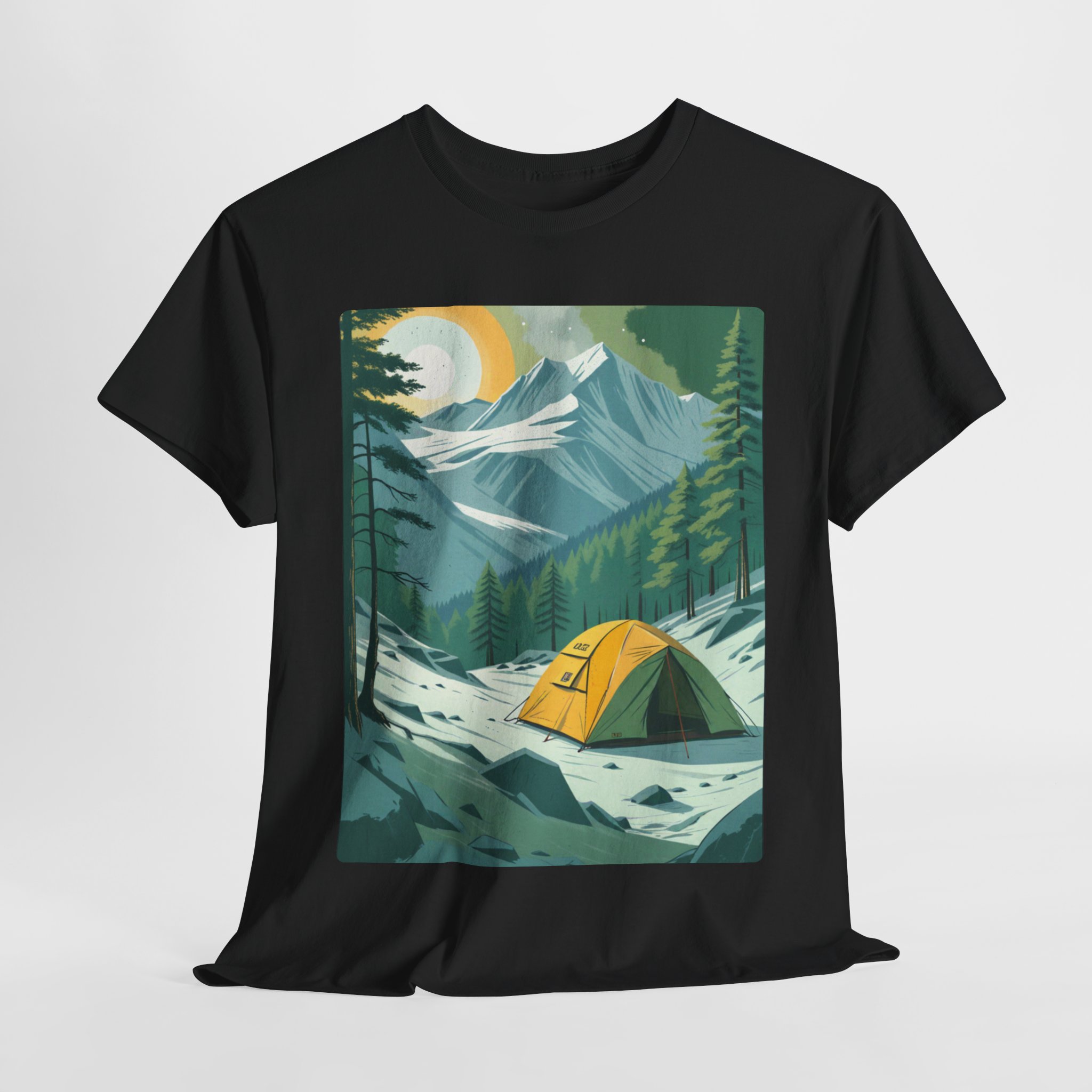 Escape to the great outdoors with the “Evergreen Forest Camp” T-shirt. Featuring a vibrant illustration of a cozy campsite nestled amidst lush pine trees, snowy terrain, and majestic mountain peaks under a glowing sun, this design captures the serenity of nature. Perfect for adventurers and outdoor enthusiasts, this T-shirt combines comfort and style for your next journey.