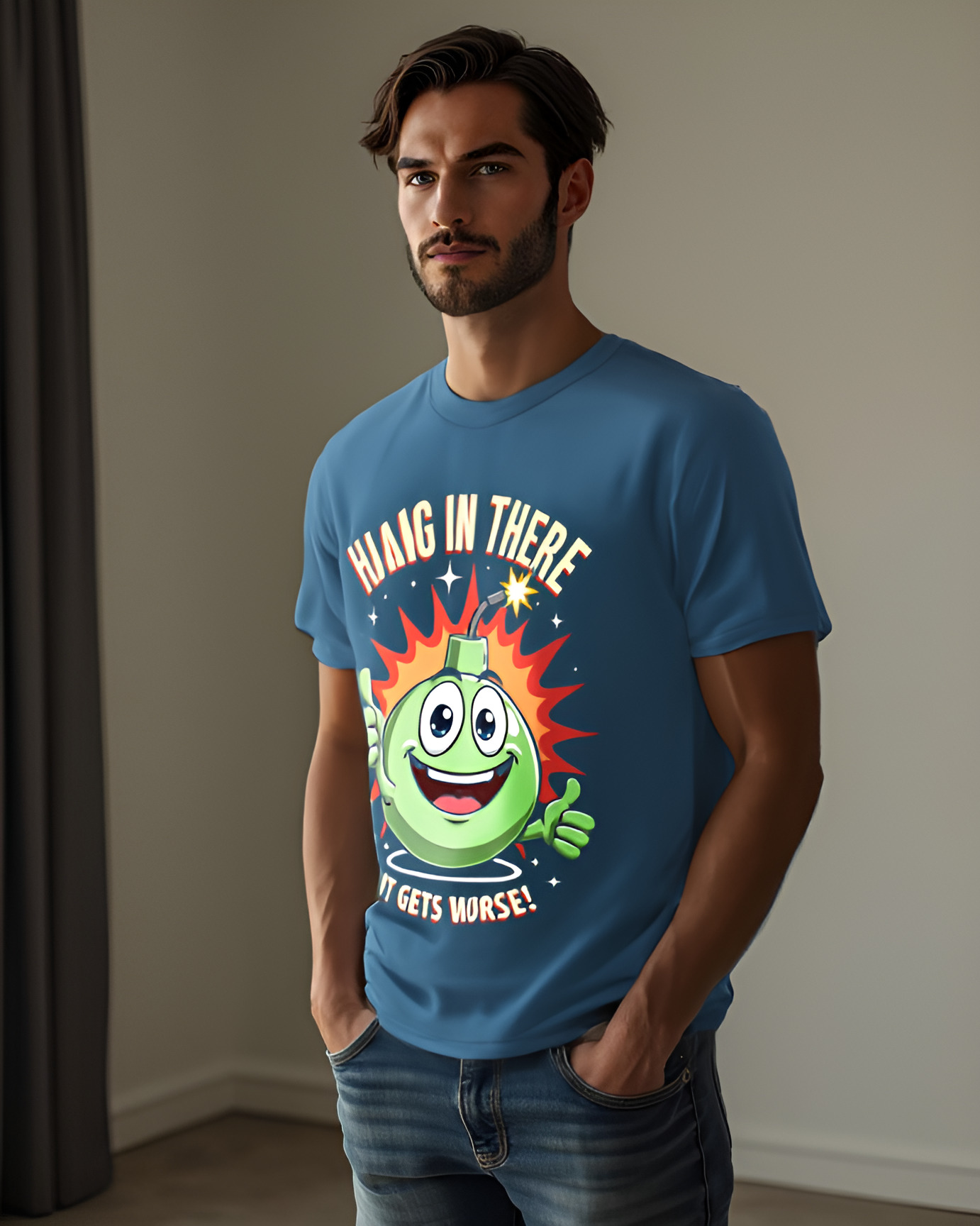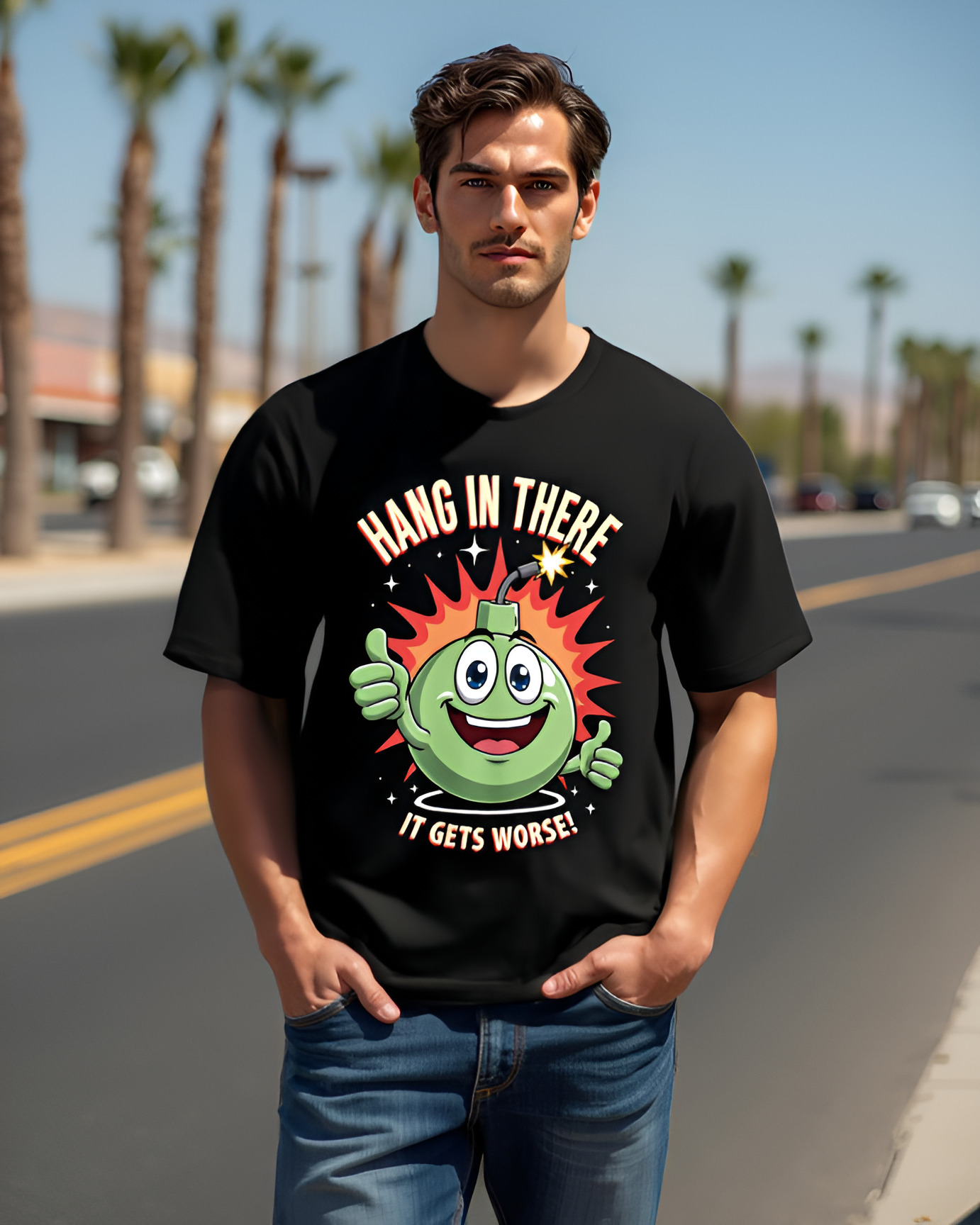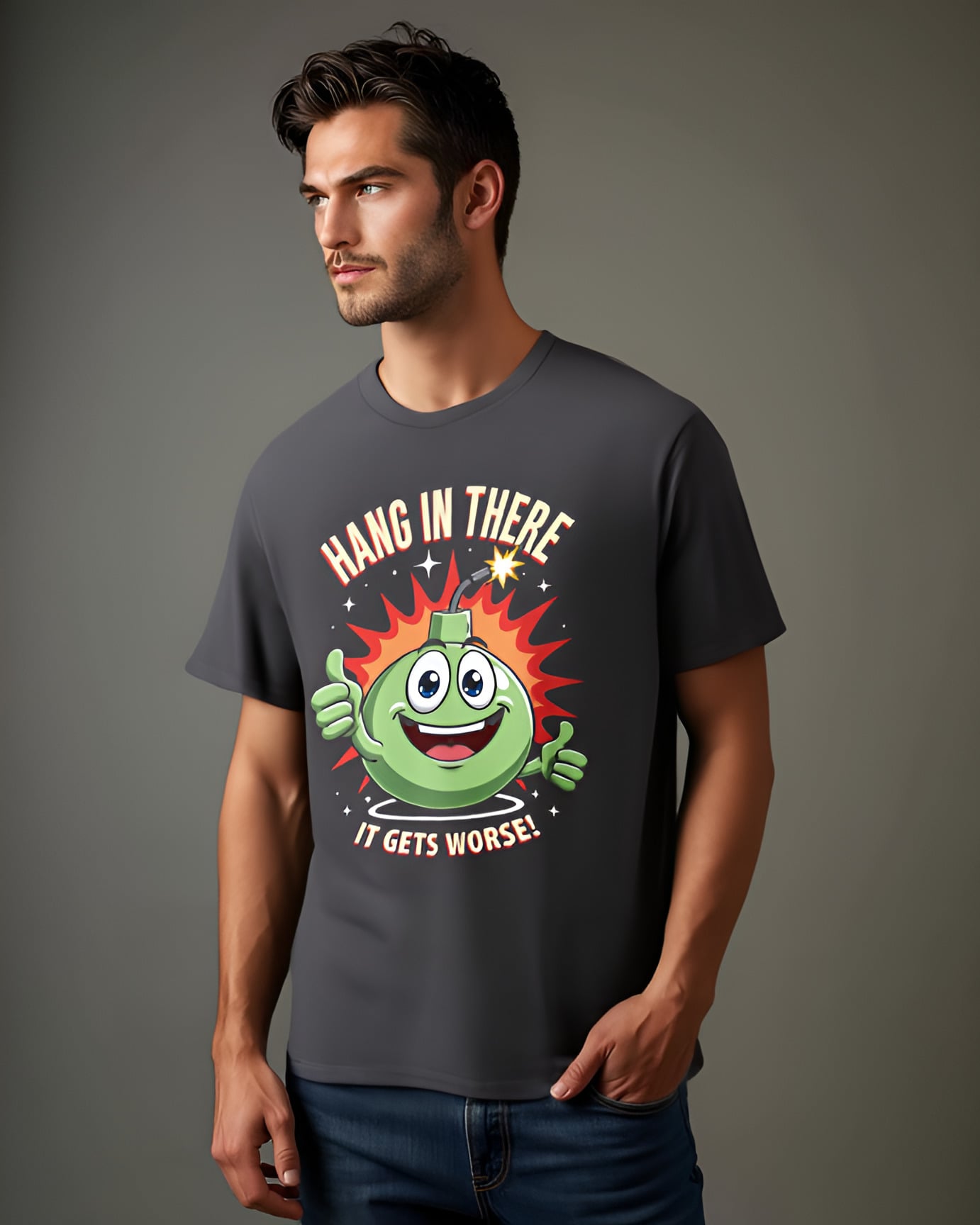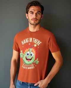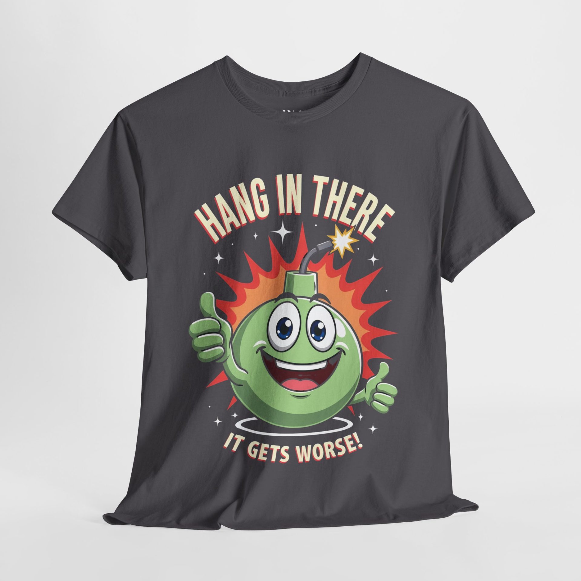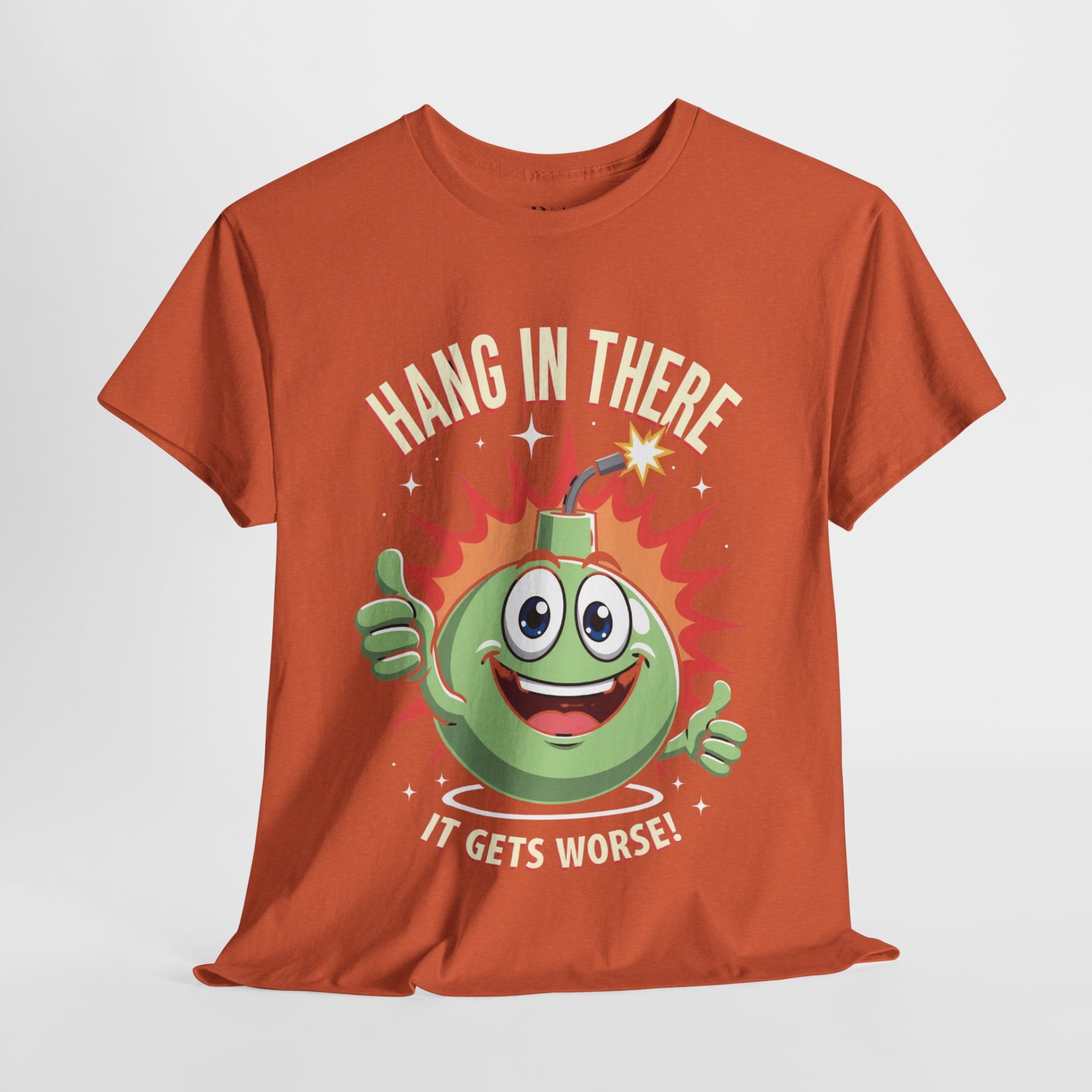 Add a spark of humor to your wardrobe with the Explosive Encouragement T-shirt! This quirky tee showcases a cheerful cartoon bomb giving double thumbs-up alongside the hilariously cheeky message, “Hang in there, it gets worse!” Perfect for fans of dark comedy, it combines sarcasm and motivation with a playful twist. Crafted from 100% cotton for all-day comfort and available in a range of colors, this shirt is your go-to for turning heads and sparking laughs. Get ready to wear your sense of humor in style!