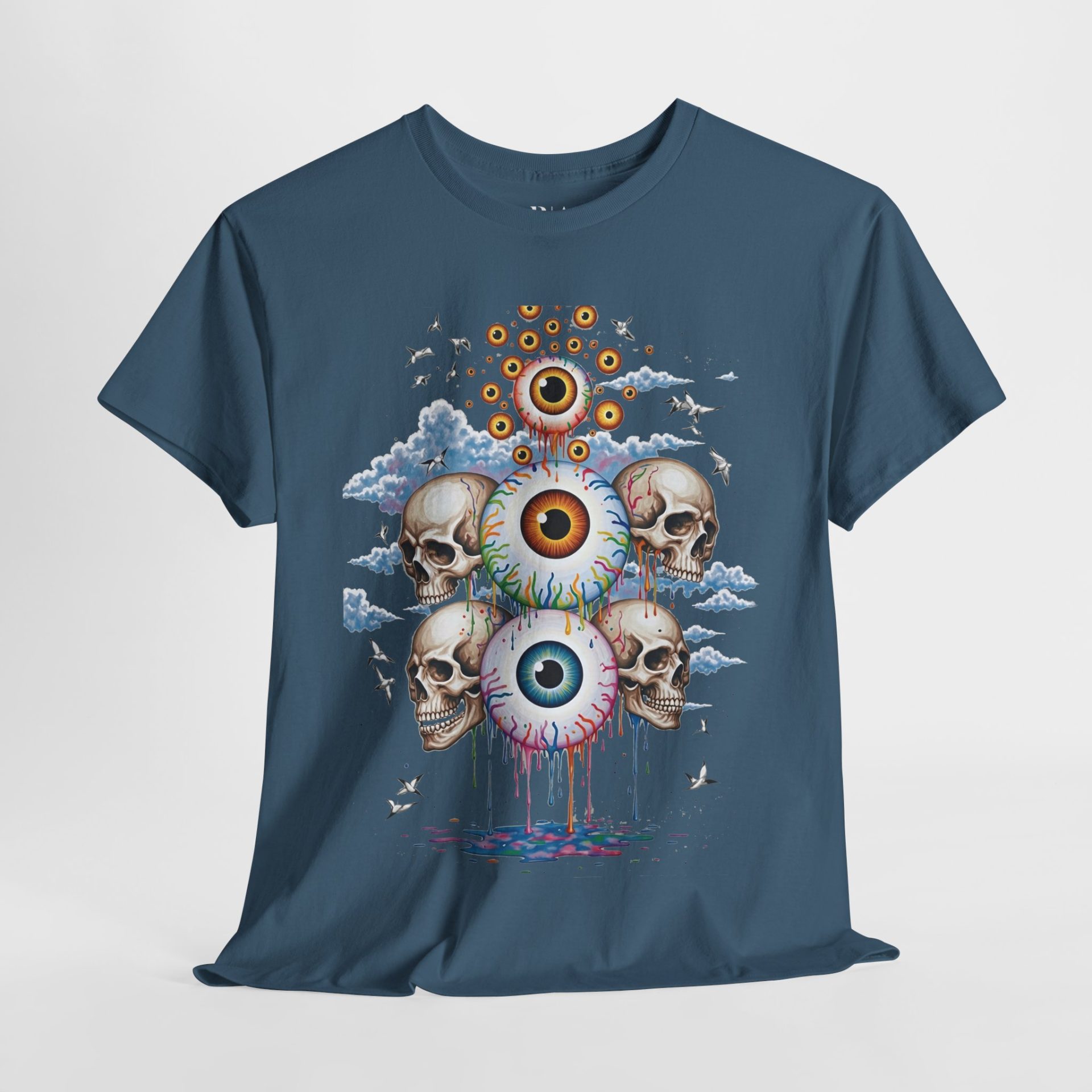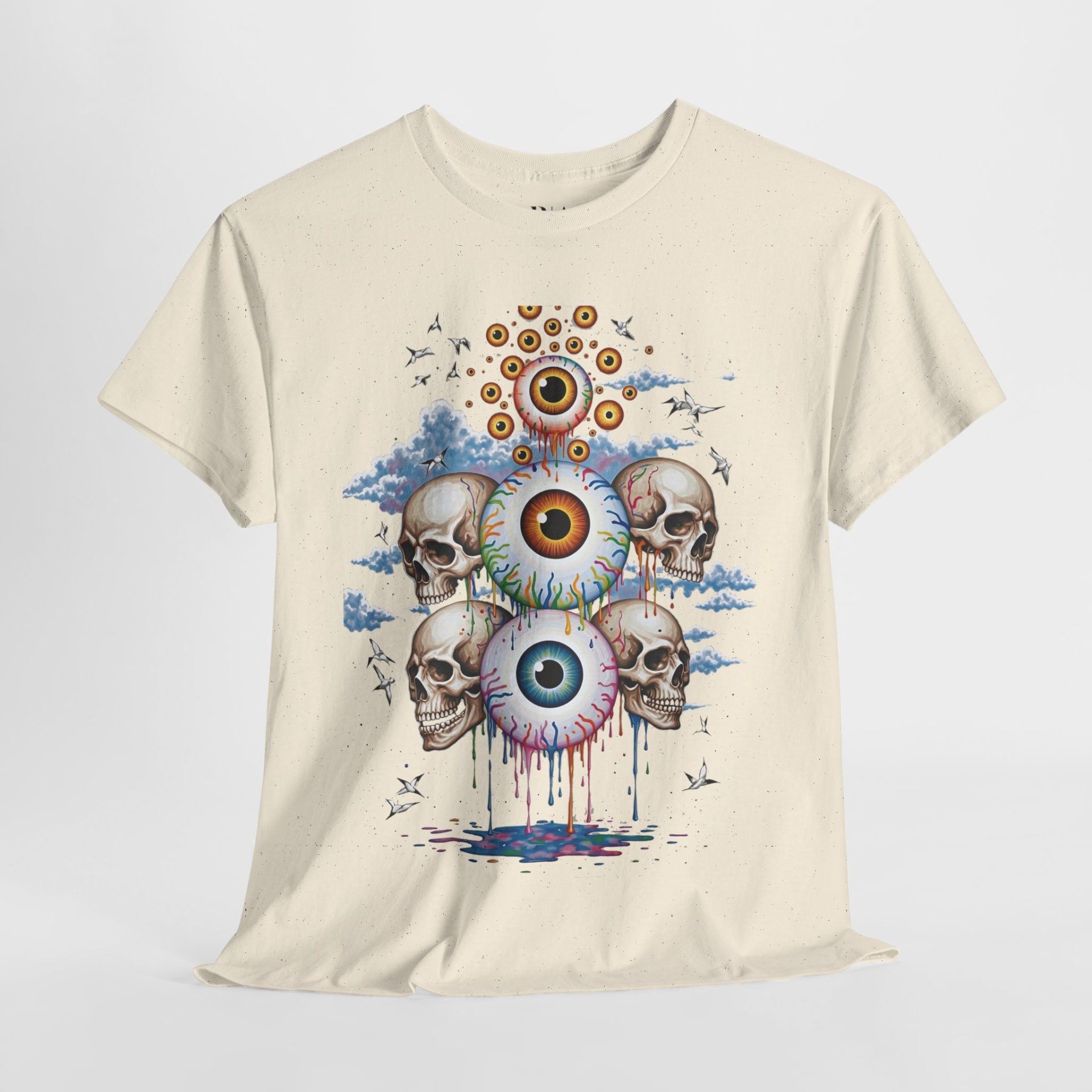 Peer beyond the veil with the “Eyes of the Afterlife” T-shirt. This mesmerizing design features a cascade of hyper-detailed, colorful eyeballs and skulls set against drifting clouds and soaring birds, creating a surreal vision that blends the mysterious with the ethereal. The vibrant artwork is printed on 100% cotton for lasting comfort and breathability, and the tee is available in multiple colors to match your style. Perfect for those drawn to bold, imaginative art and the mysteries that lie beyond this world
