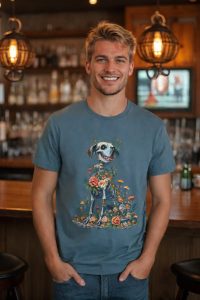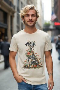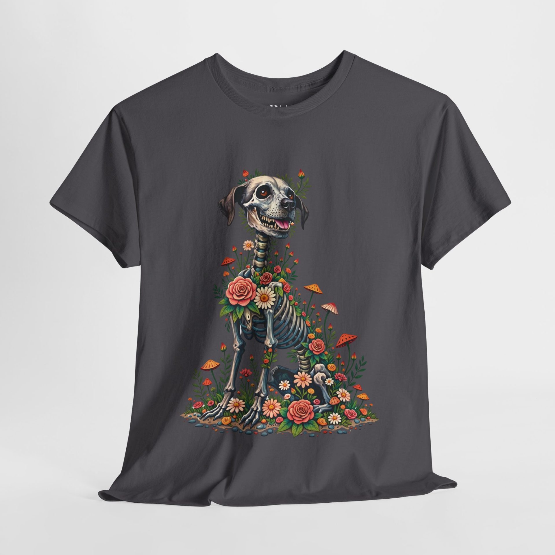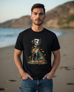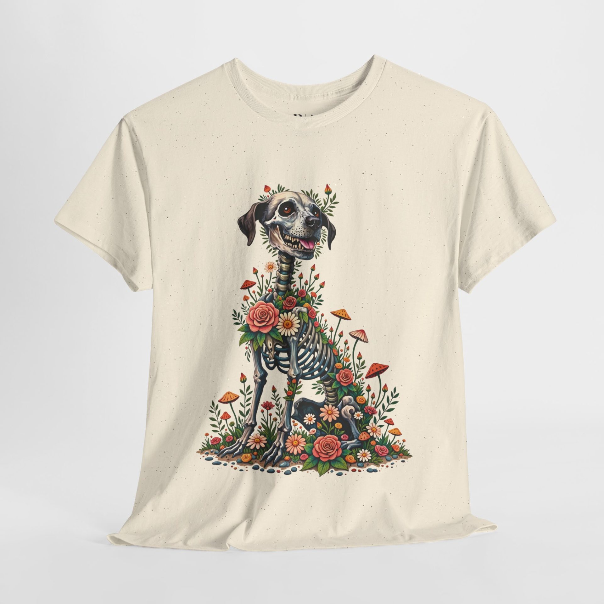 Celebrate the beauty of life and memory with the Fur-ever in Bloom t-shirt. This unique design features a joyful dog with a whimsical skeletal motif, surrounded by vibrant flowers and mushrooms, symbolizing the cycle of life and everlasting love. Made from 100% cotton and available in multiple colors, this tee offers both comfort and a touch of artistic flair—perfect for animal lovers and free spirits alike.