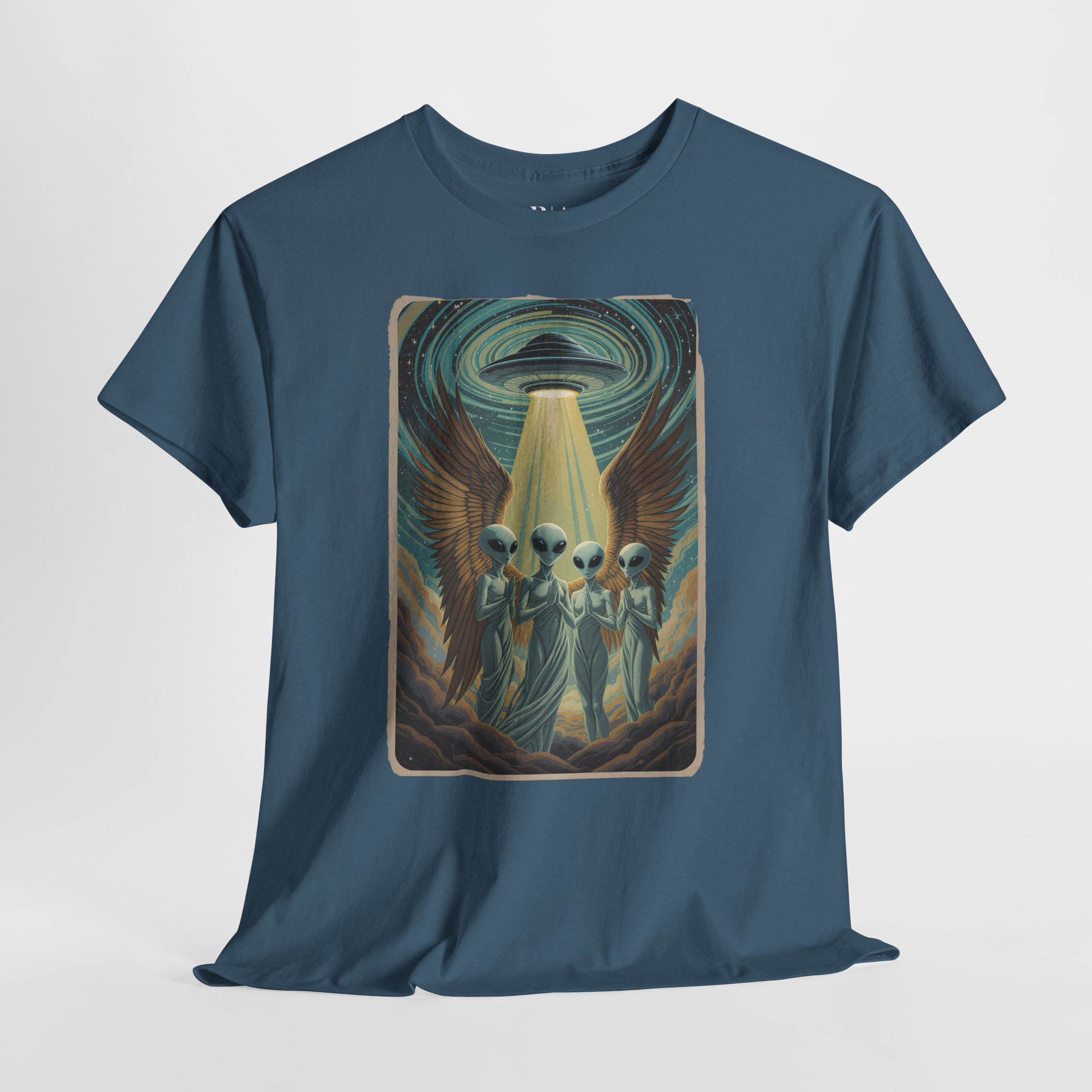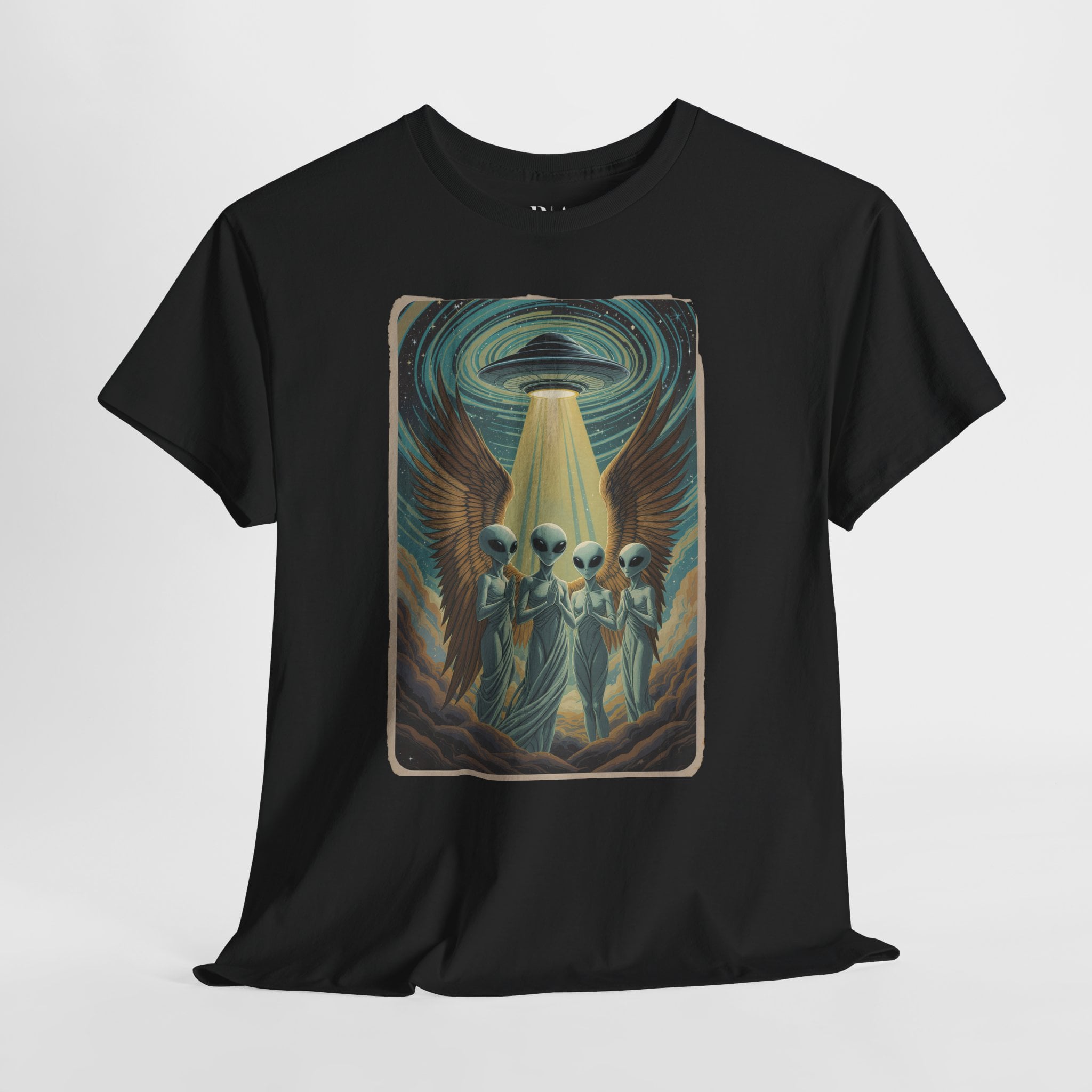 Ascend to the next dimension of style with the Galactic Cherubim tee, featuring ethereal winged aliens bathed in the glow of a descending UFO. Crafted from 100% soft cotton and available in multiple colors, this otherworldly graphic shirt is perfect for sci‑fi fans, stargazers, and anyone who loves a little cosmic mystery in their wardrobe.