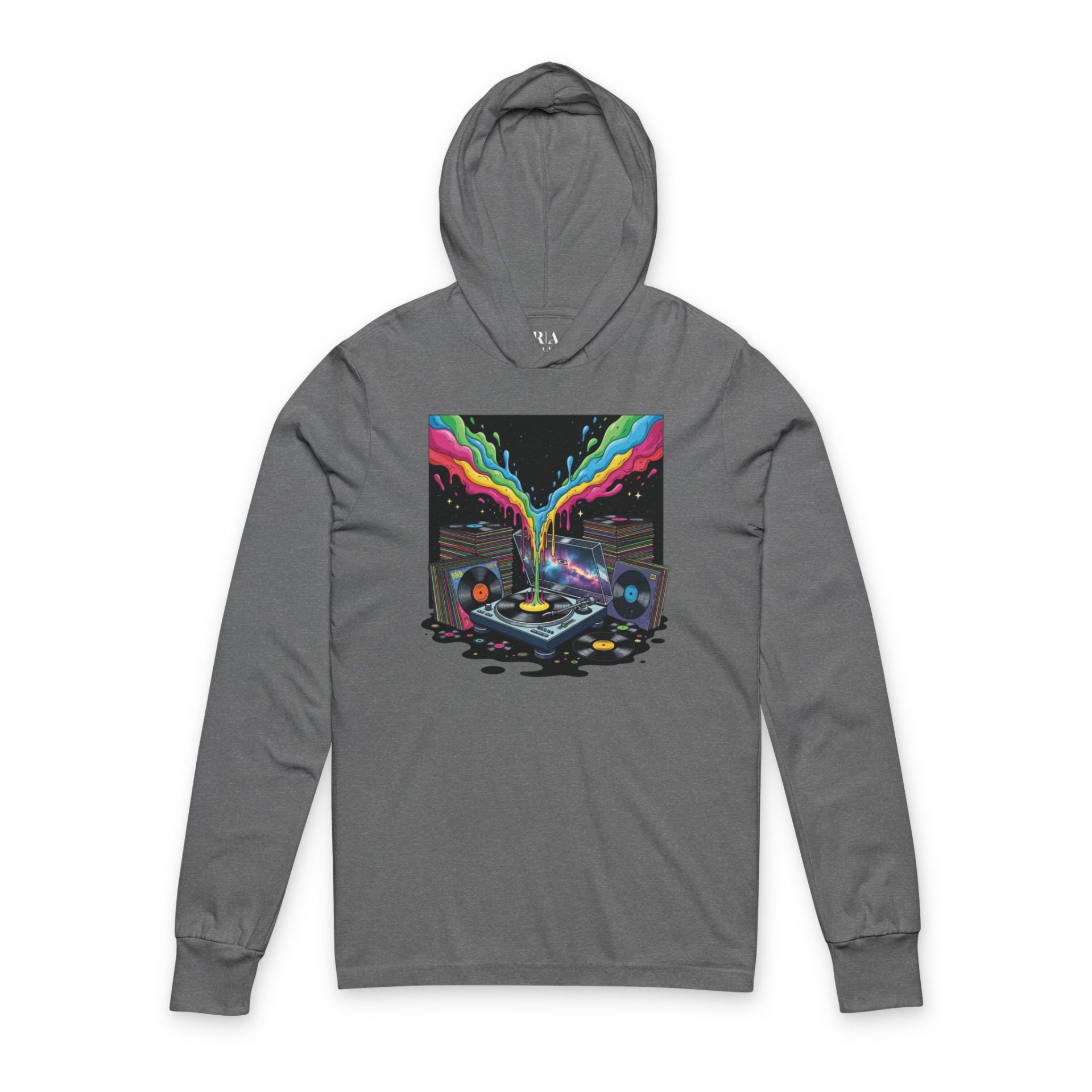 Is your playlist basically a launch sequence? Then Grooves of the Galaxy is for you. This 100% cotton long-sleeve hooded tee features rainbow sound waves erupting from a turntable into deep space. Slip it on in your favorite color and let everyone know your records don’t just spin—they orbit.