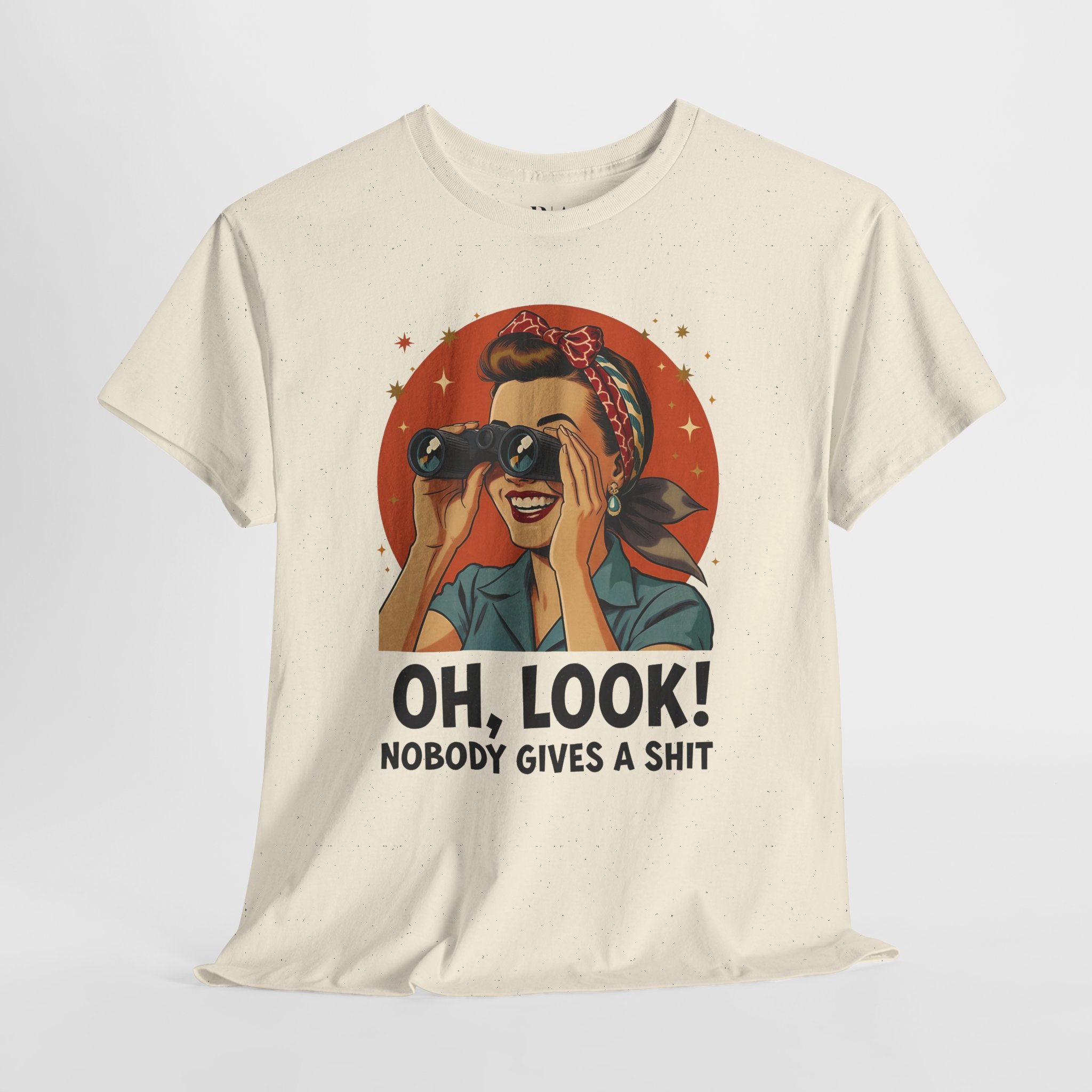 Serve vintage attitude with the Headscarf and Hot Takes tee. This 100% cotton shirt pairs a retro pin‑up style heroine peering through binoculars with a perfectly blunt “Oh, look! Nobody gives a shit” caption. Soft, comfy, and available in multiple colors, it’s ideal for anyone whose tolerance for drama is permanently set to zero.