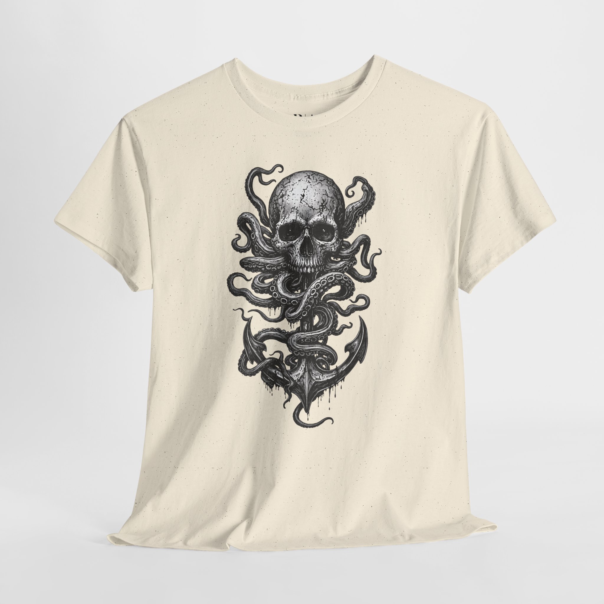 Summon the kraken every time you get dressed with the Maritime Menace tee. This 100% cotton shirt features a swirling tangle of tentacles wrapped around a weathered diving helmet and dripping anchor, all in stark black-and-white detail. Soft, breathable, and available in multiple colors, it’s perfect for sea dogs, horror fans, and anyone who prefers their nautical aesthetic a little ominous.