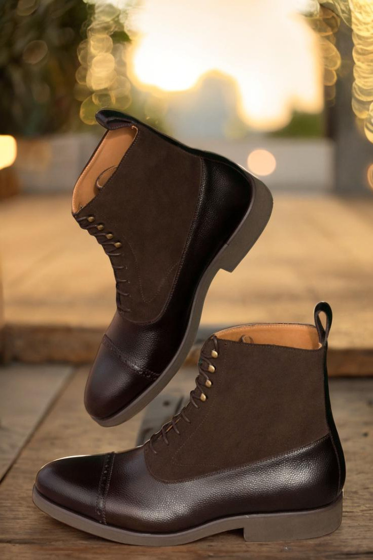 The vamp is made of luxurious dark brown pebble grain leather, adding a touch of elegance to the overall design. The tongue and toe cap are painted in the same shade, giving the boots a sleek and polished look. The quarter is made from rich dark brown luxe suede, adding a luxurious texture to the mix. To tie it all together, a back stripe in dark brown pebble grain leather adds a unique touch.
