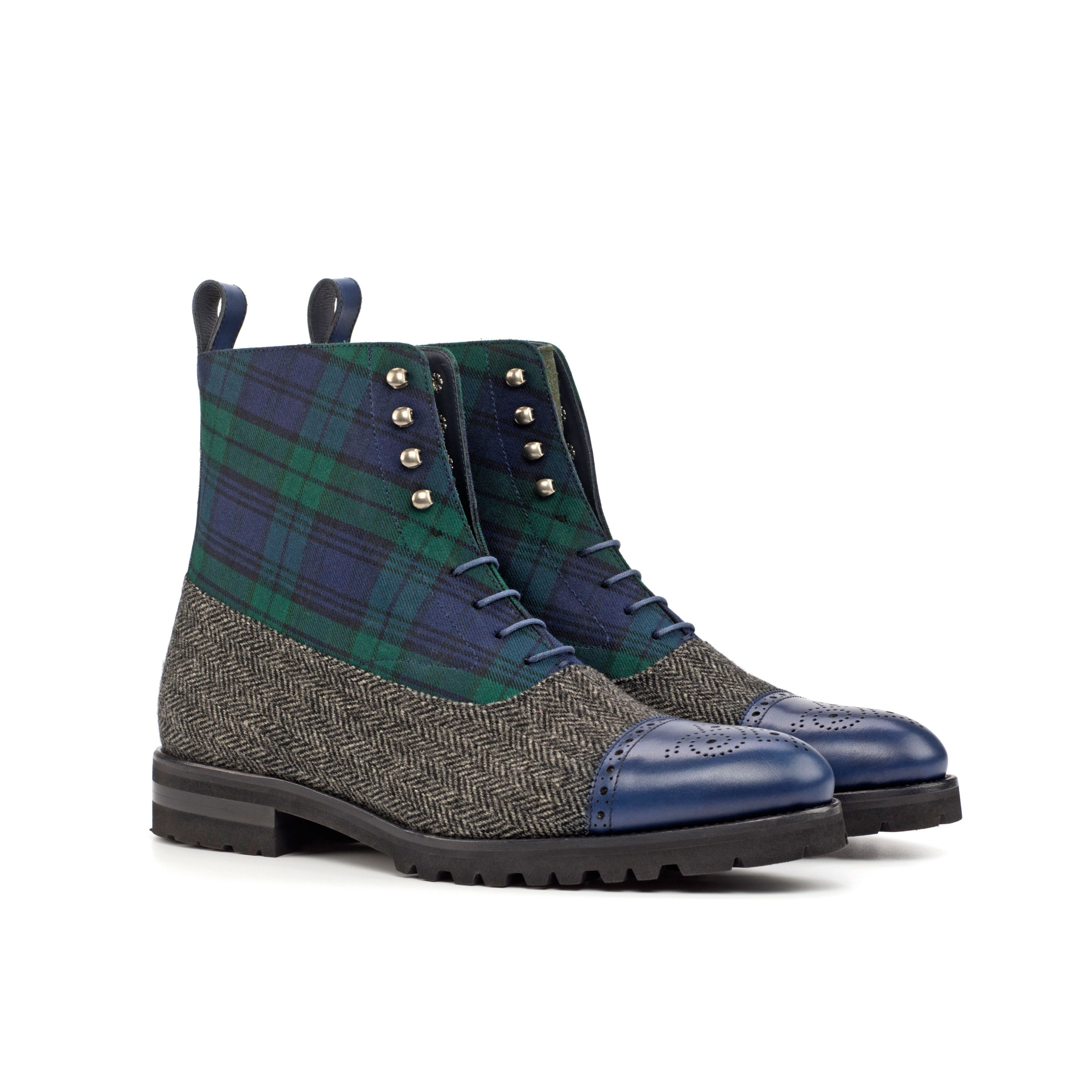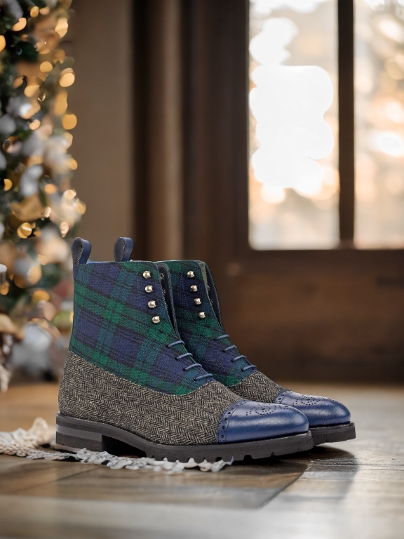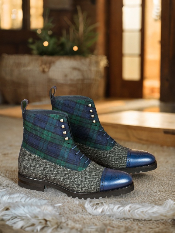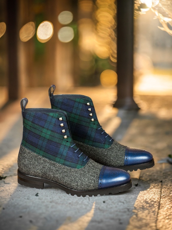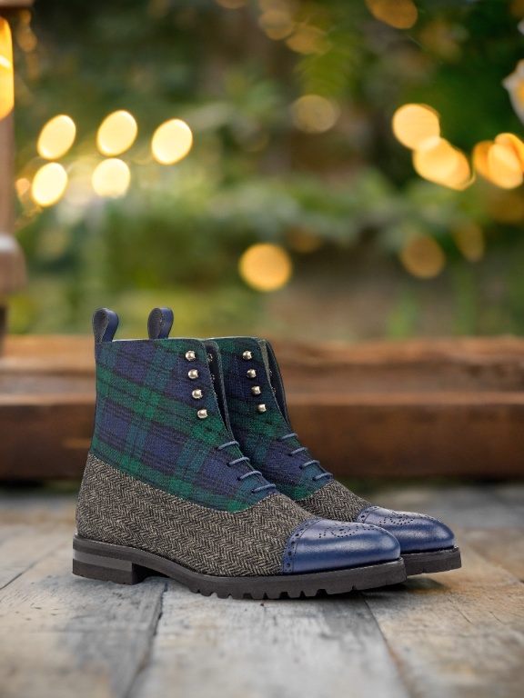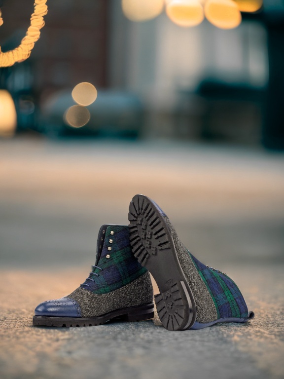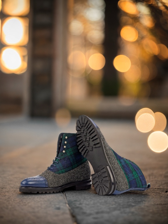 The vamp of the boot is made with a classic herringbone wool, giving it a sophisticated and timeless look. And the green flannel tongue adds a pop of color and personality to this sleek boot. The quarter features a bold and striking Blackwatch wool, making a statement wherever you go.