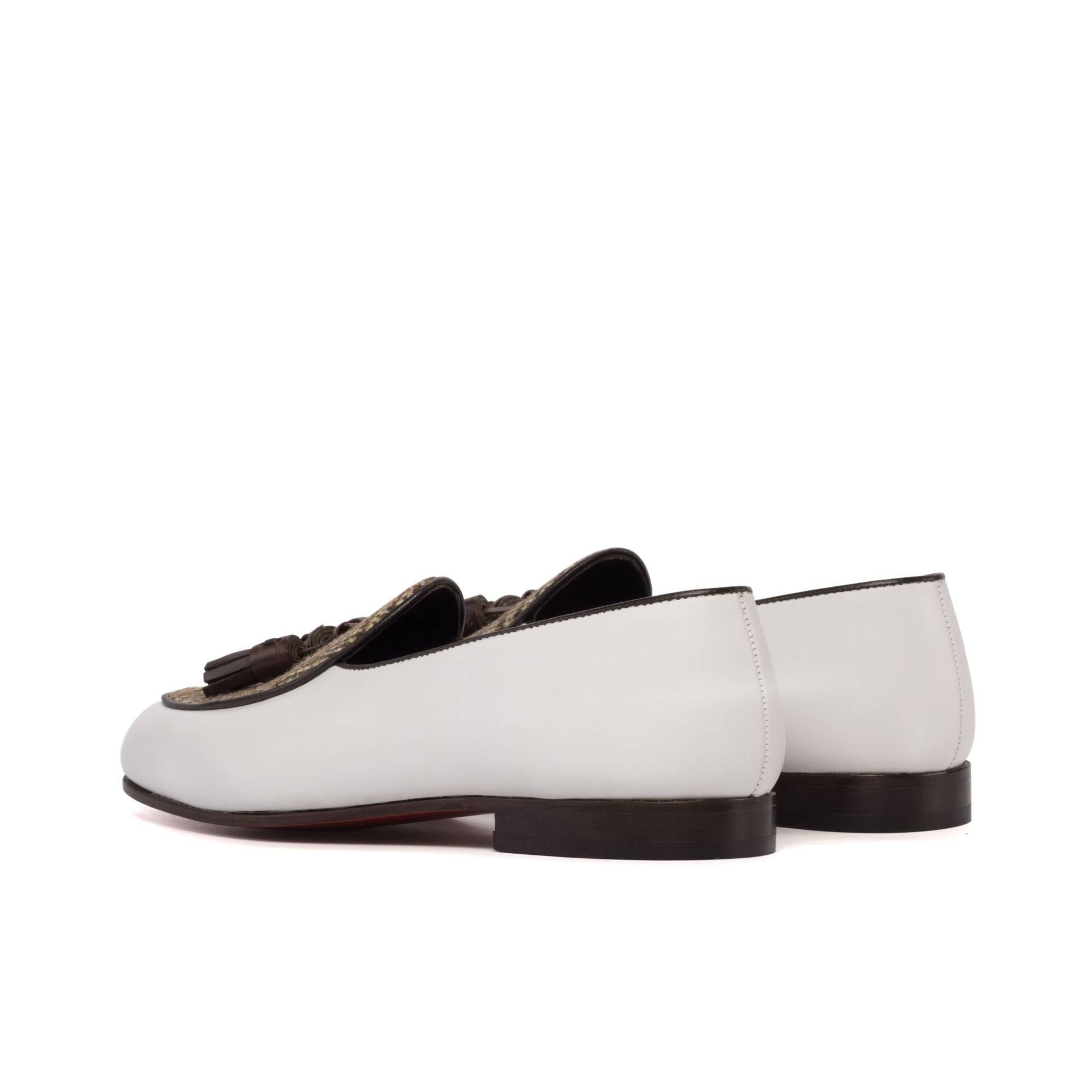The base of this loafer is made from high-quality white box calf leather, providing a clean and polished foundation for the exquisite design. The upper, or vamp, is crafted from a luxurious tweed wool, adding a touch of texture and warmth to the shoe.
