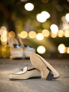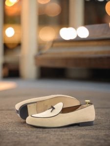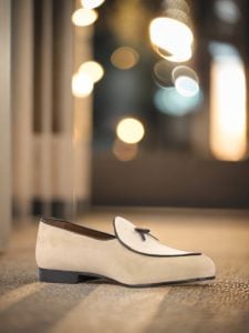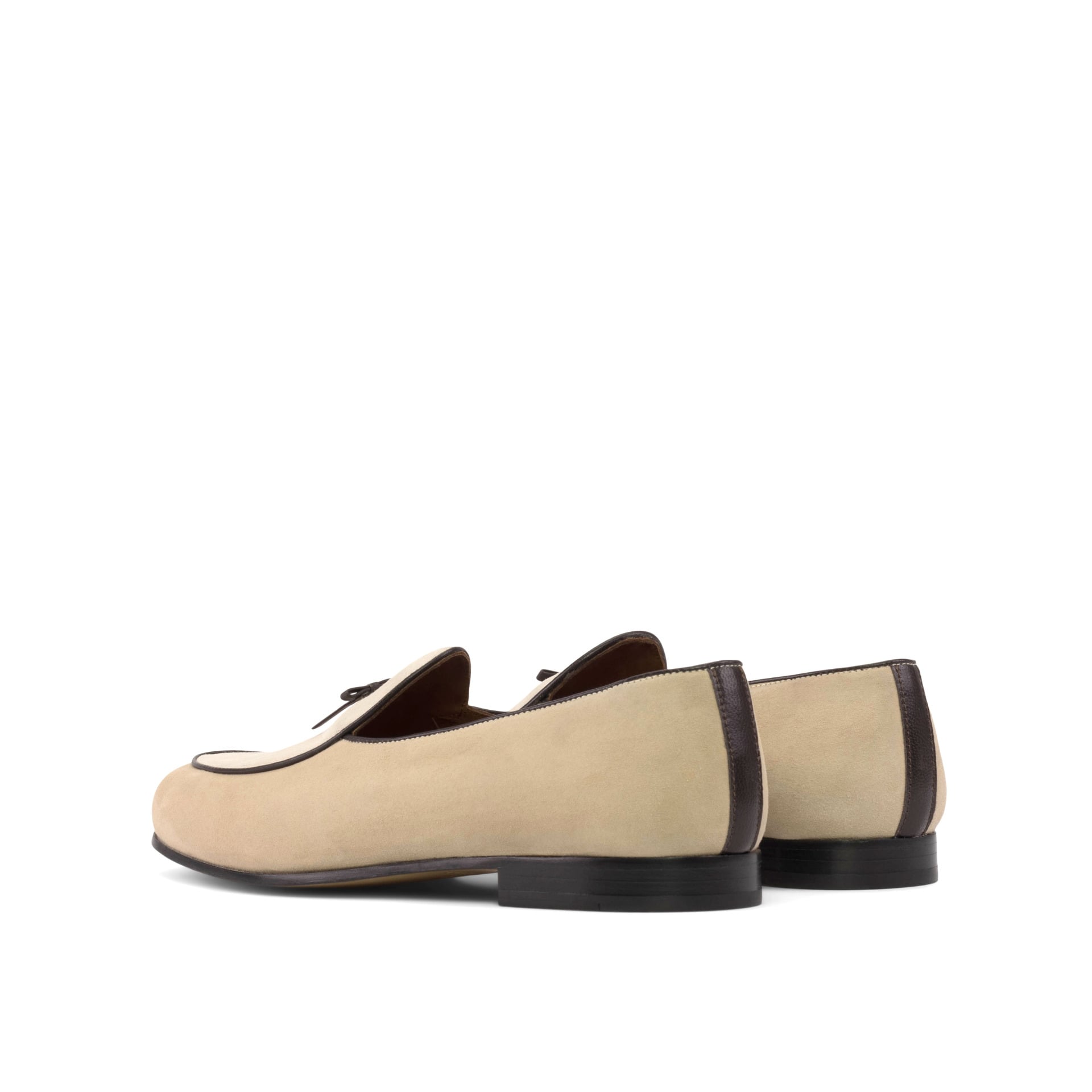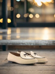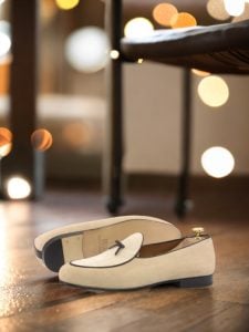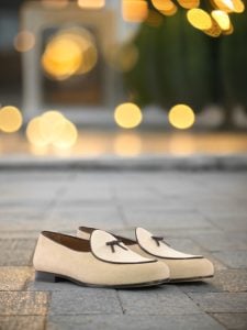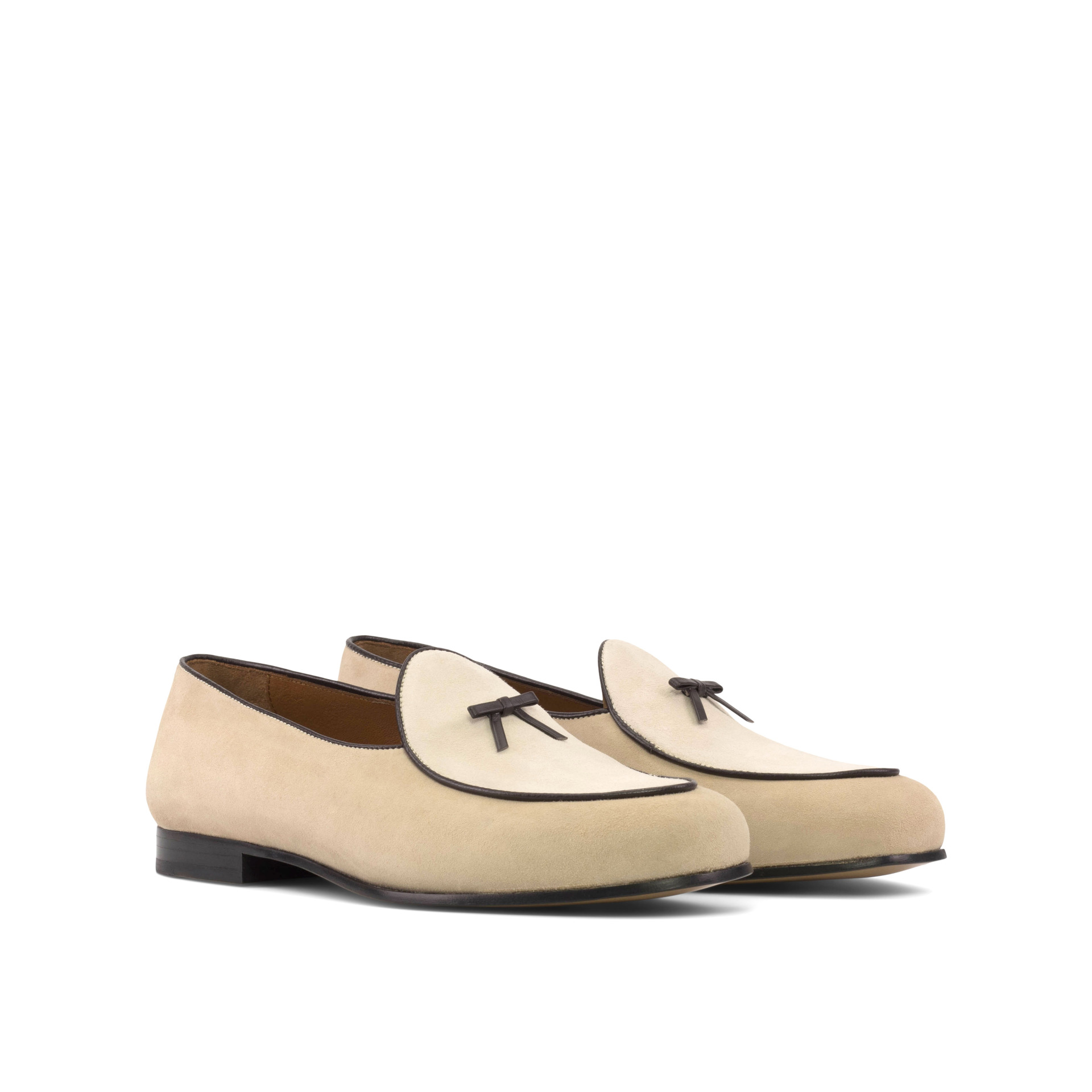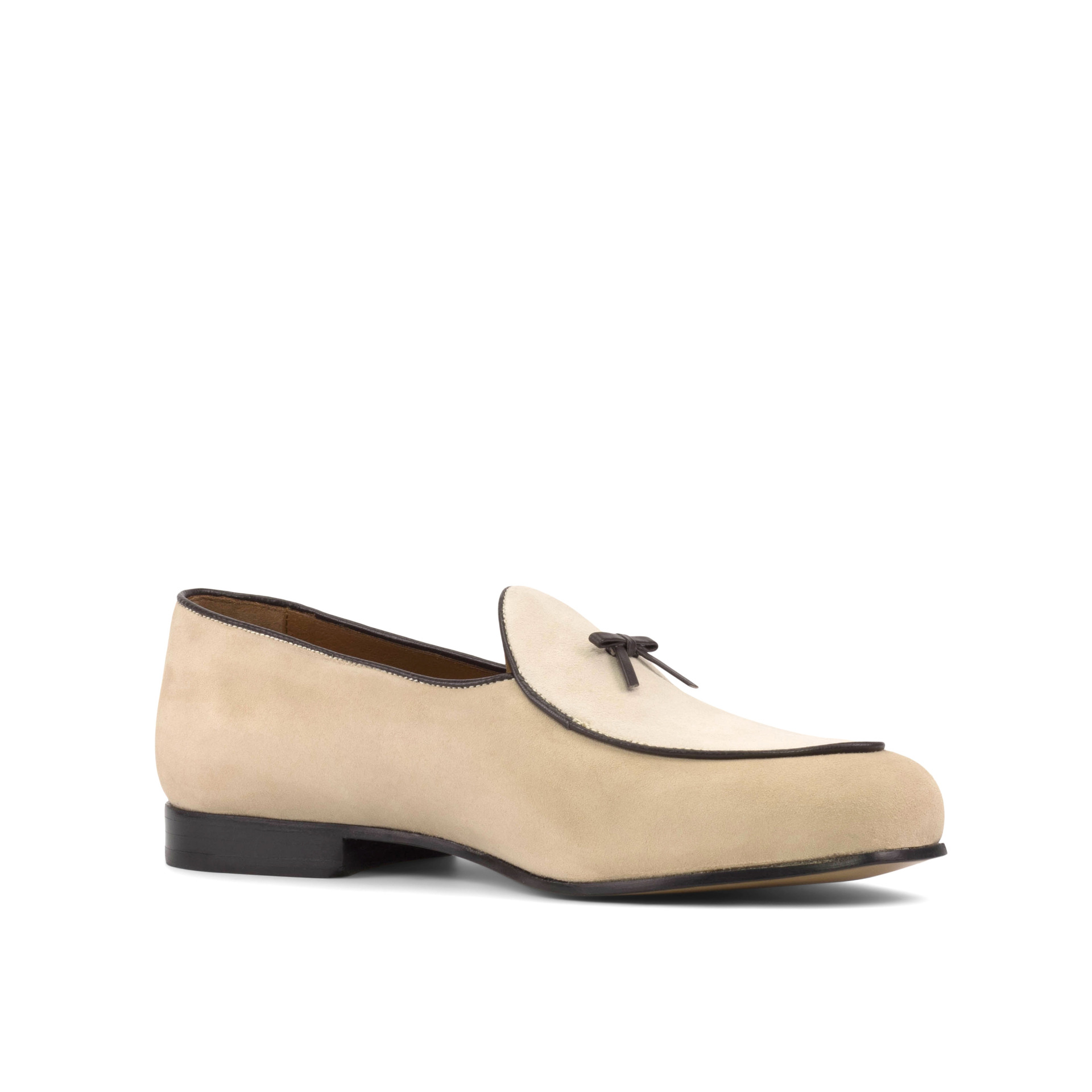 The base of this loafer is made from luxurious taupe kid suede, giving it a velvety soft feel. The upper and vamp are made from pristine ivory kid suede, adding a touch of purity to the overall look. To add some contrast and dimension, the trim and bow are made from rich brown nappa leather, giving the loafer a touch of boldness.