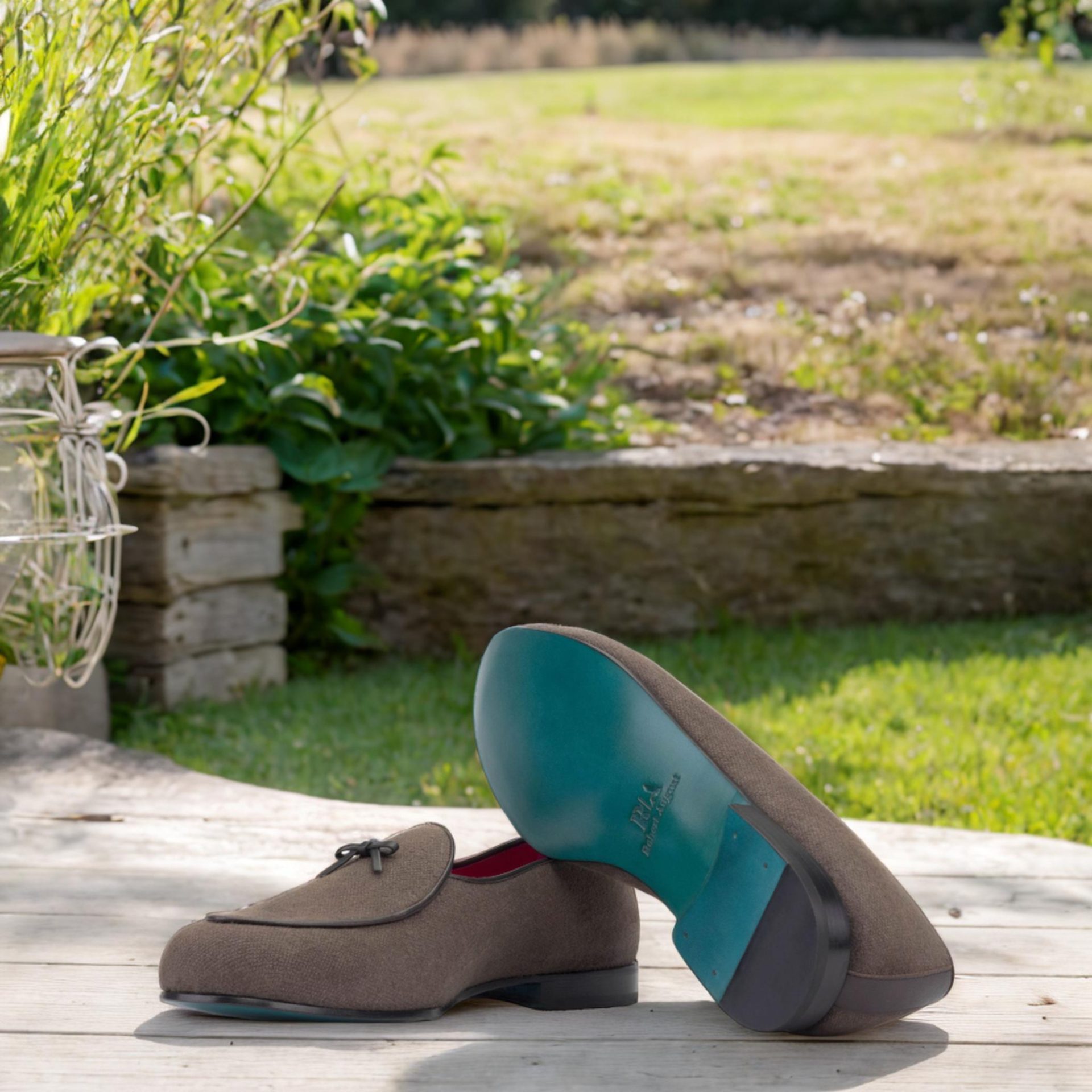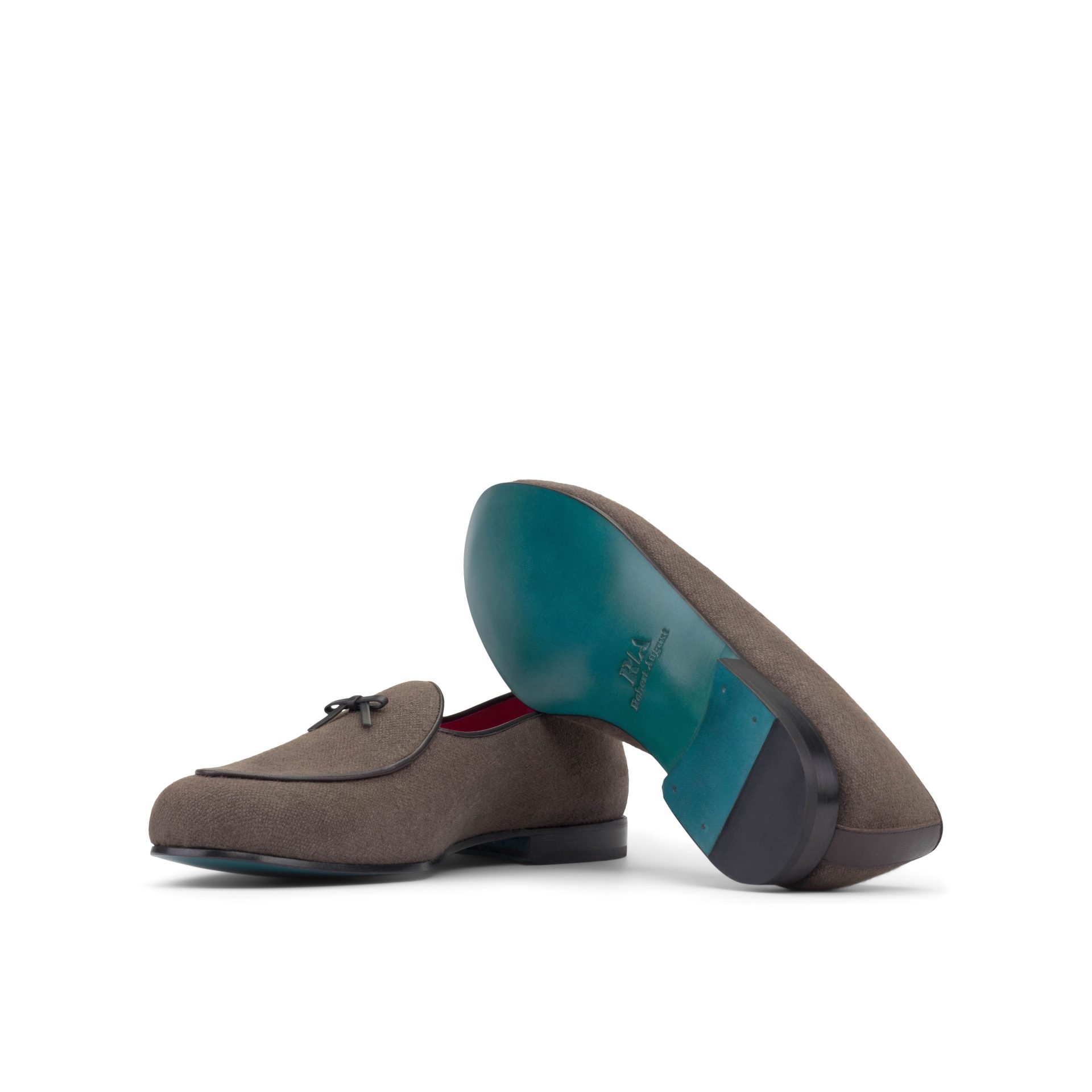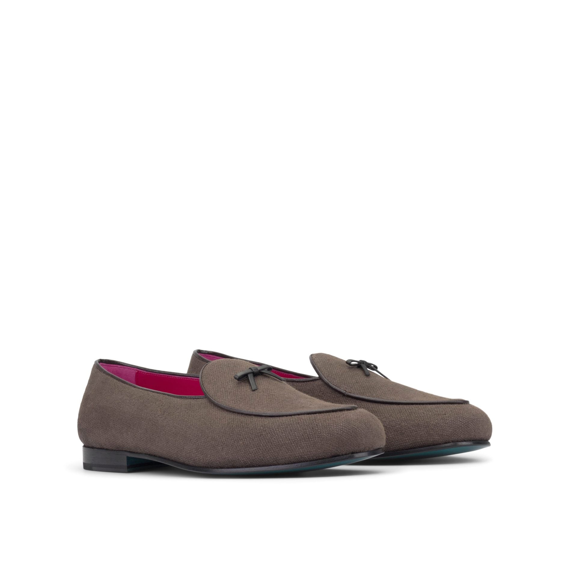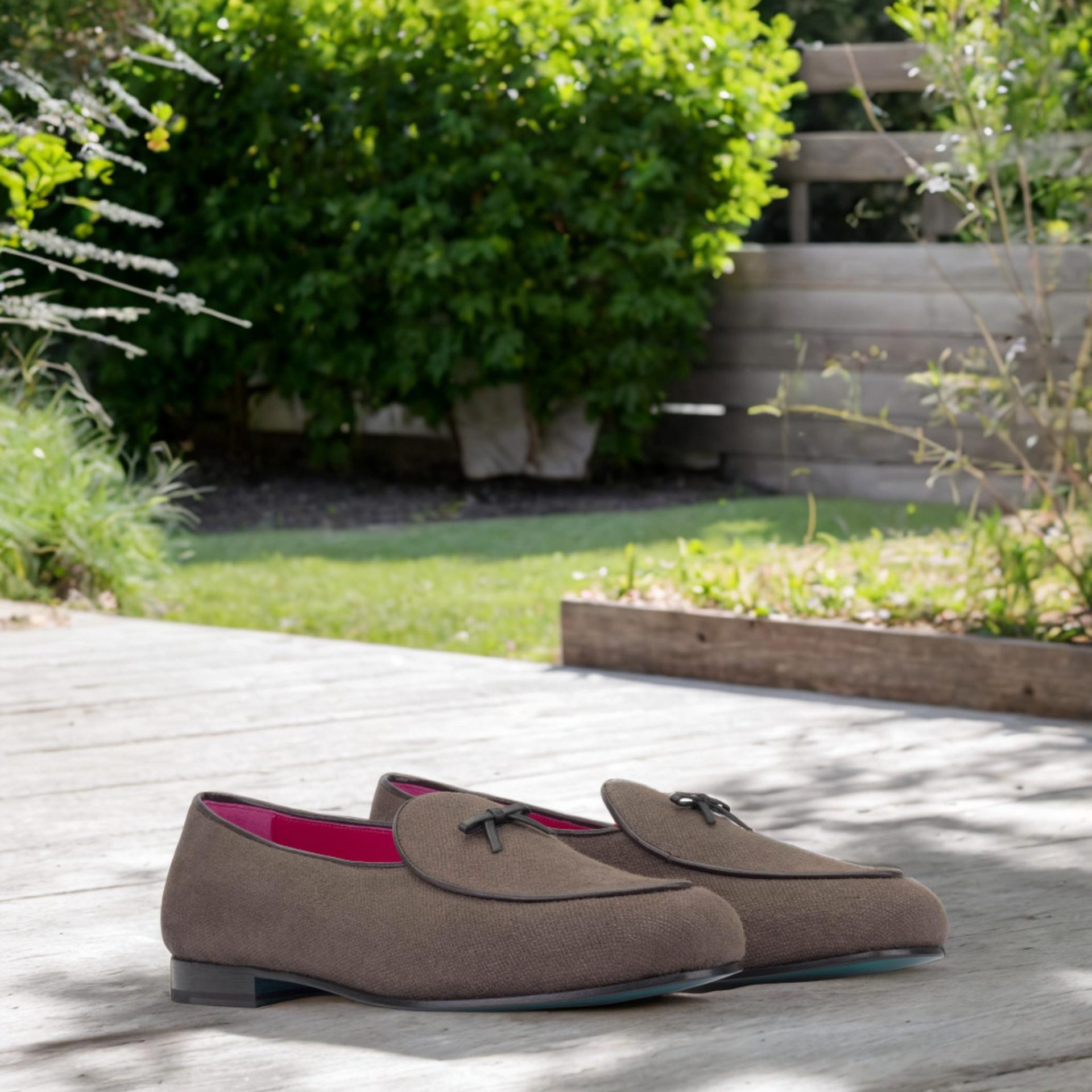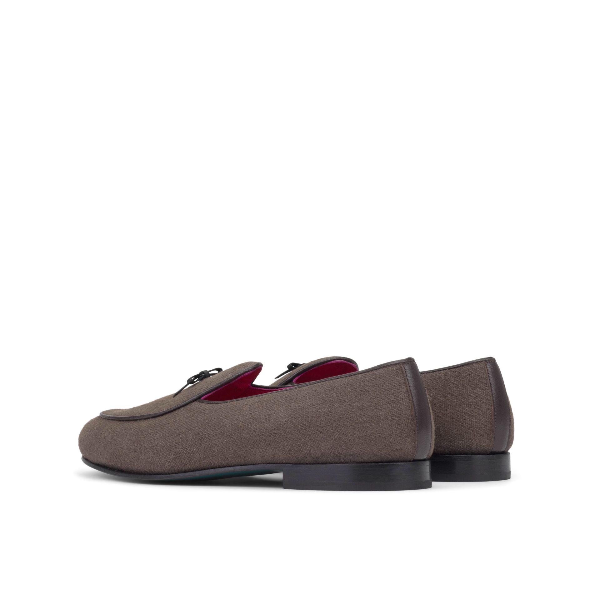 A defining feature of this loafer is its distinctive black painted calf bow. This element provides a sharp, polished focal point, contrasting effectively with the softer tones of the brown linen and leather. The bow is carefully constructed to maintain its shape, adding a touch of formal elegance to the shoe’s overall design.