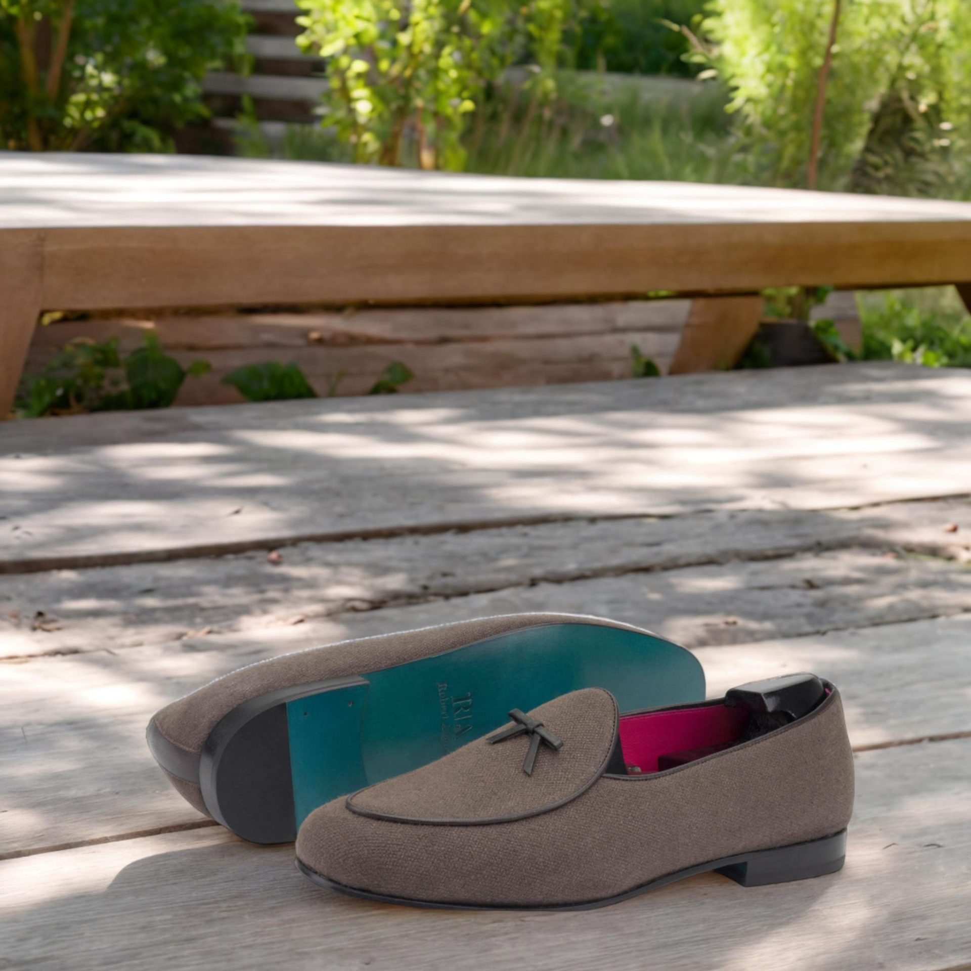 Complementing the linen is a trim and back crafted from soft brown Nappa leather. This high-quality leather adds structure and durability to the loafer, creating a subtle contrast in texture that enhances its visual appeal. The Nappa leather is known for its smooth, supple quality, which contributes to a comfortable fit around the heel and ankle, preventing rubbing and ensuring the shoe feels secure with every step.