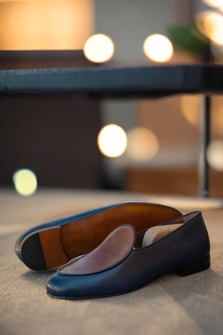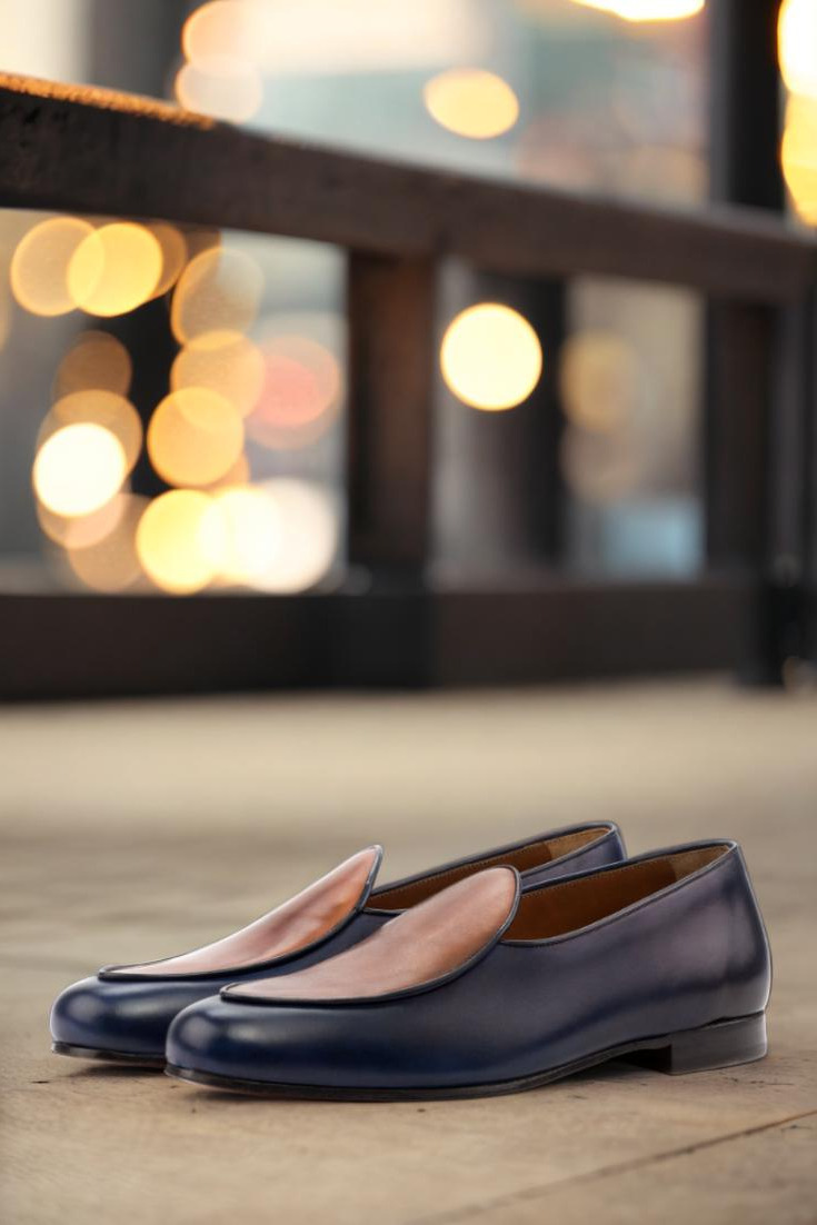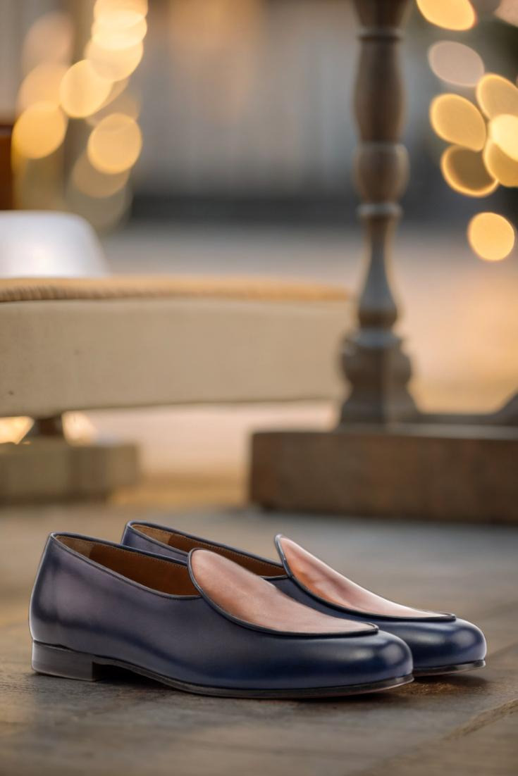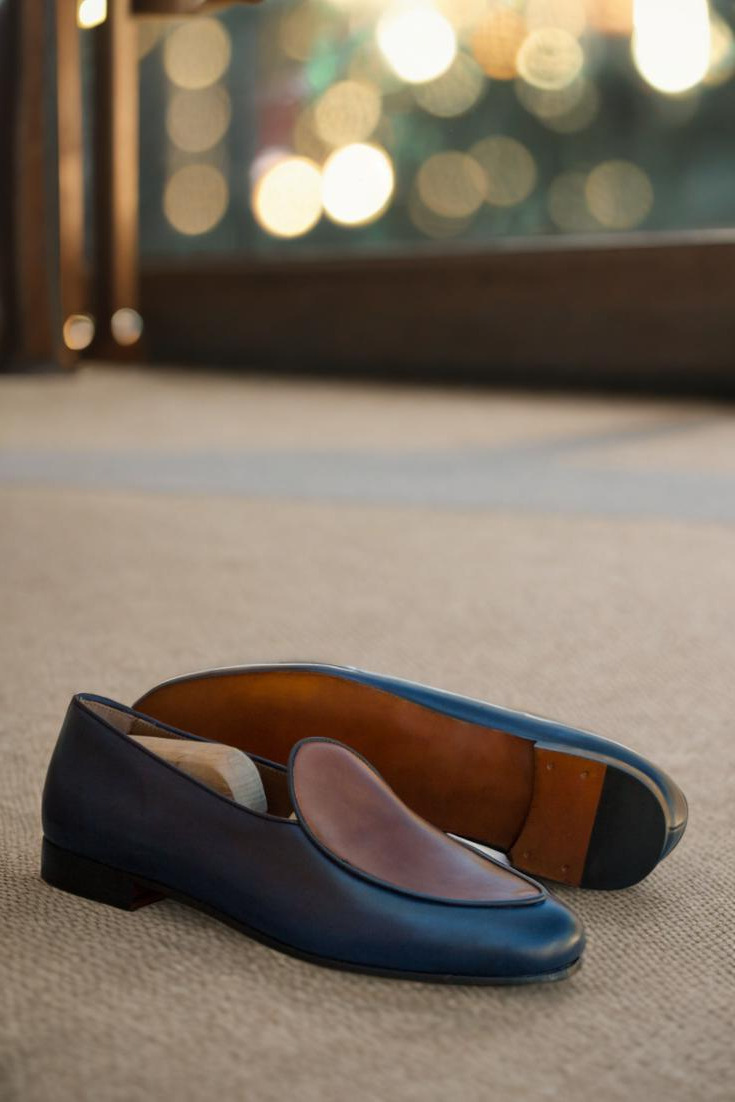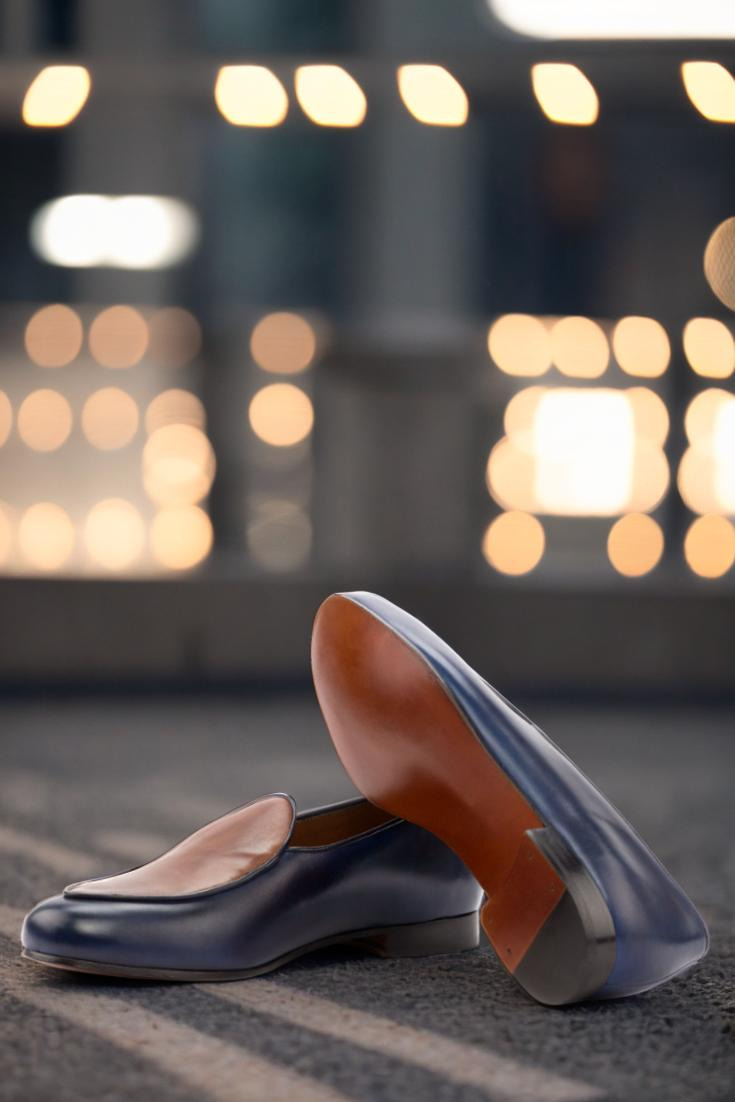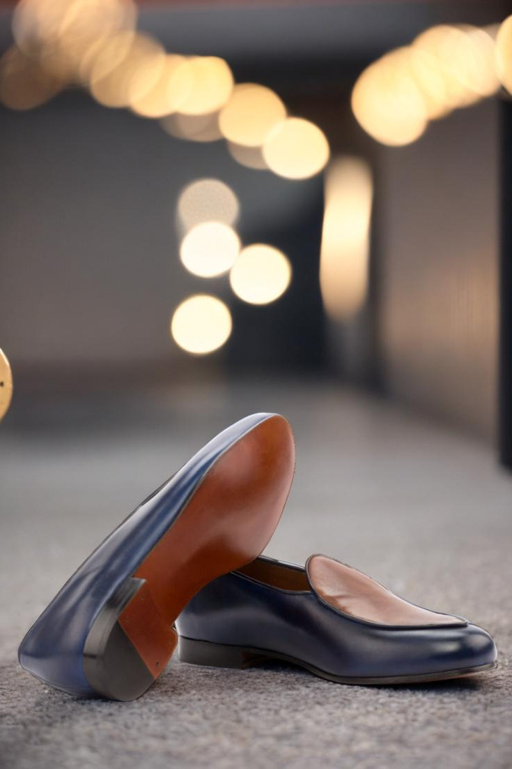 Featuring uppers in a stunning combination of navy blue and medium brown painted calf leather, this shoe effortlessly elevates any outfit. The smooth and luxurious tan calf leather lining adds a touch of elegance and comfort, making it a pleasure to wear all day long.