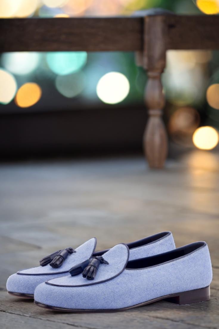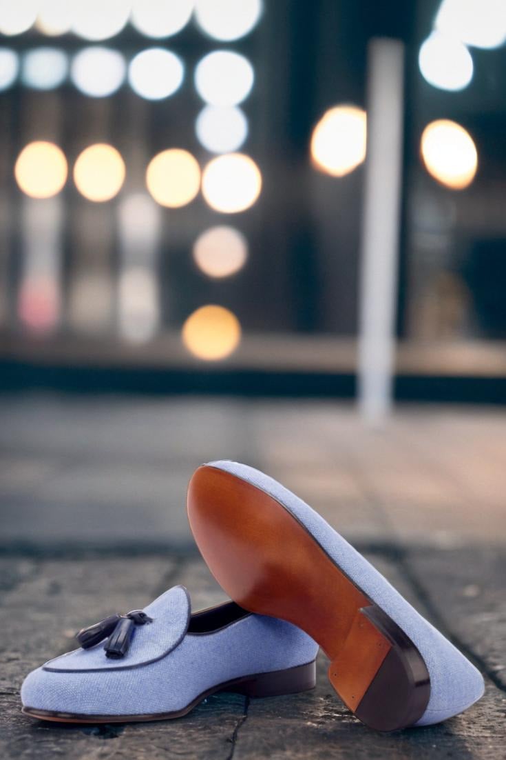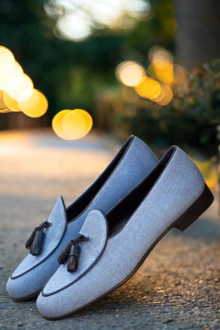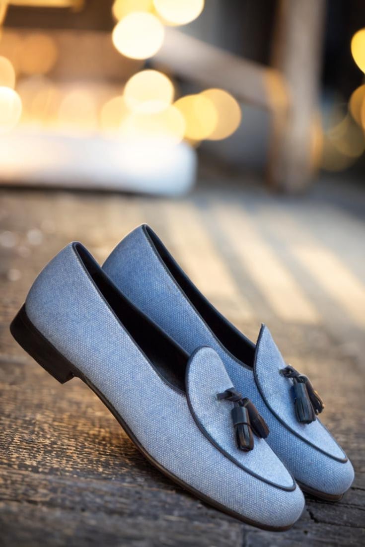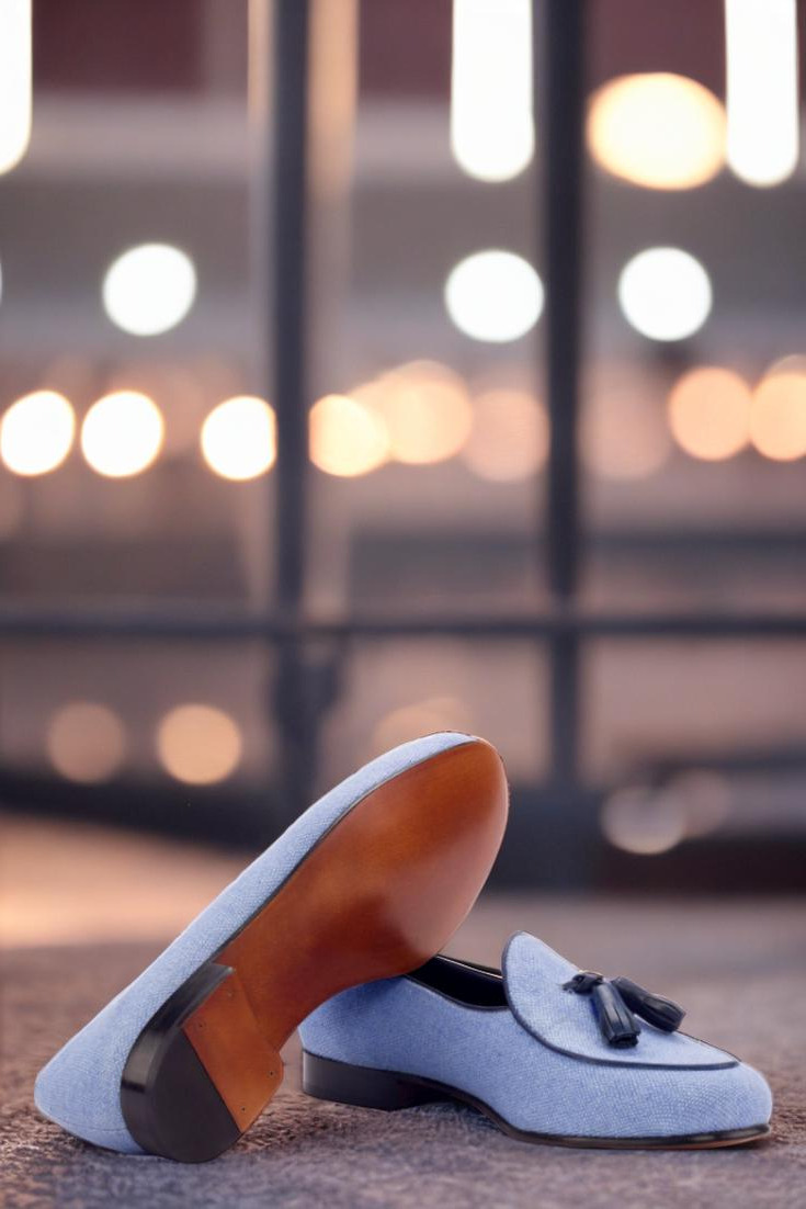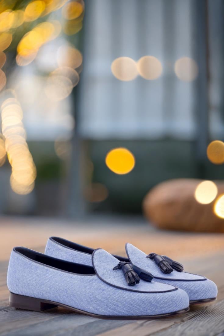 Featuring uppers made of blue linen with a touch of navy blue painted calf leather, these loafers exude an air of elegance and luxury. The contrasting texture and color create a unique and eye-catching design that is sure to turn heads. But it’s not just about looks, as these loafers also boast a lining of black calf leather for added comfort and durability.