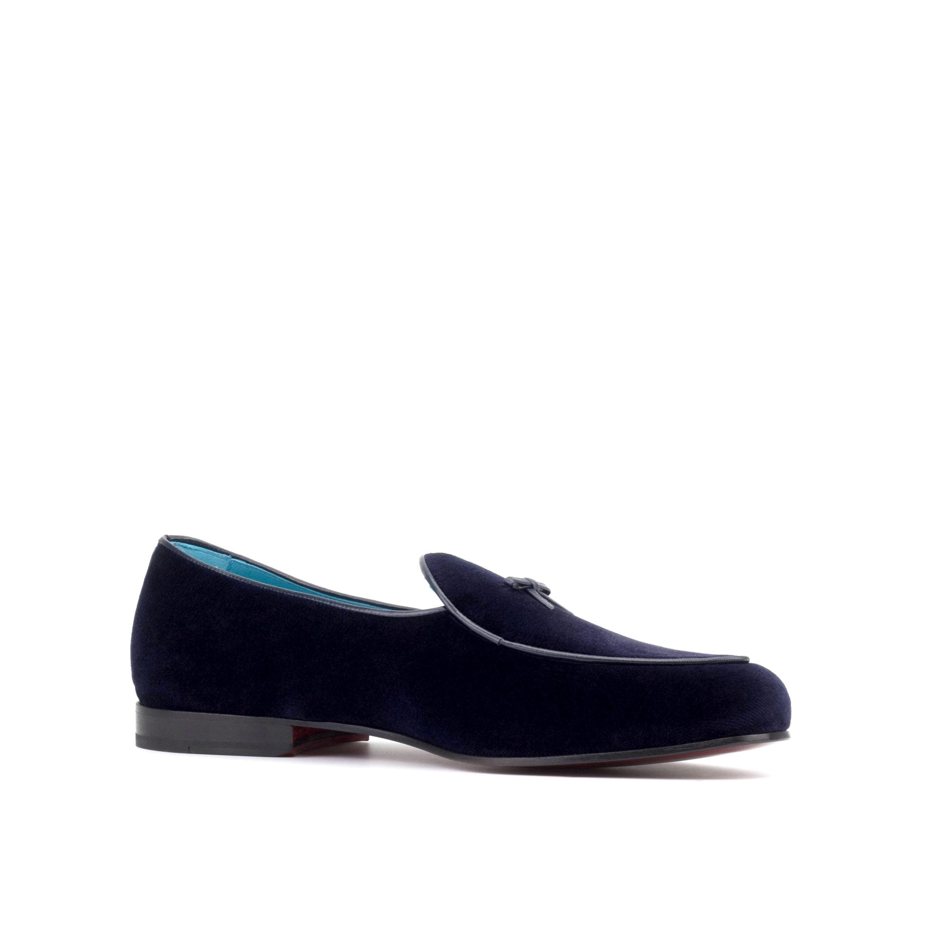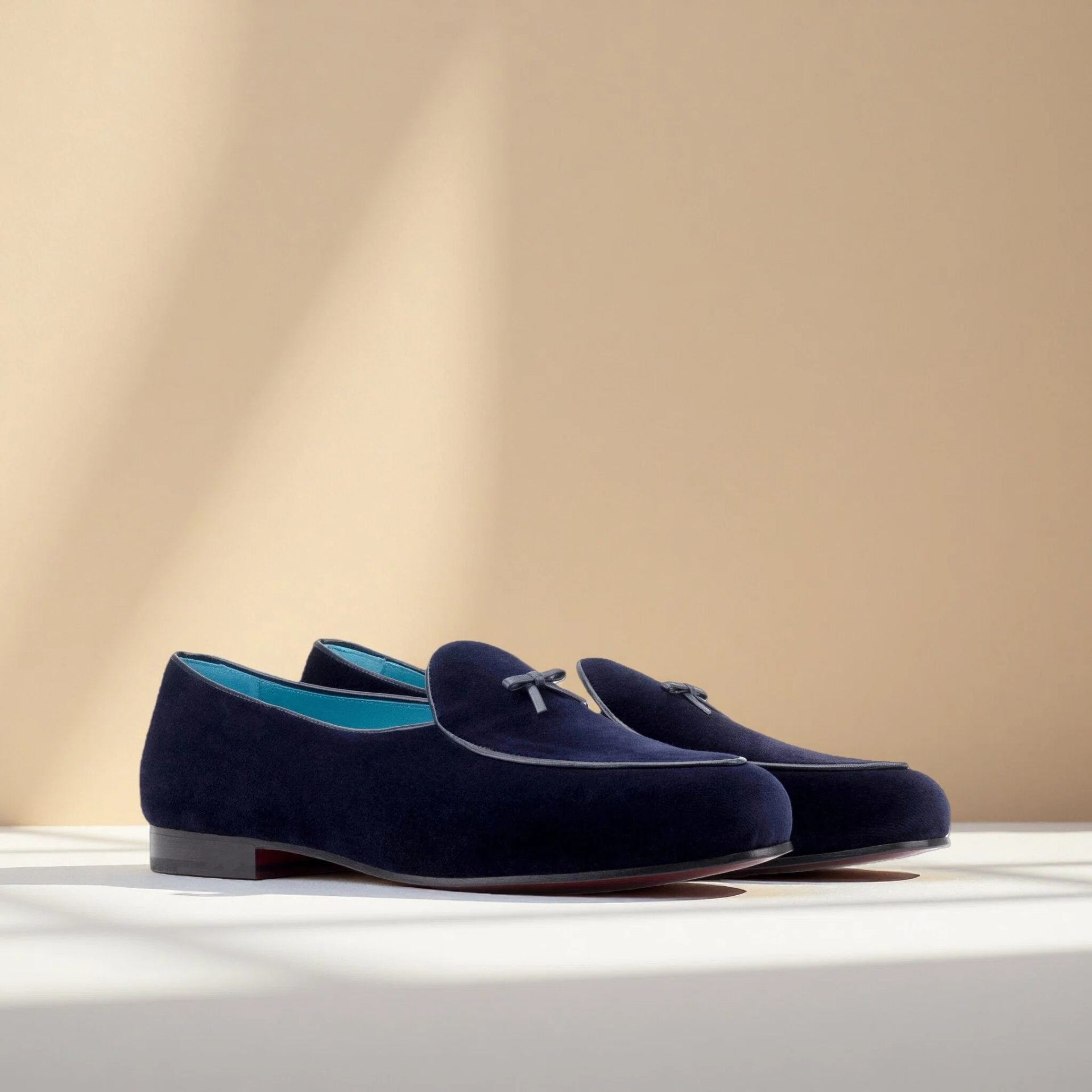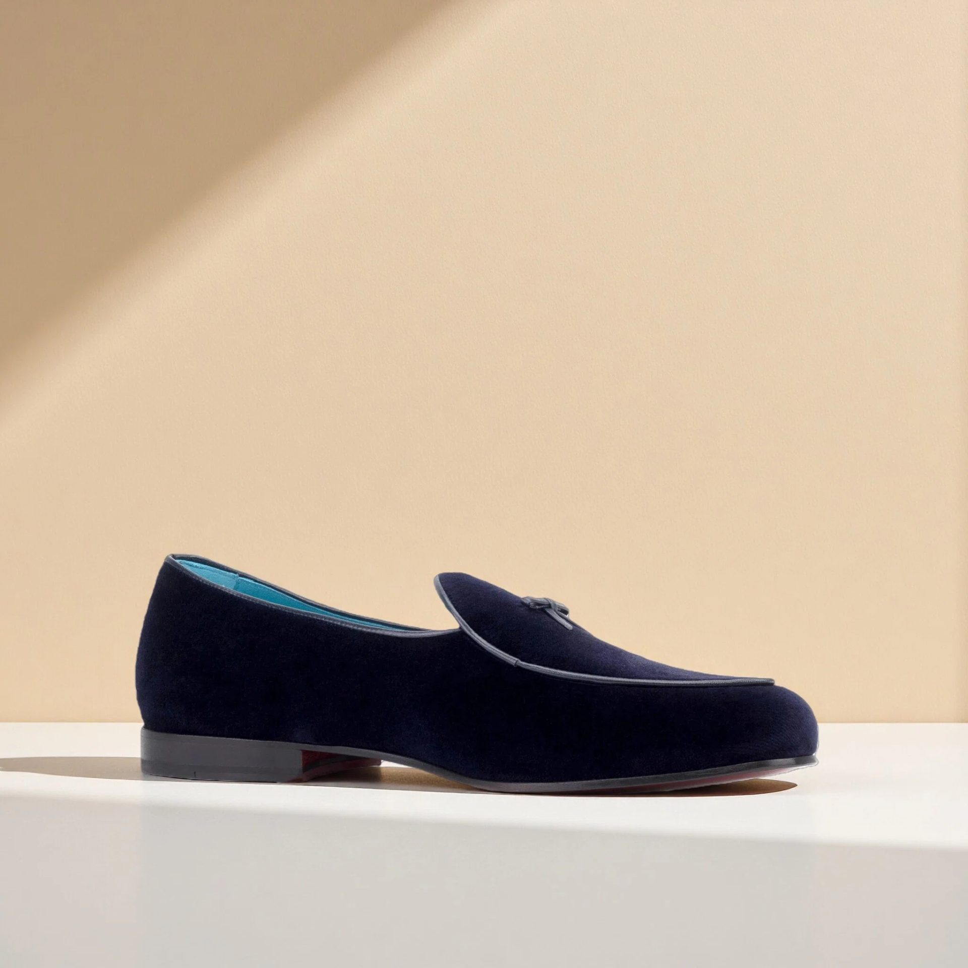 The foundation of the loafer is a rich navy blue velvet, used for both the base and the vamp. This material provides a soft, plush texture that gives the shoe a distinguished appearance and a tactile feel. The deep navy hue offers a classic, versatile look that pairs effortlessly with a wide range of outfits, from formal suits to casual trousers. This choice of velvet ensures the loafer stands out with understated elegance.