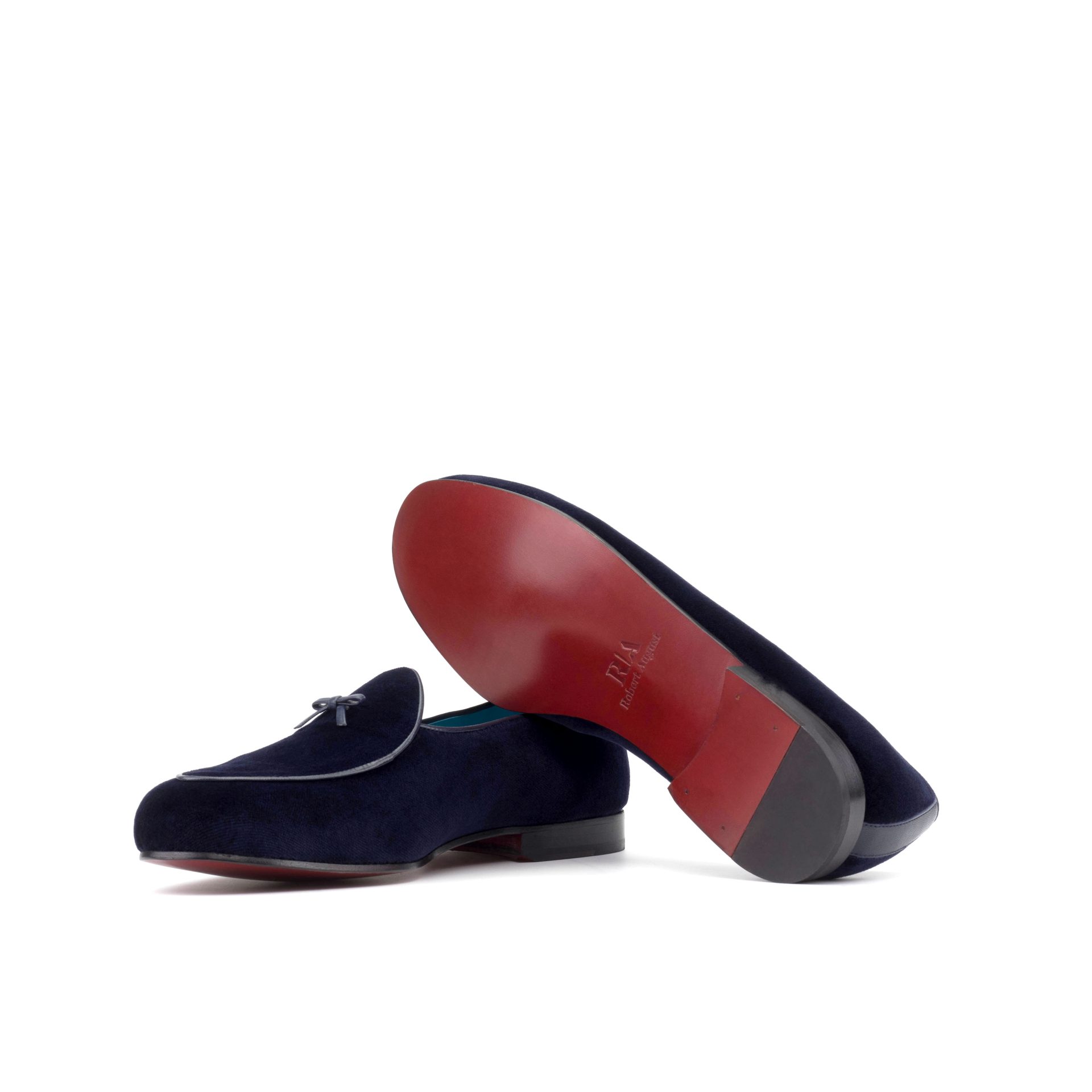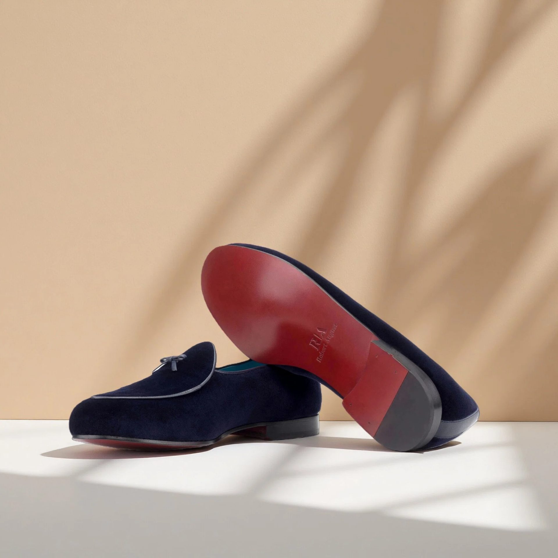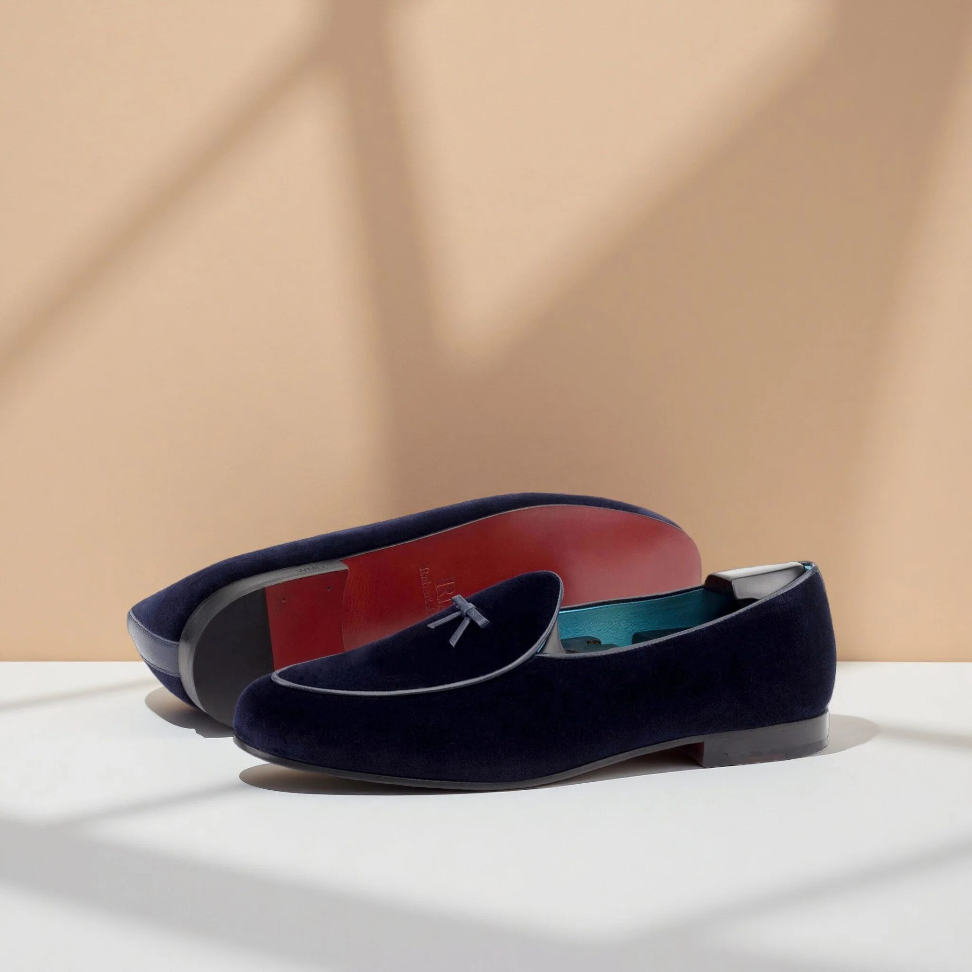 The foundation of the loafer is a rich navy blue velvet, used for both the base and the vamp. This material provides a soft, plush texture that gives the shoe a distinguished appearance and a tactile feel. The deep navy hue offers a classic, versatile look that pairs effortlessly with a wide range of outfits, from formal suits to casual trousers. This choice of velvet ensures the loafer stands out with understated elegance.