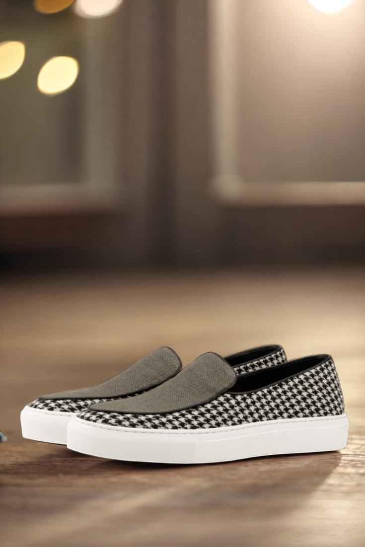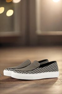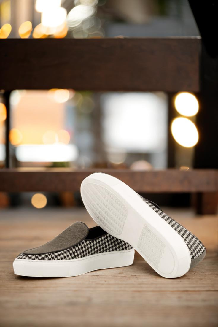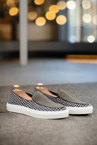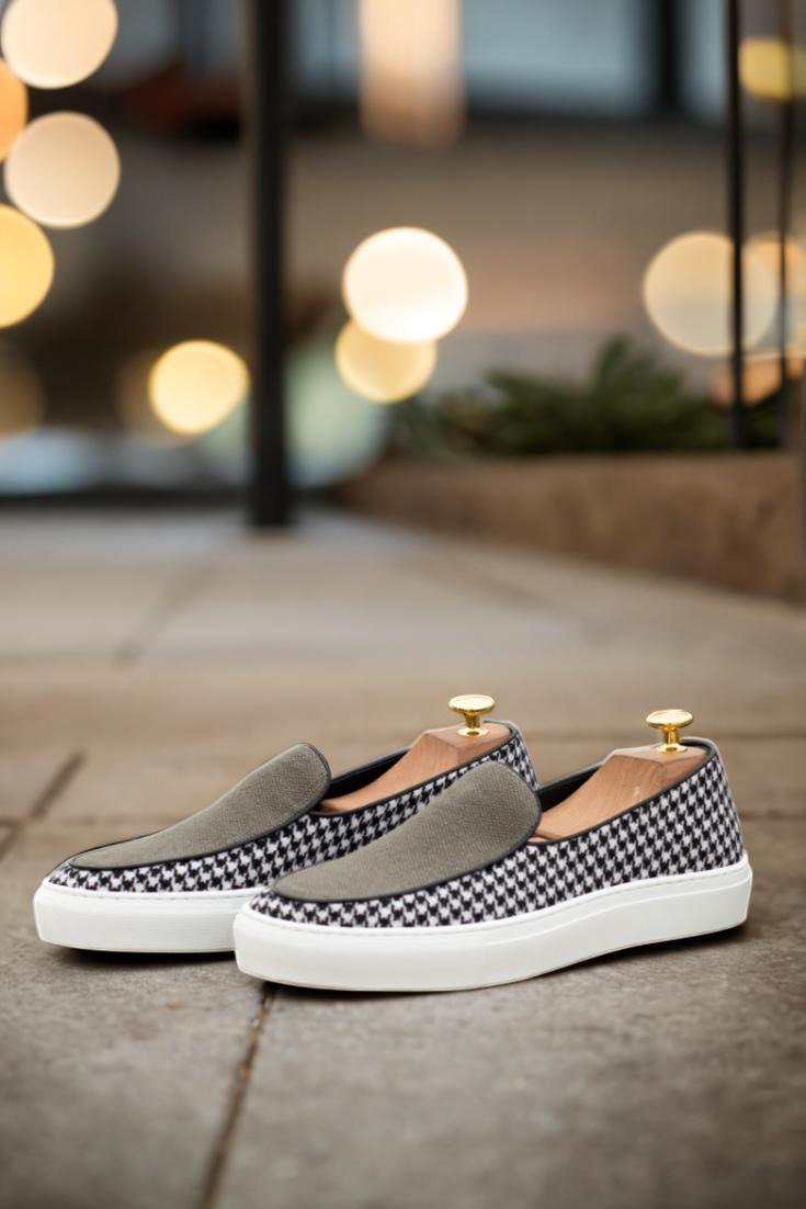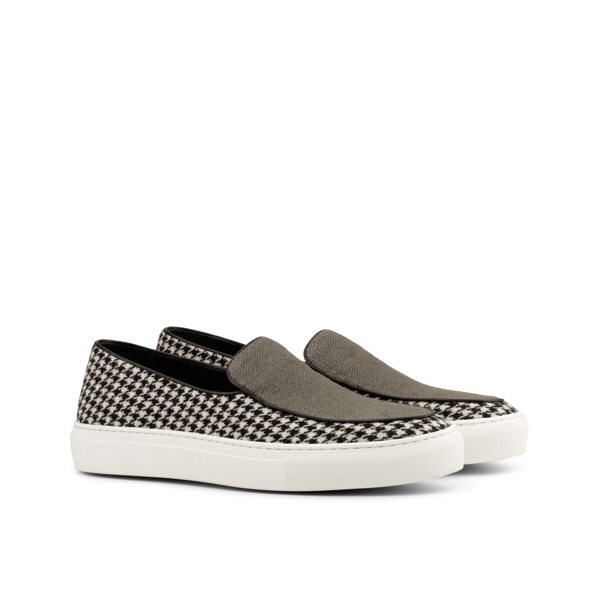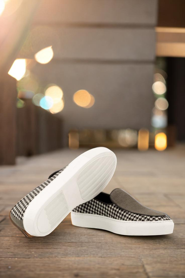 Introducing the ultimate fusion of style and functionality – The Touhy Ave. Belgian Sneaker No. 3934 from Robert August. Handcrafted in Spain, this exceptional sneaker boasts a sleek and contemporary silhouette, elevated by its unique combination of houndstooth and grey linen uppers. The attention to detail is evident in every aspect of this shoe, from the luxurious black calf leather lining to the durable white cupsole rubber sole – guaranteed to provide unparalleled comfort and support for your every step.