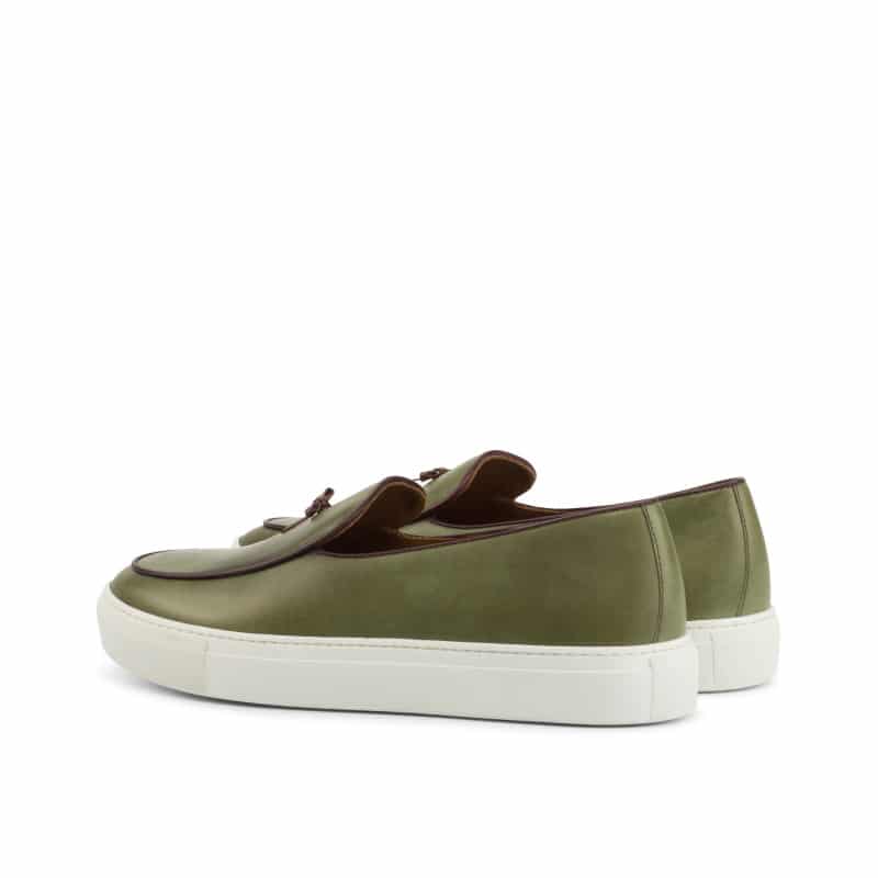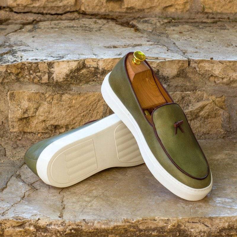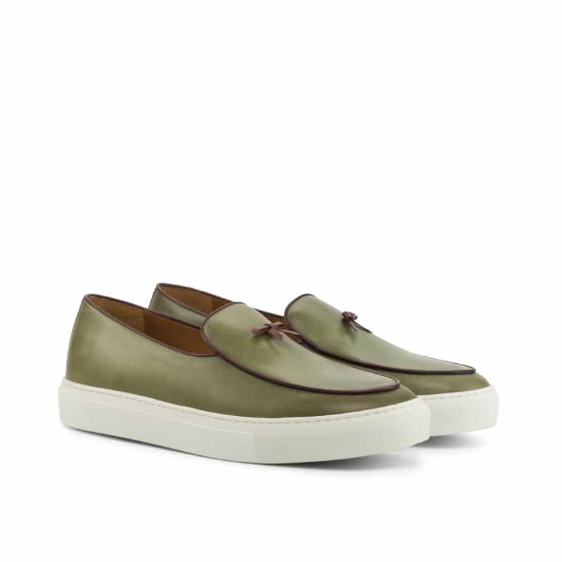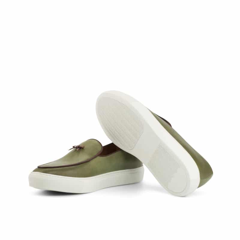 Introducing the Touhy Ave. Belgian Sneaker No. 4260 from Robert August – the ultimate blend of style and craftsmanship. Handcrafted in Spain, these sneakers feature a unique combination of olive painted calf leather and rich burgundy nappa leather, perfect for those who strive for a sleek and modern look. The luxurious tan calf leather lining adds a touch of elegance and comfort to every step you take. The white cupsole rubber sole not only offers a bold contrast, but also guarantees long-lasting durability.