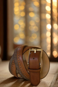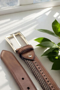 The front features medium brown painted calf leather. This material offers a smooth, durable finish that resists daily wear and minor scuffs. It secures your trousers with a firm, comfortable hold, adapting naturally to your body over time.