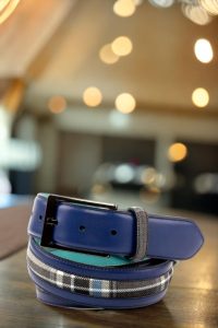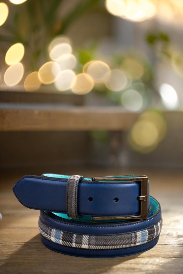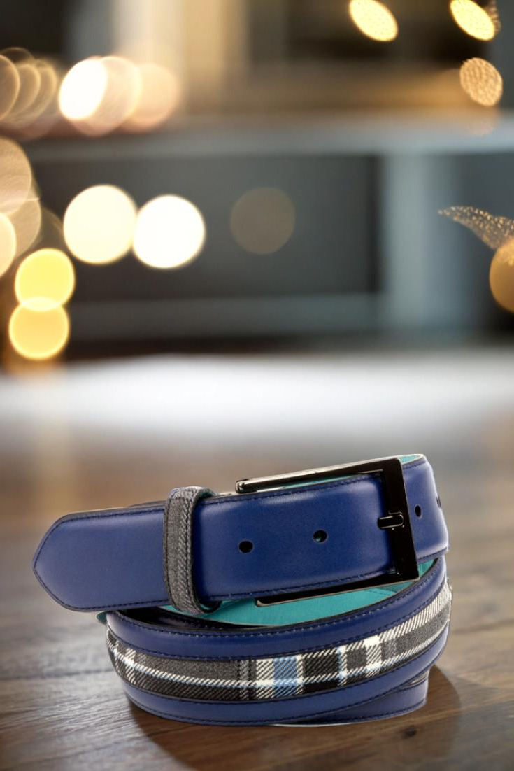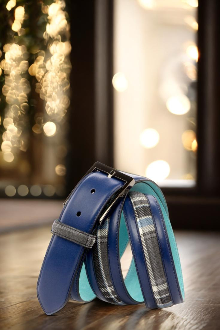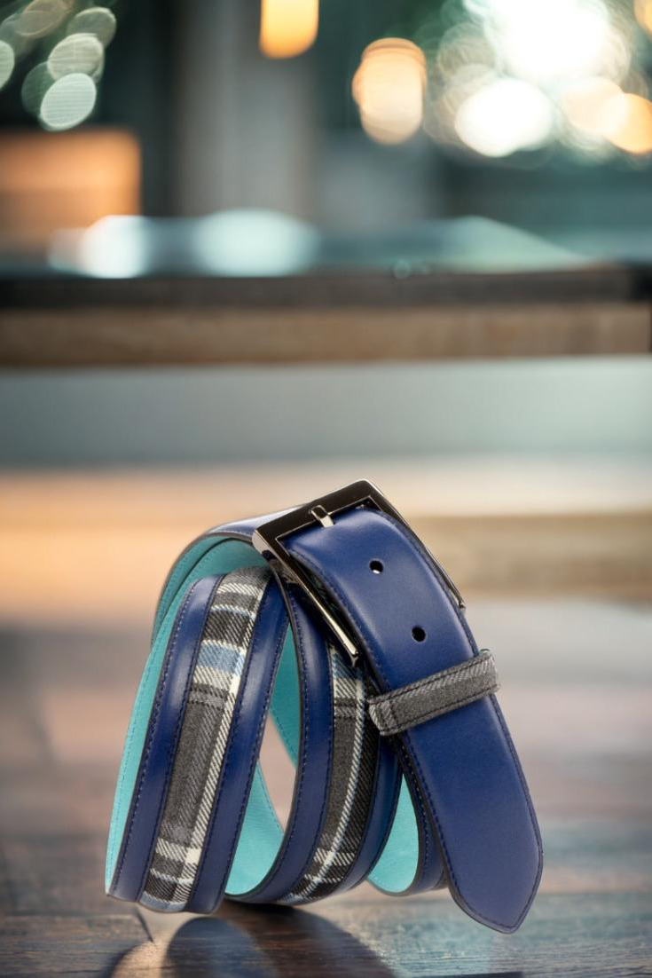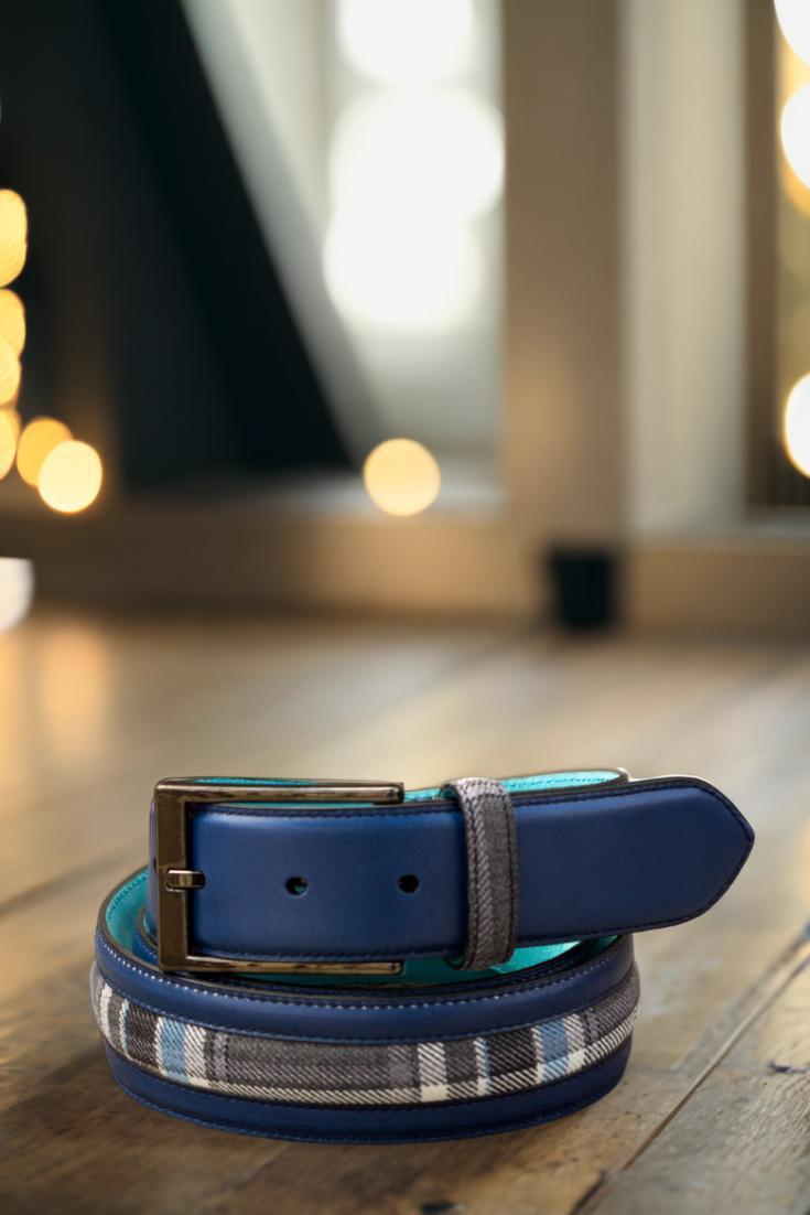 Starting with the front, the Delaware Place Belt features a luxurious navy blue painted calf leather, adding a touch of sophistication to any outfit. The center showcases a striking blue and grey plaid wool, designed to add a pop of color and texture to the belt. The belt loop and back loop both feature the same blue and grey plaid wool, creating a cohesive and polished look.