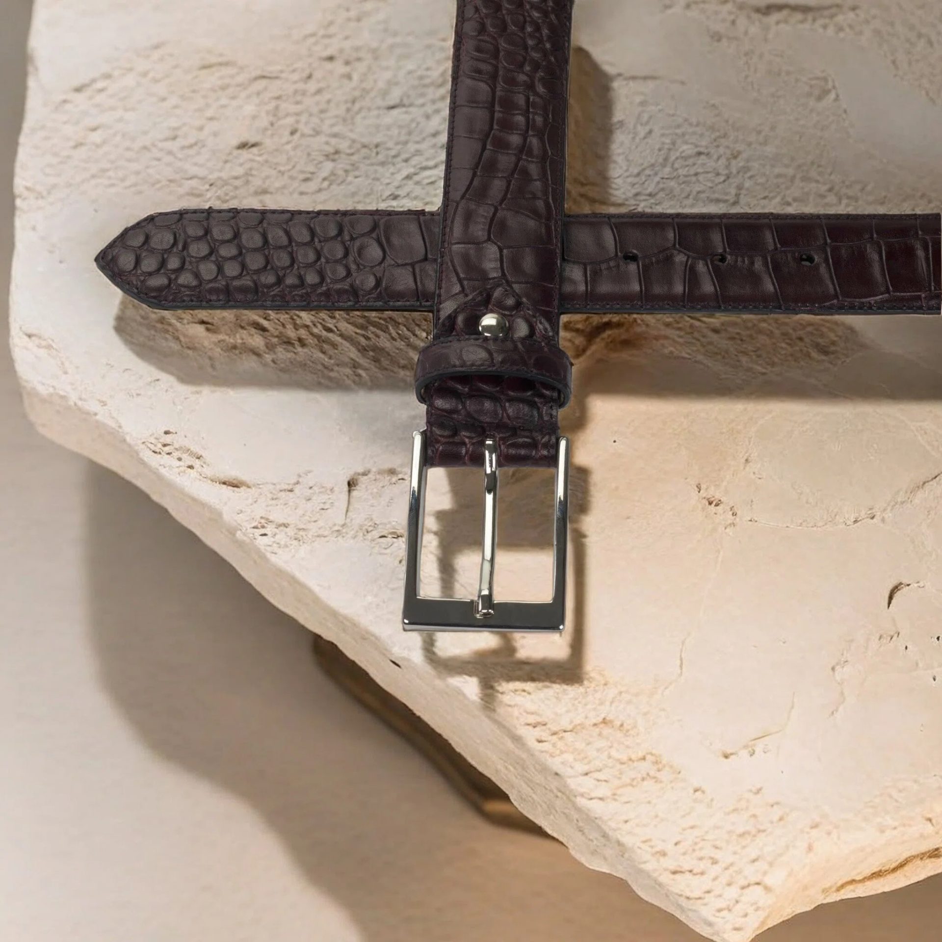 At the core of this piece is the striking Burgundy Croco Embossed Calf leather. This material offers the visual depth and sophisticated texture of exotic skin while maintaining the durability and resilience of premium calfskin. The rich burgundy hue provides a versatile pop of color that pairs exceptionally well with navy suits, charcoal trousers, or even premium denim. It adds a layer of visual interest to your waistline without overwhelming your ensemble.
