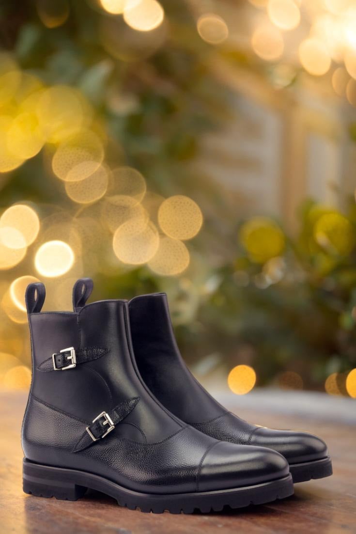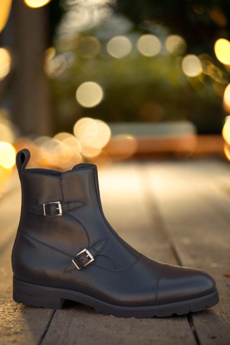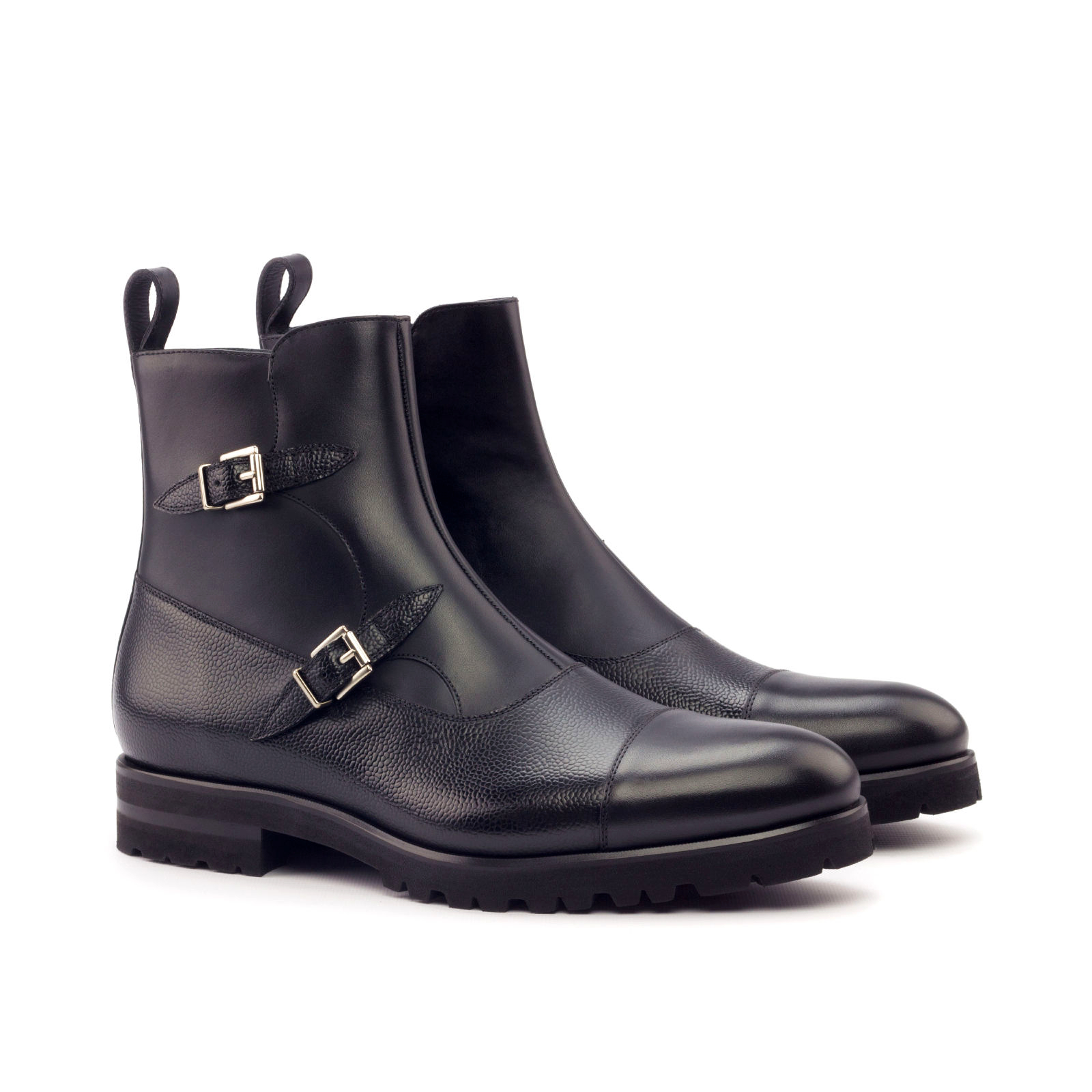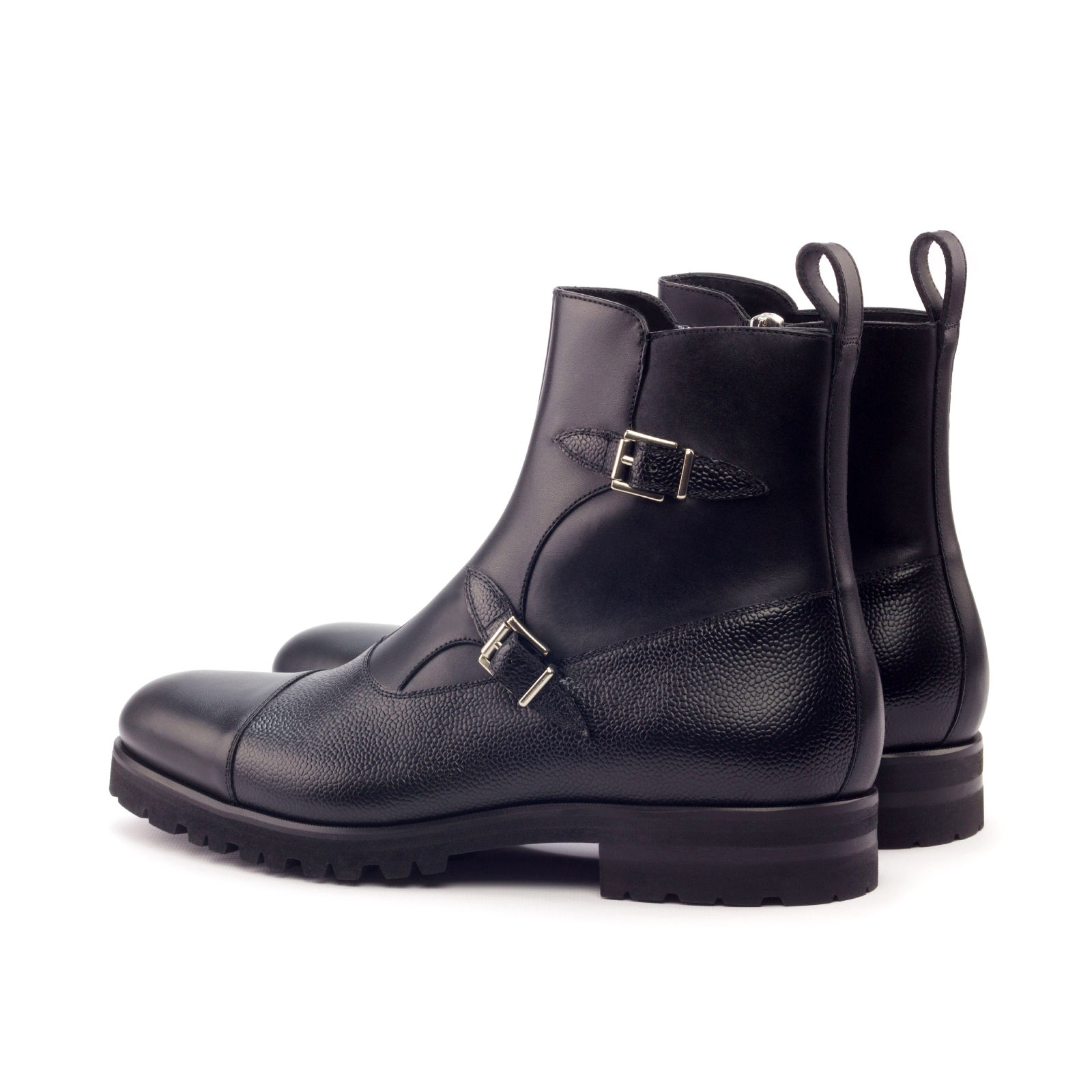 The vamp in black pebble grain leather adds a touch of texture and character to the design, giving it a unique flair that sets it apart from the ordinary. The black pebble grain leather straps, accentuated by nickel buckles, add a touch of refinement and class, elevating this boot to a true statement piece.