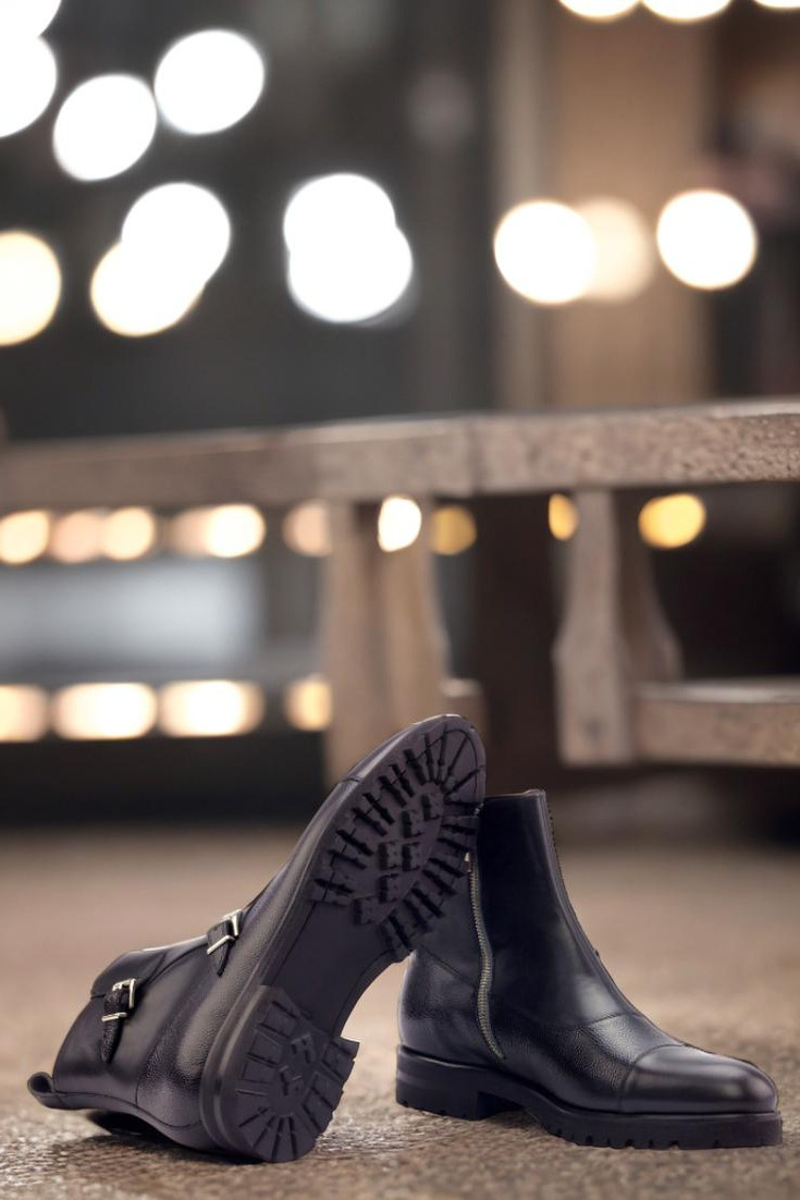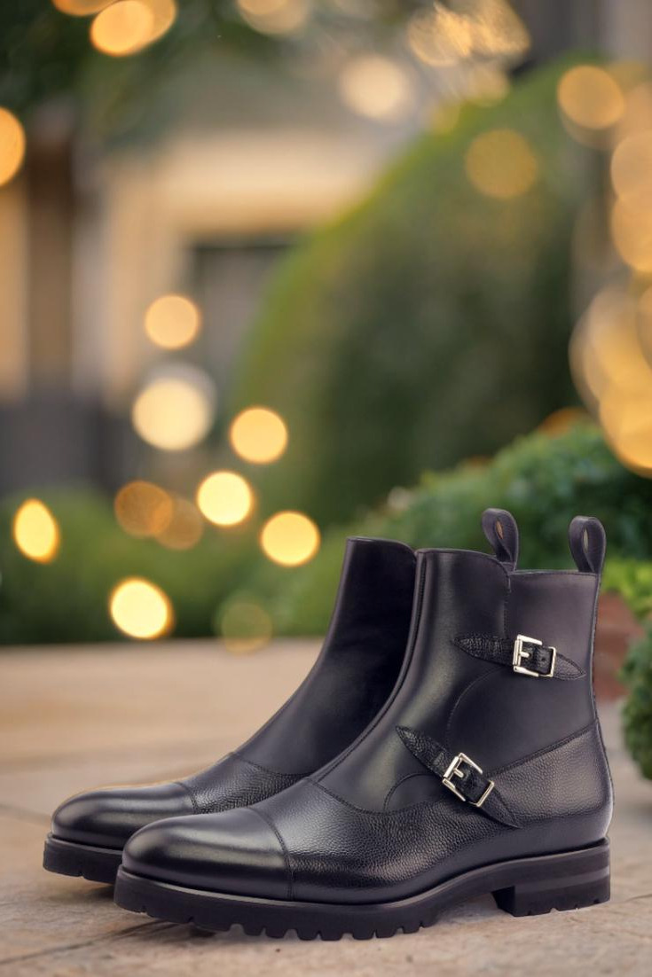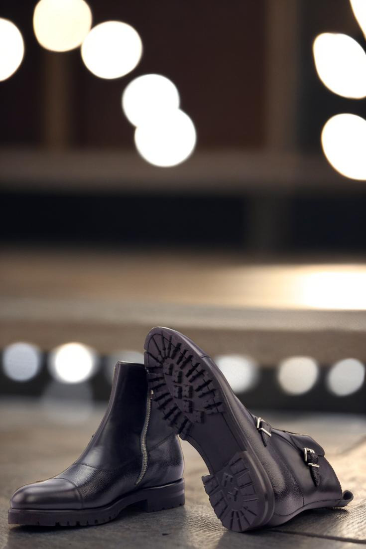 Crafted with meticulous attention to detail, this boot is a harmonious blend of sophistication and rugged durability. The toe cap and front in sleek black painted calf leather exude elegance, while the sides and back in the same luxurious material offer a seamless look that commands attention.