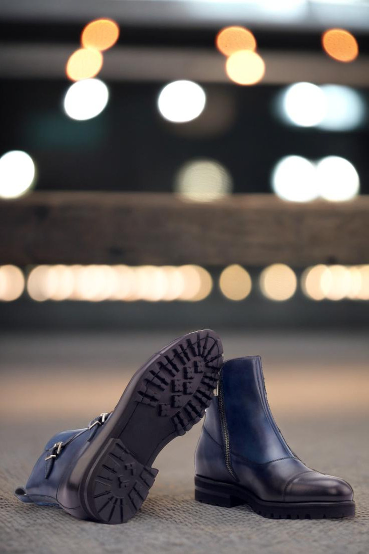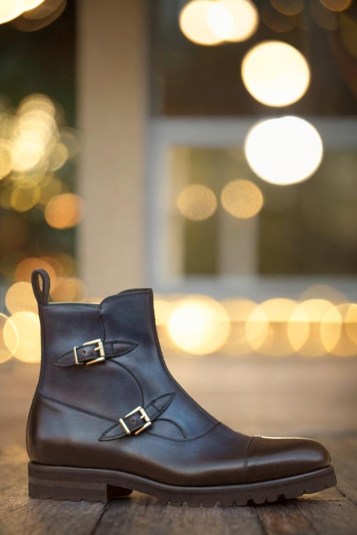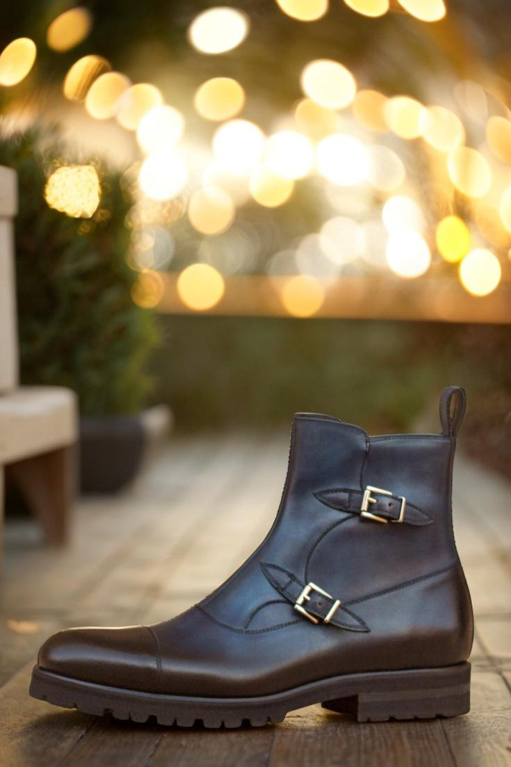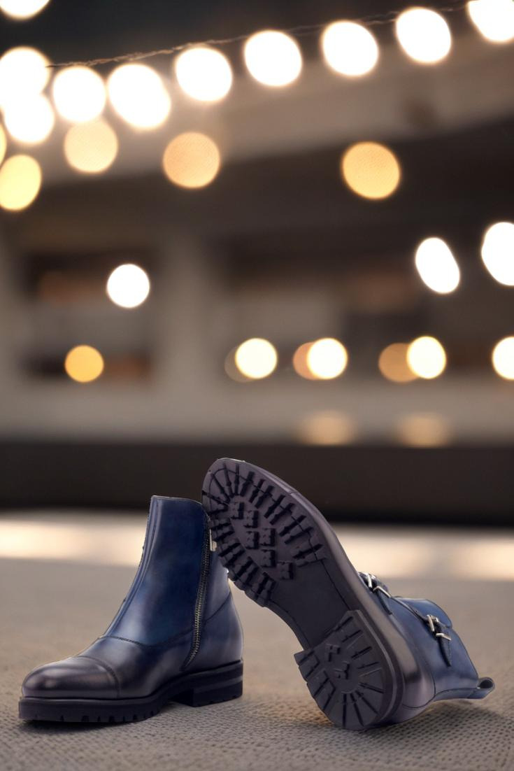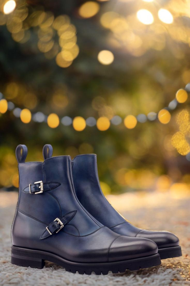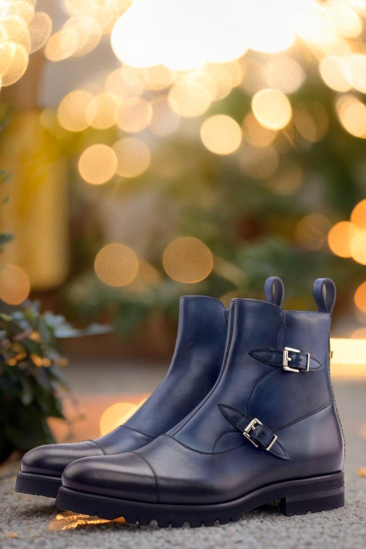 Introducing the State St. Double Buckle Boot No. 3021 from Robert August – a true masterpiece in footwear craftsmanship. Made with a luxurious navy blue painted calf leather vamp and sides, this boot exudes elegance and sophistication. The heavy burnishing adds a touch of vintage charm, while the nickel buckles and zipper provide a modern twist.