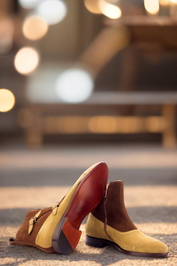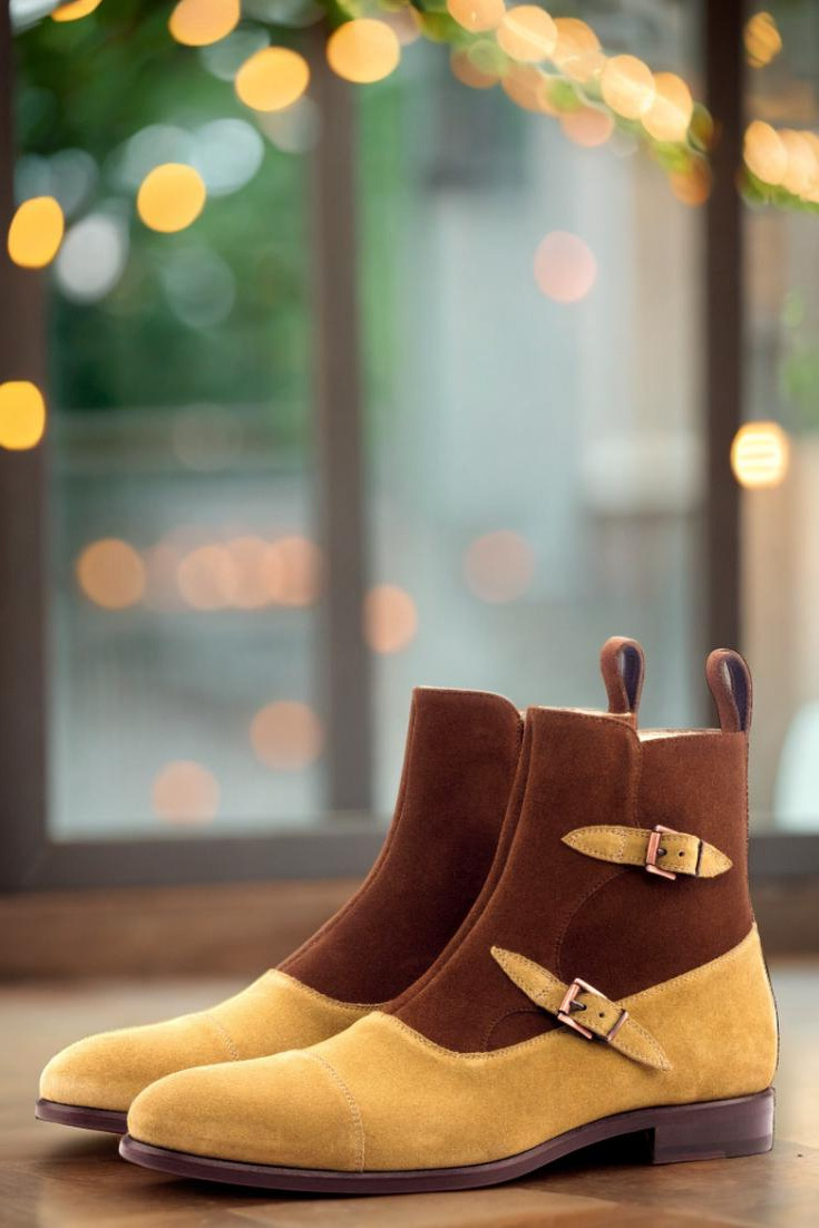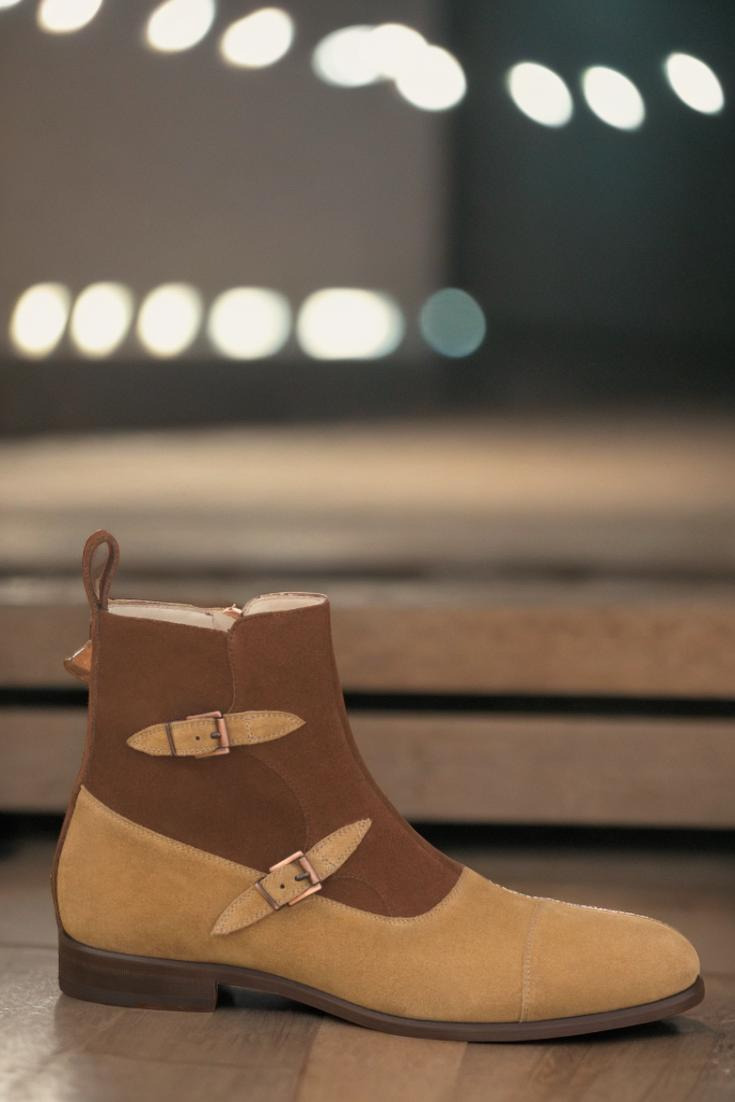 Featuring a stunning combination of medium brown luxe suede on the front, sides, and back, and a contrasting camel luxe suede on the vamp and toe cap, this boot offers a unique and eye-catching look that is sure to turn heads wherever you go. The medium brown luxe suede straps add an extra element of style, while the copper buckles and zipper provide both functionality and a touch of glamour.