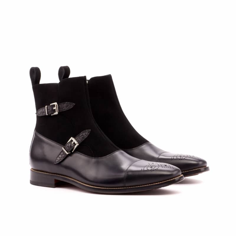 Introducing the ultimate in style and functionality – The State St. Double Buckle Boot No. 3911 from Robert August. This boot is the epitome of sophistication, featuring a combination of sleek black painted calf leather and textured black crocodile-embossed calf leather straps and buckles. The vamp, front, sides, and back are all crafted from the highest quality black kid suede, ensuring a luxurious look and feel.