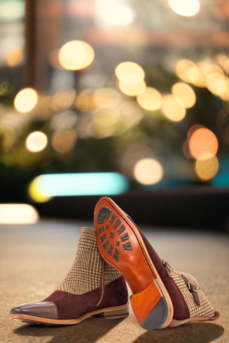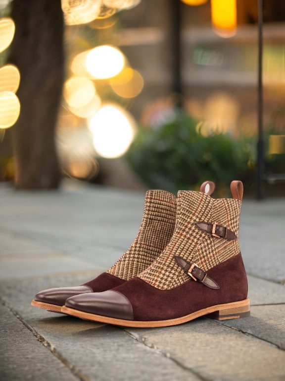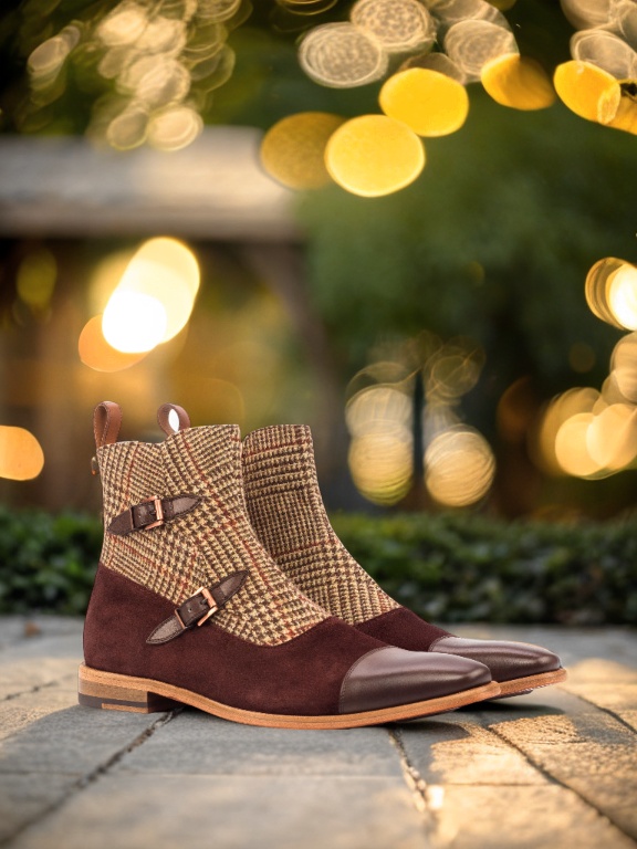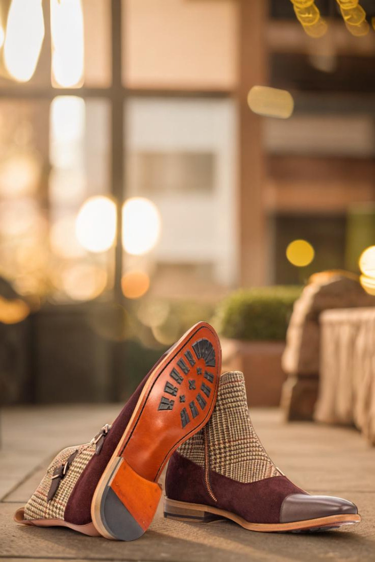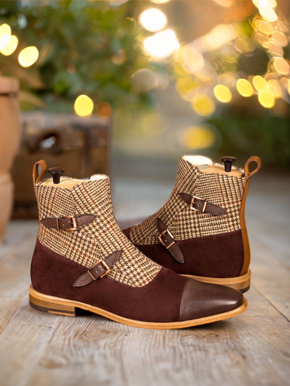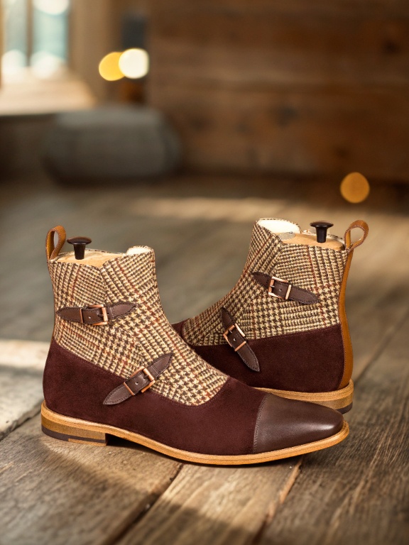 Make a statement with every step in the State St. Double Buckle Boot No. 4580 by Robert August. This handcrafted masterpiece fuses bold design with impeccable craftsmanship, epitomizing sophistication and individuality. The dark brown painted calf toe cap seamlessly blends with a burgundy luxe suede vamp, offset by rich, large brown tweed wool on the front and sides. The back, made from medium brown painted calf, completes this harmonious ensemble. Finished with dark brown painted calf straps and squared-copper buckles, every detail reflects modern elegance.