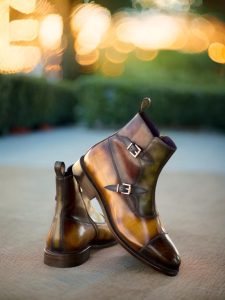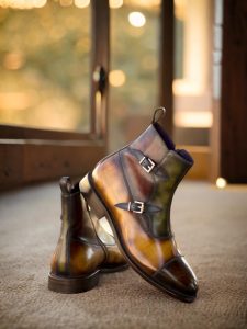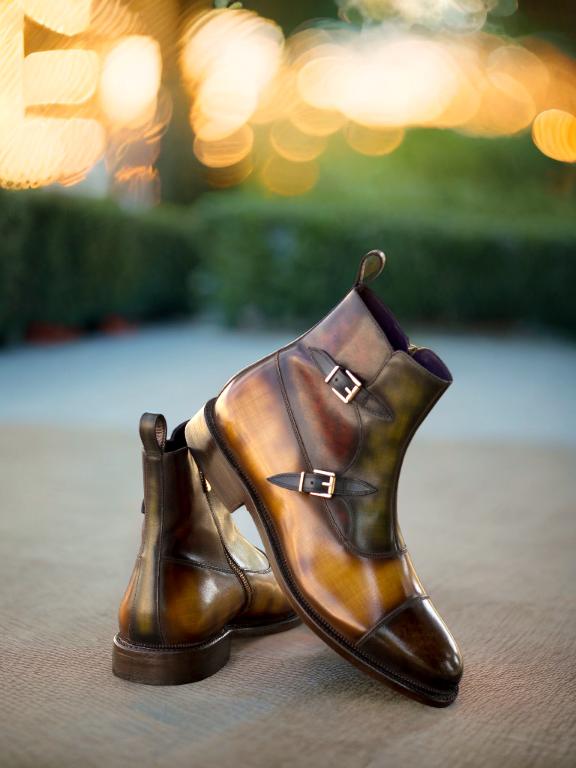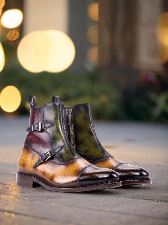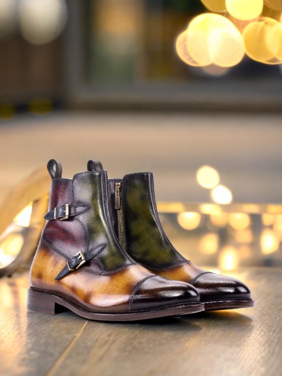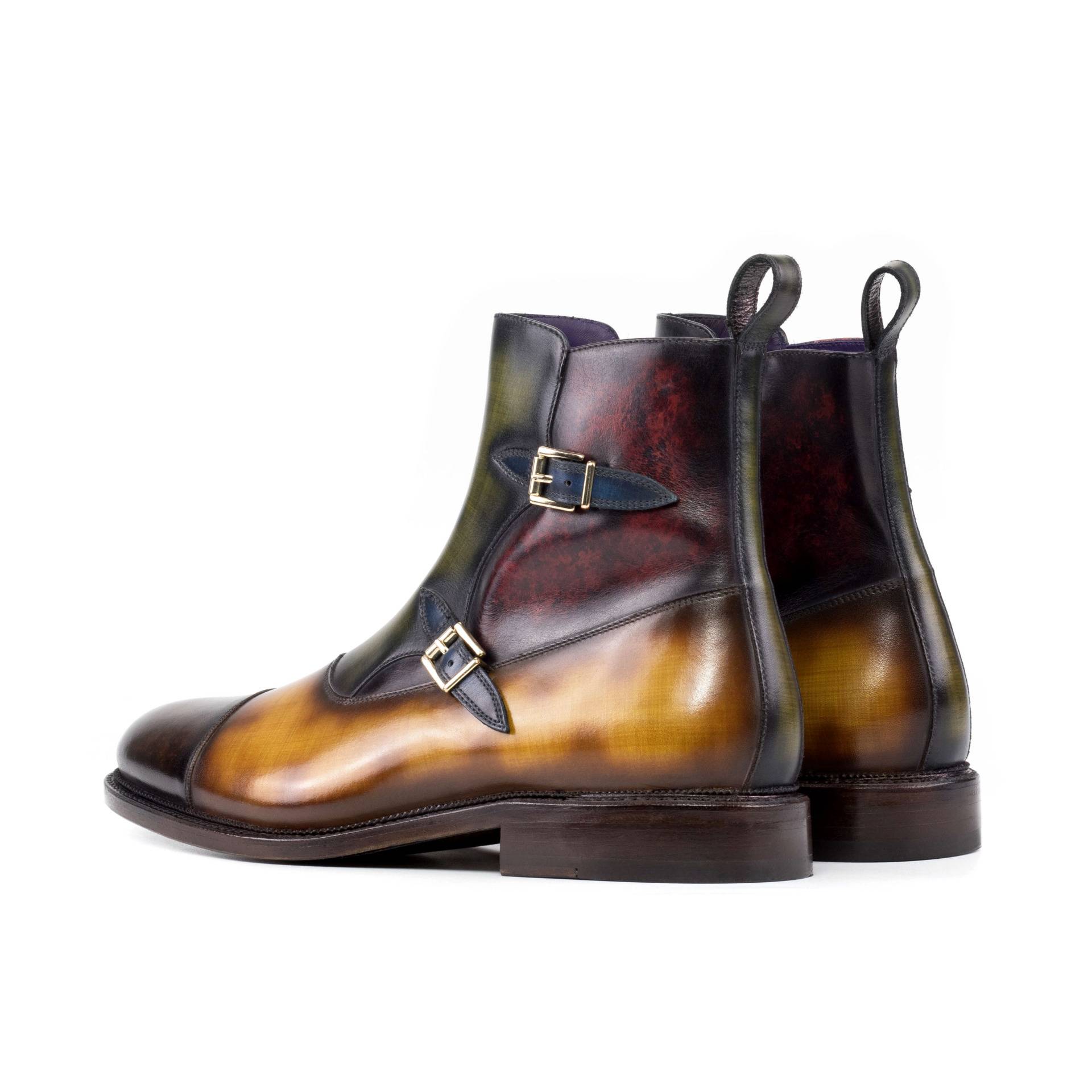 Introducing the State St. Double Buckle Boot No. 5873 from Robert August – the epitome of style, craftsmanship, and efficiency. This handcrafted boot features an impeccable combination of burgundy and khaki hand patina leather on the sides and front, while denim blue and cognac hand patina leather adorn the straps and vamp. The toe cap is finished with a stunning marble patina, adding a touch of elegance to the overall design. To complete the look, the buckles and zipper are crafted in sleek gold, exuding a sense of luxury and refinement.