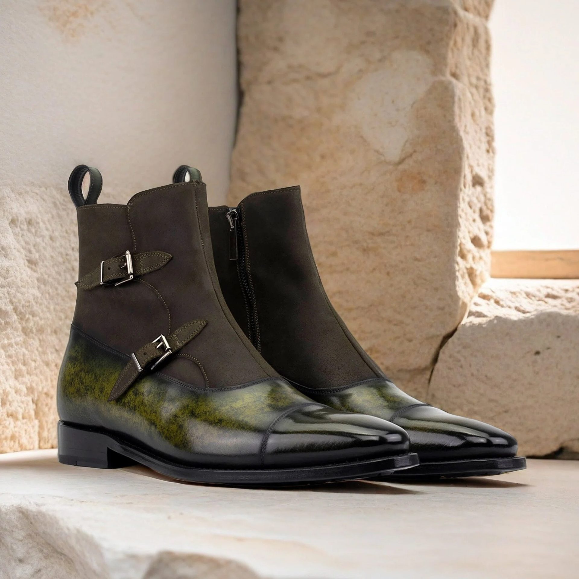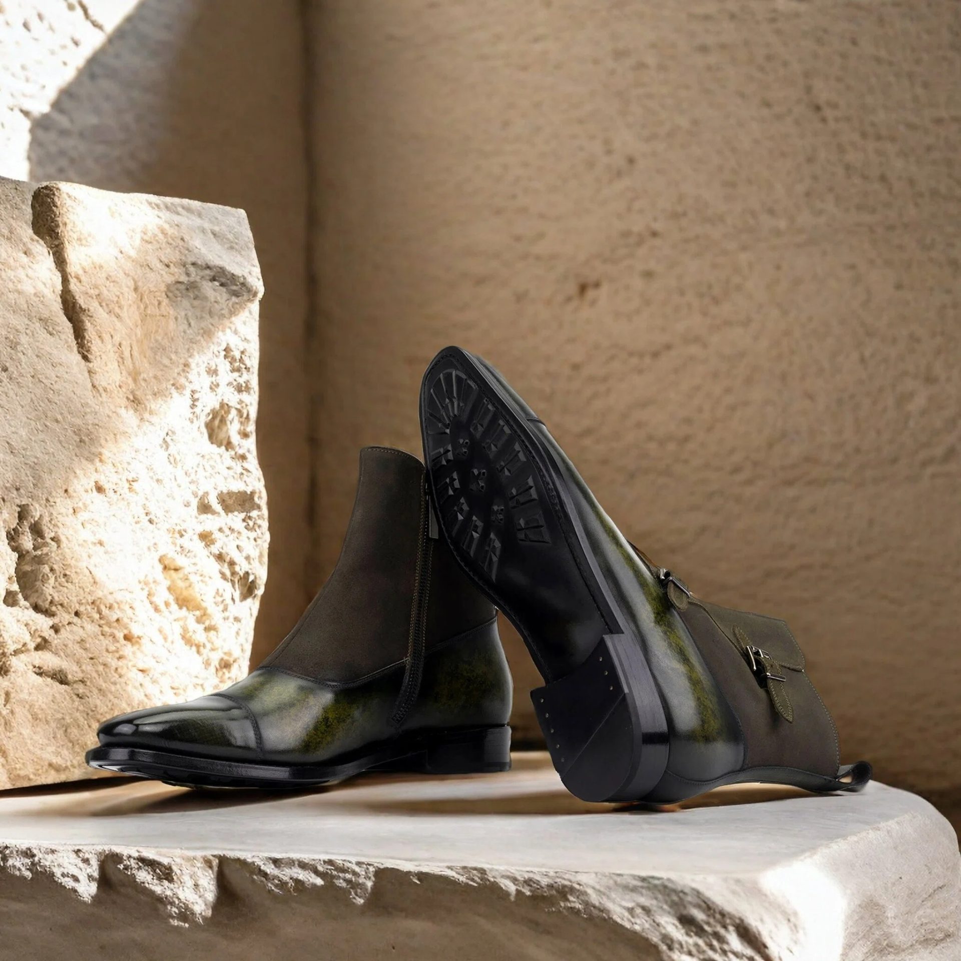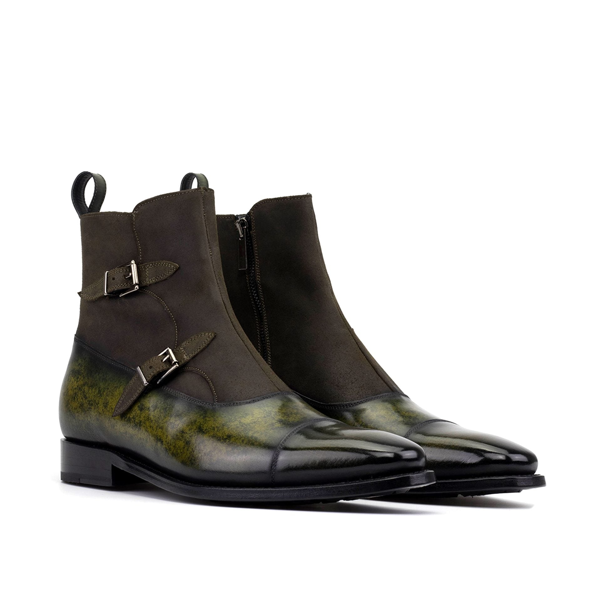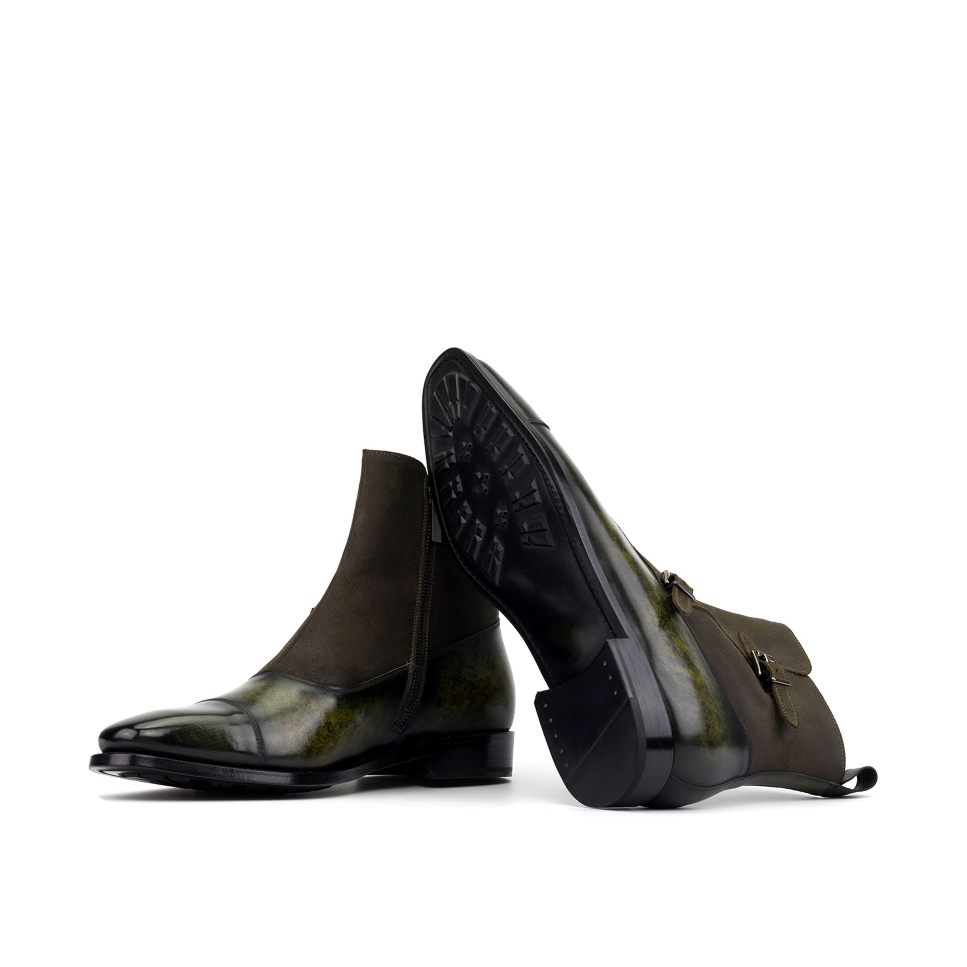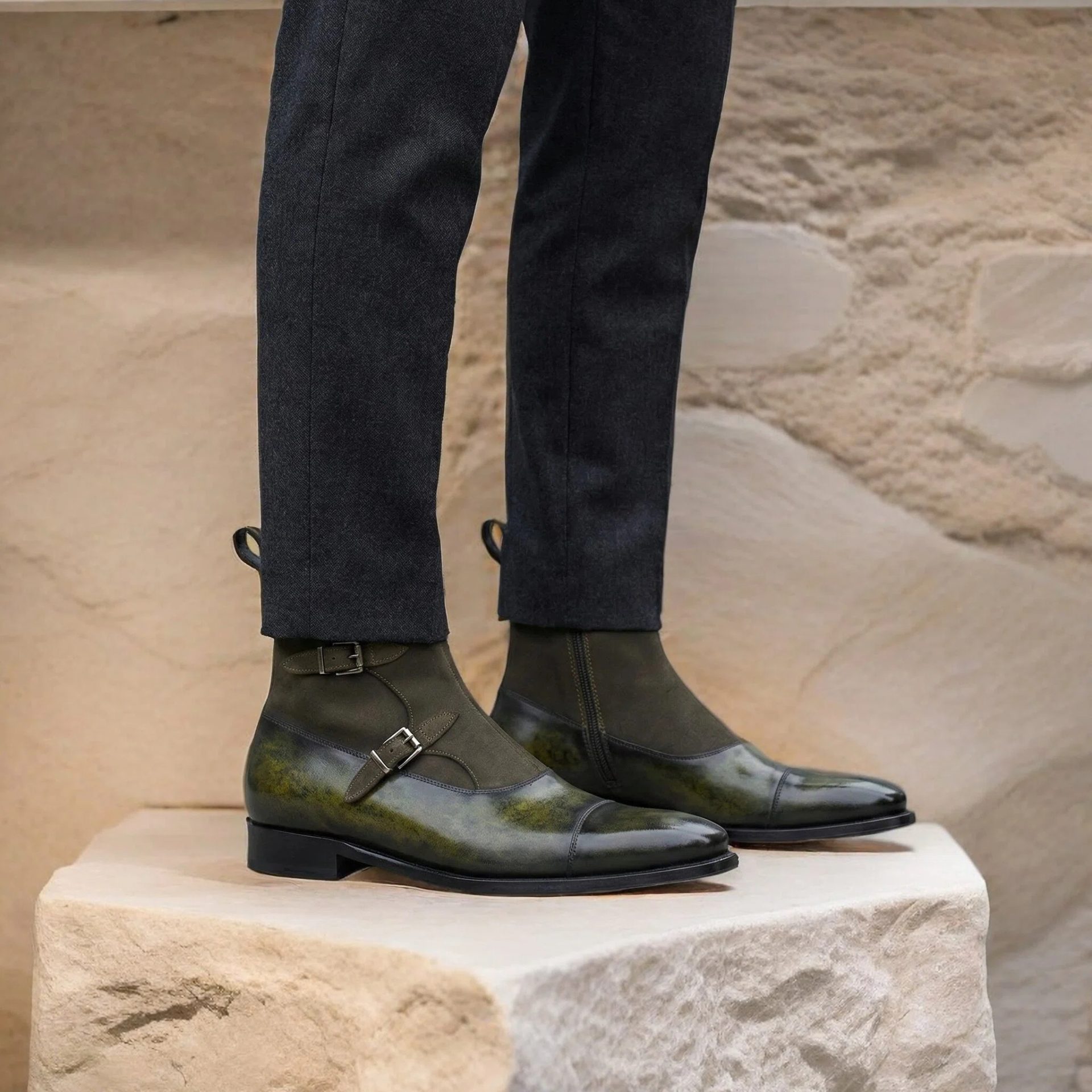 The upper construction utilizes a strategic mix of textures and finishes to create visual depth. The toe cap and back are crafted from Italian Calf Leather featuring a Khaki Green Papiro Hand Patina, a specialized finish that adds character and unique coloration. This is balanced by the Green Waxed Suede used on the front, sides, and strap, offering a tactile contrast that softens the overall silhouette while maintaining durability. The vamp further elevates the design with Italian Calf Leather in a Khaki Green Marbled Hand Patina, ensuring that the boot looks dynamic from every angle.