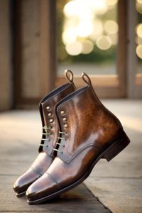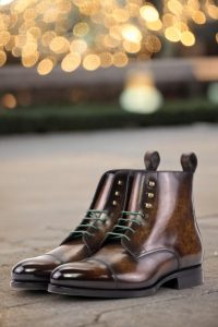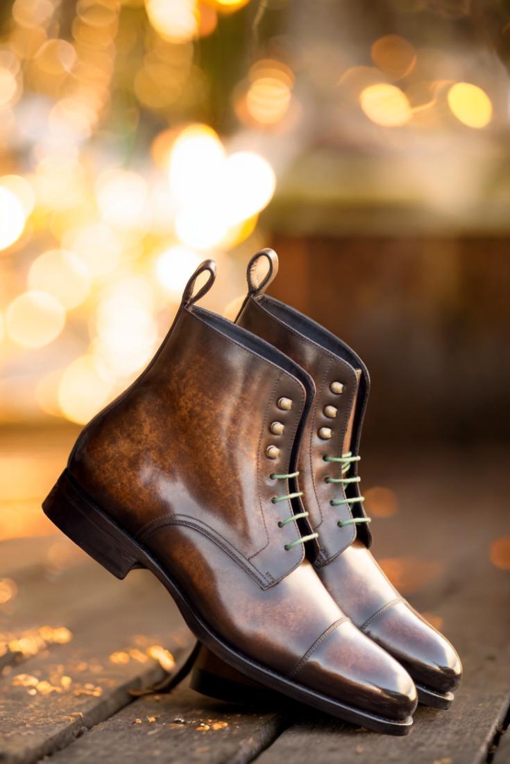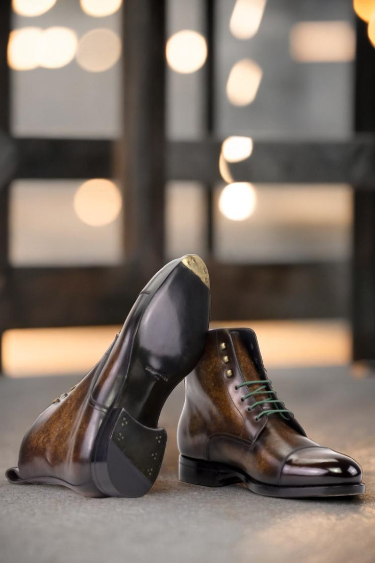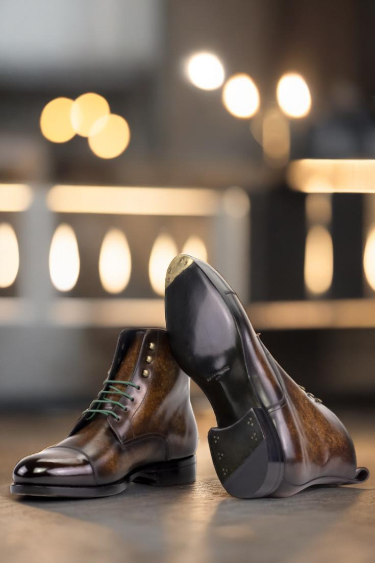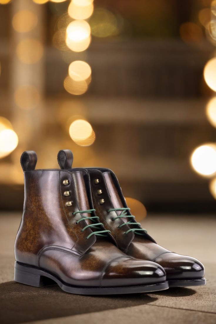 Introducing the Sedgwick St. Cap Toe Jumper Boot No. 5782 for those who want to experience true craftsmanship and style. This style features vamp, quarters, tongue, toe cap, and back strip crafted from Italian calf leather with a brown marbled hand patina for a premium look and feel. The contrast between the green and navy colors creates a unique style, while the old gold eyelets and round-green laces add an eye-catching detail. The sole of this boot is made with a forest green hand painted leather and beveled waist, finished off with metal toe taps. Whether to the office or out on the town, this boot will add a timeless charm to your wardrobe. Invest in the exquisite style of the Sedgwick St. Cap Toe Jumper Boot No. 5782 and enjoy years of fashion-forward wear.