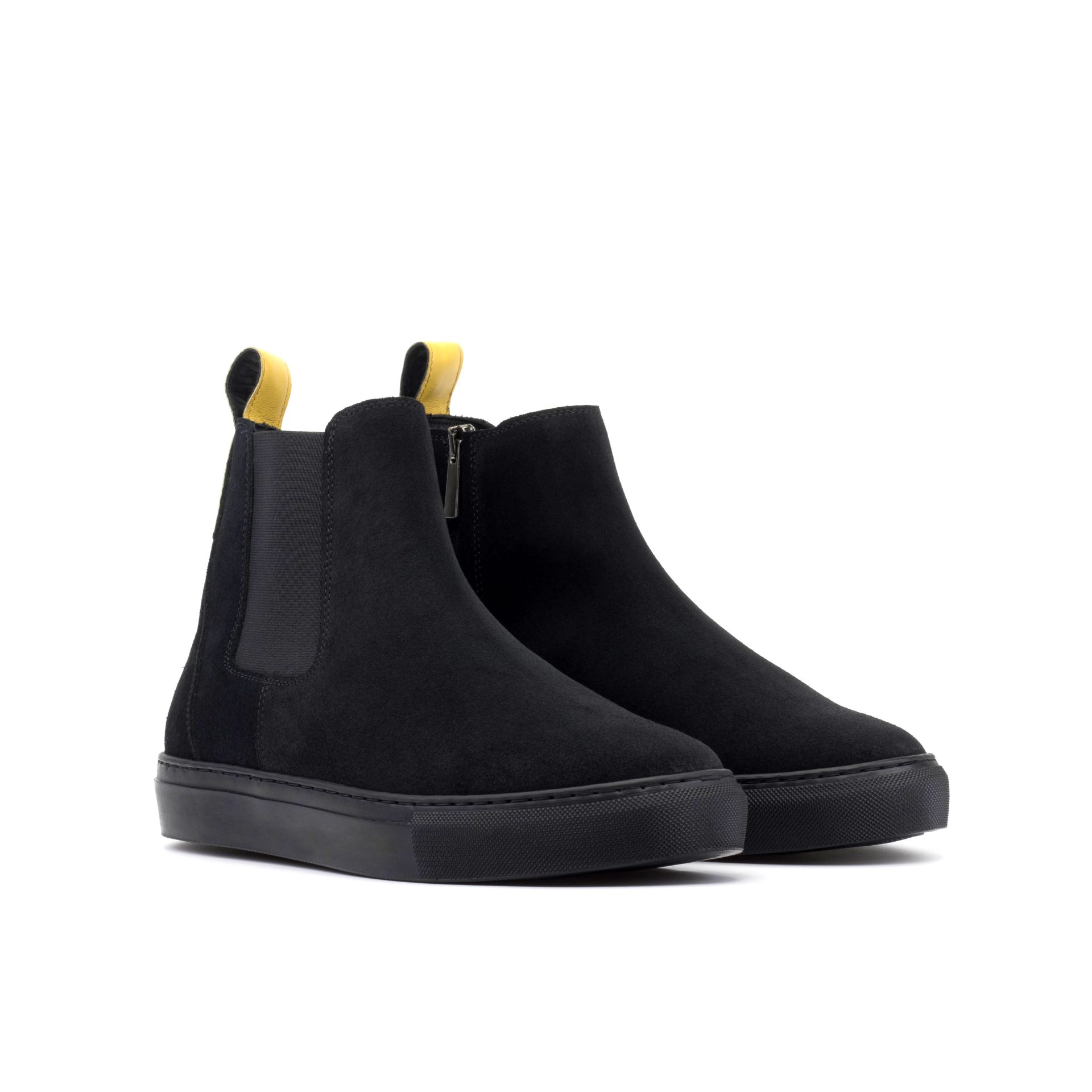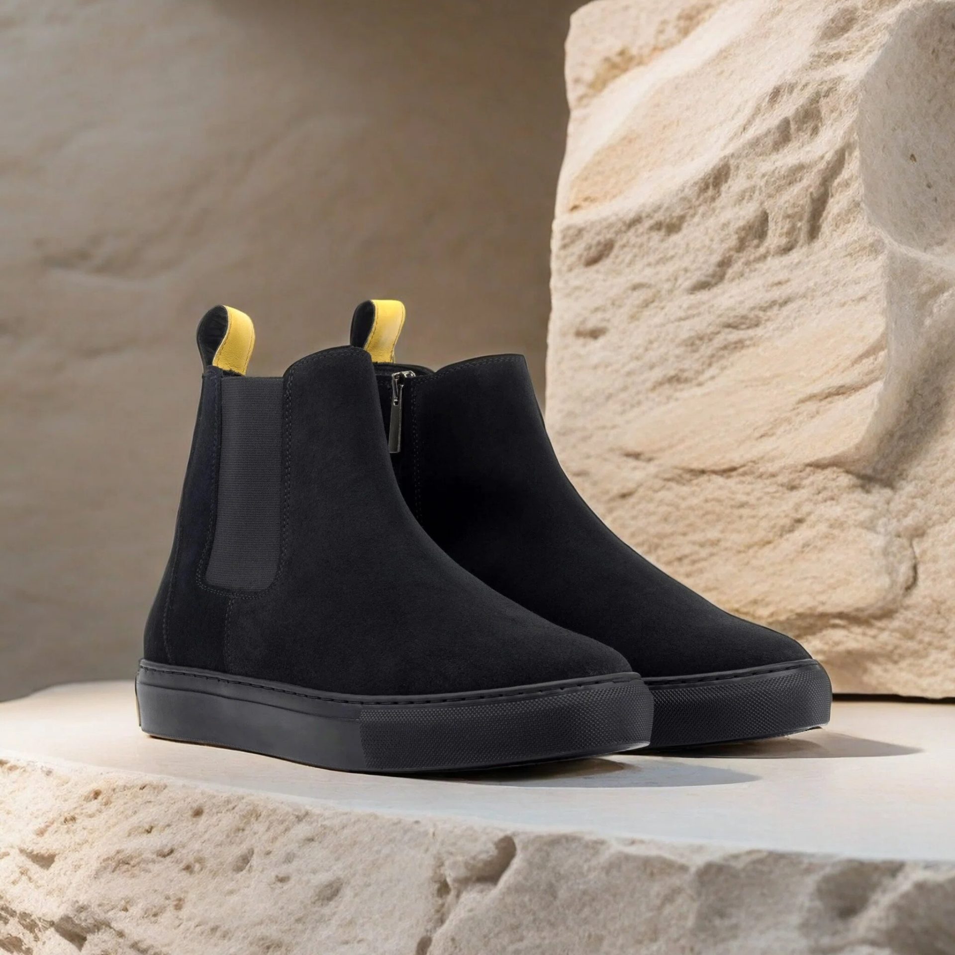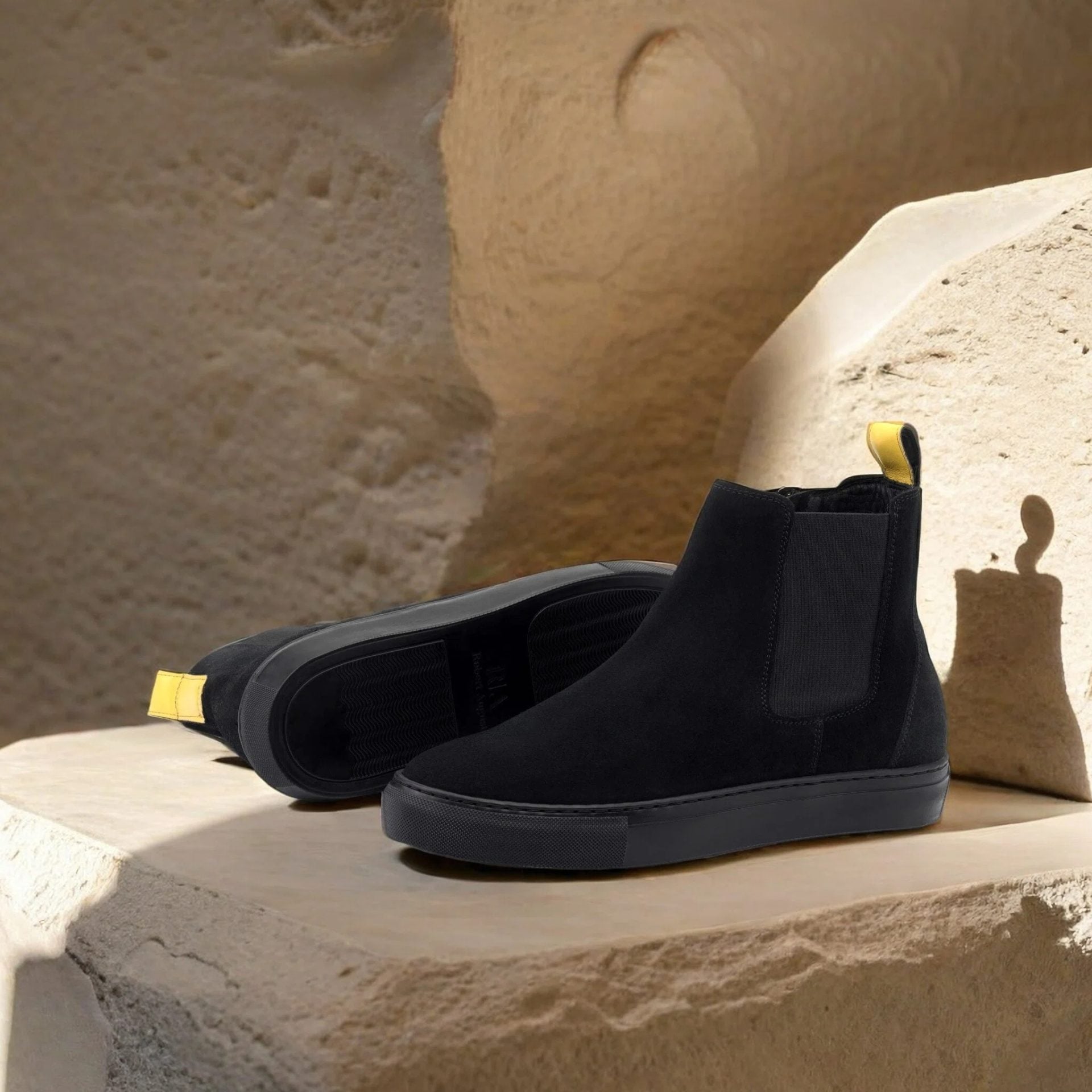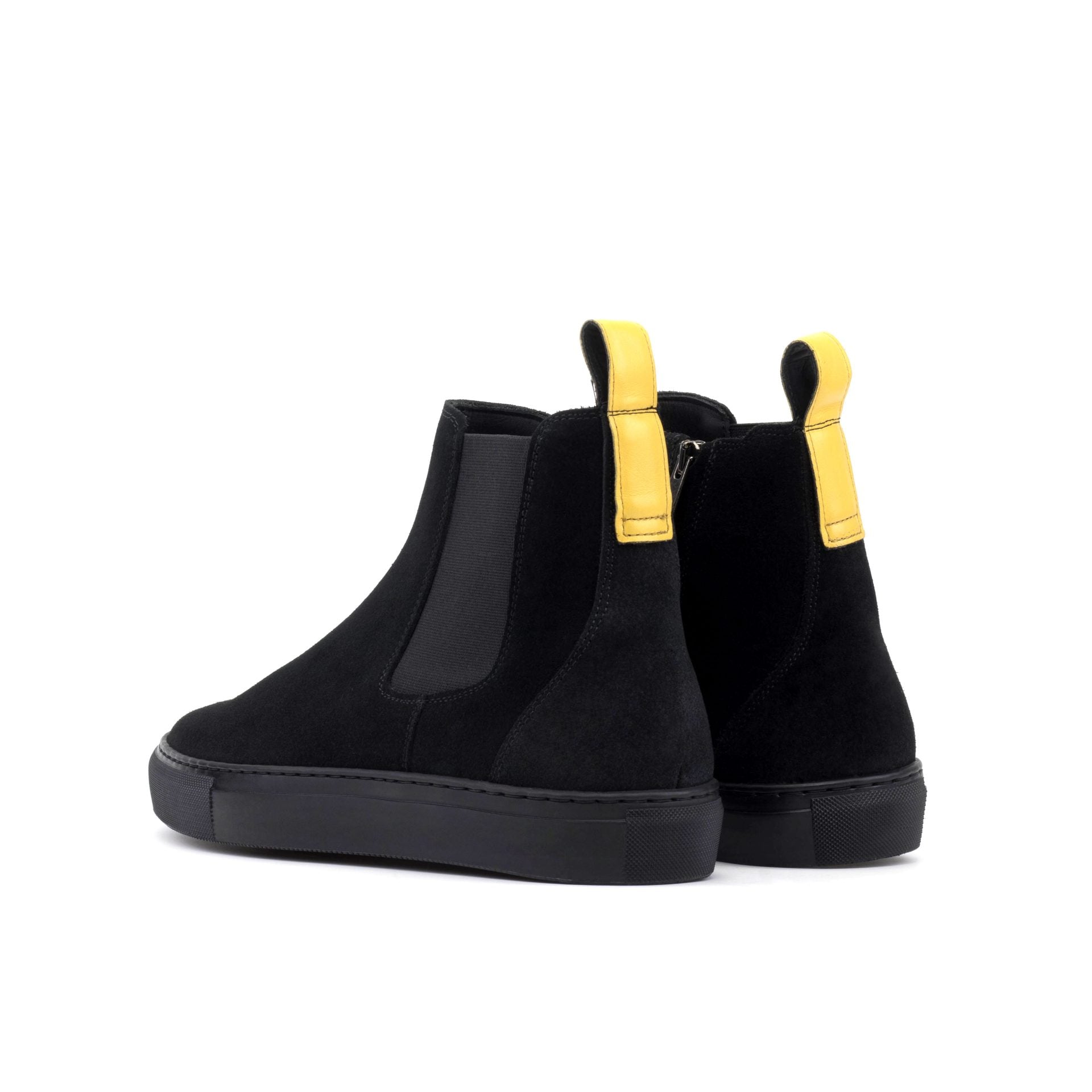The design is anchored by its consistent and sleek aesthetic. The front, sides, and back are all constructed from rich Black Luxe Suede, giving the boot a uniform, velvety texture that exudes understated elegance. This premium material is known for its softness and durability, molding to your foot for a personalized fit over time. The monochromatic suede is punctuated by a bold back strap made from vibrant Yellow Nappa Leather. This unexpected detail adds a modern, graphic element to the design, providing a flash of color that distinguishes the boot from more conventional styles.