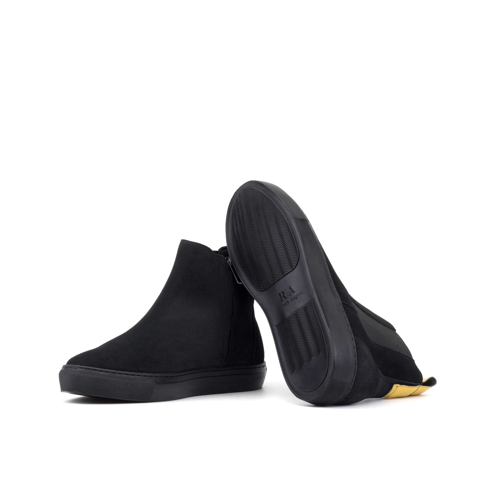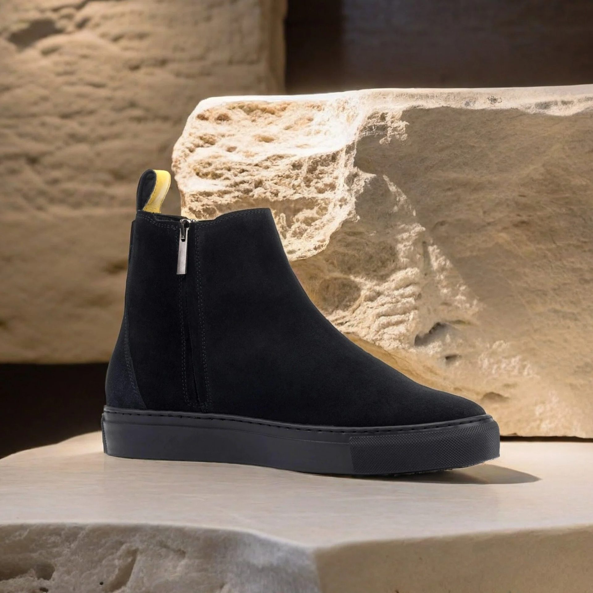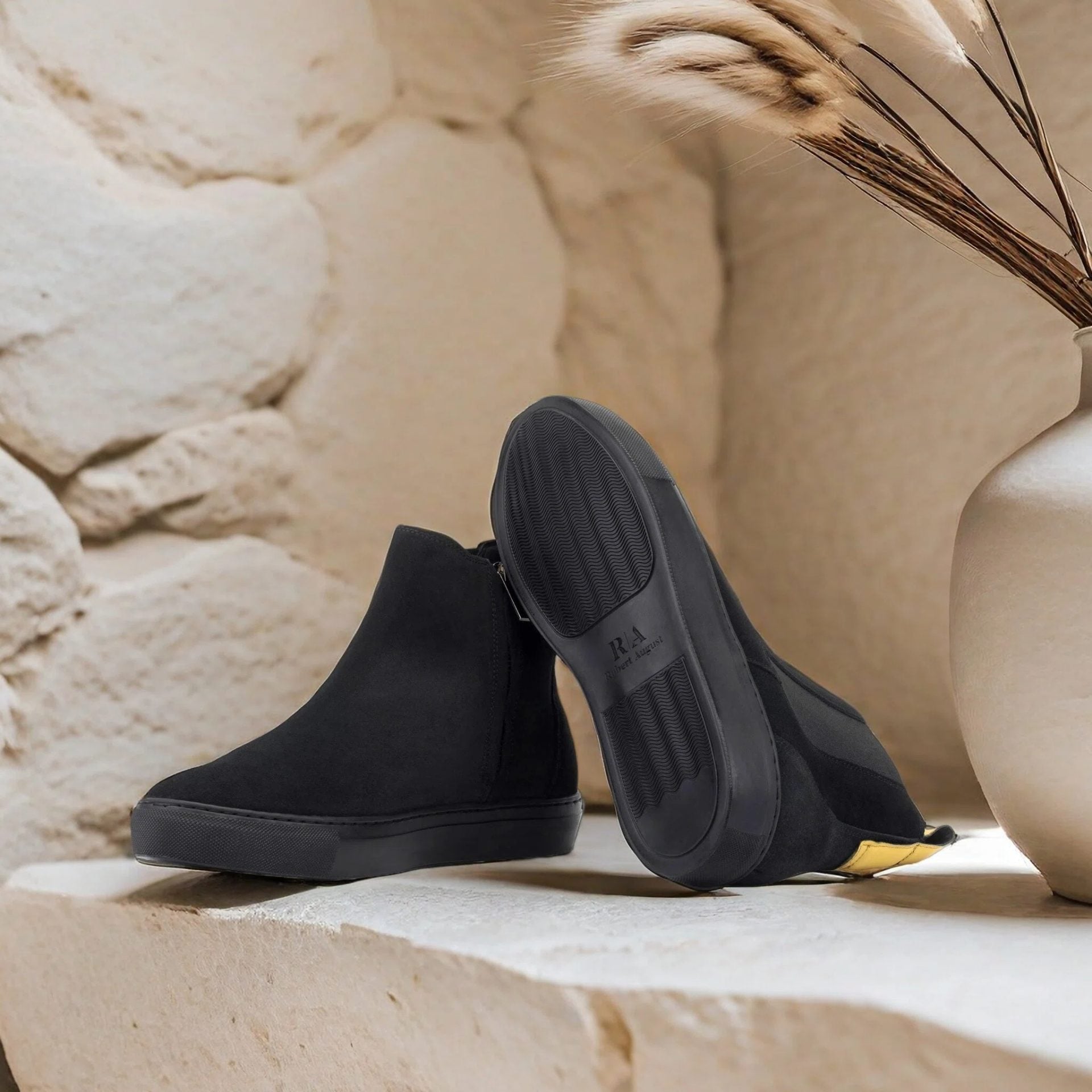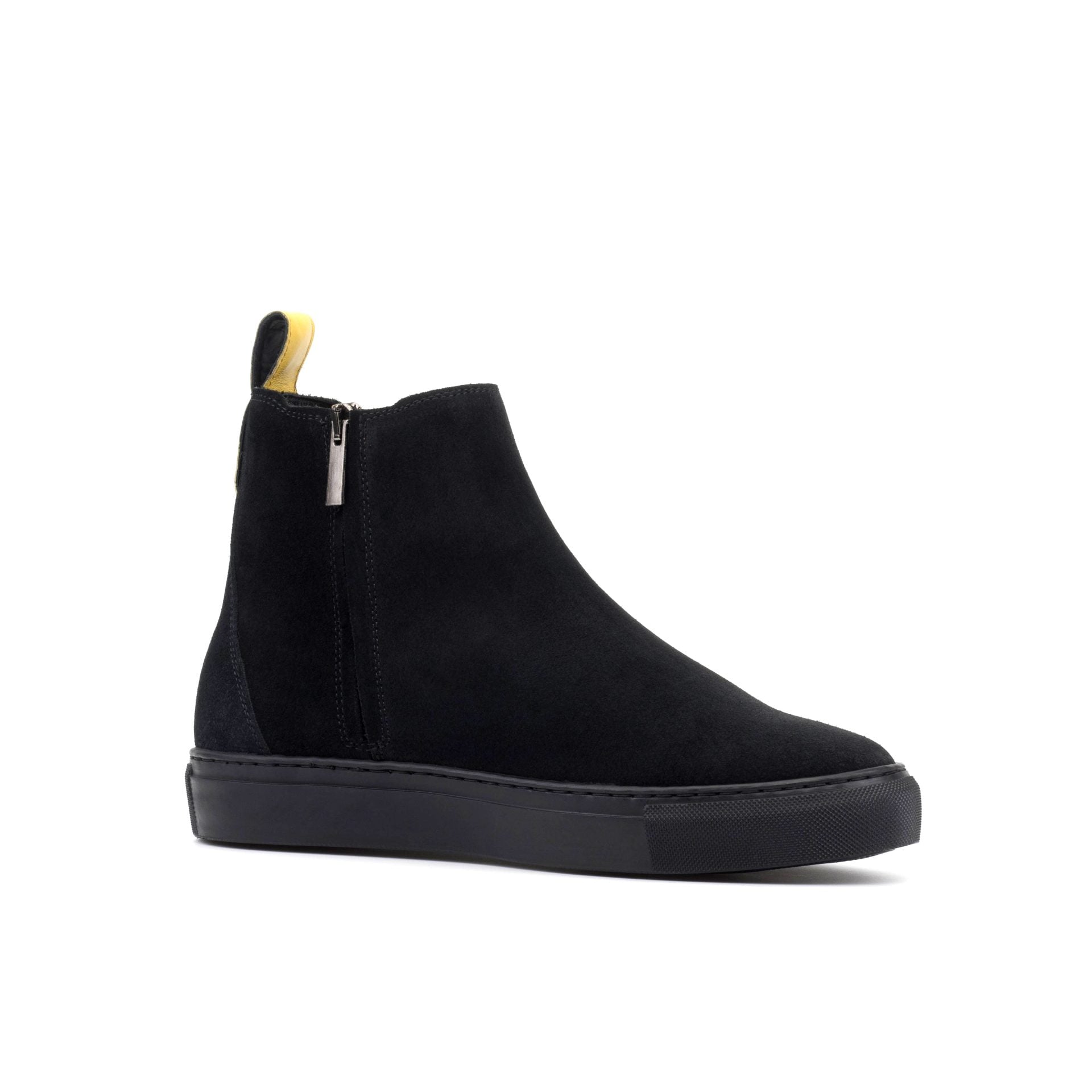 The design is anchored by its consistent and sleek aesthetic. The front, sides, and back are all constructed from rich Black Luxe Suede, giving the boot a uniform, velvety texture that exudes understated elegance. This premium material is known for its softness and durability, molding to your foot for a personalized fit over time. The monochromatic suede is punctuated by a bold back strap made from vibrant Yellow Nappa Leather. This unexpected detail adds a modern, graphic element to the design, providing a flash of color that distinguishes the boot from more conventional styles.