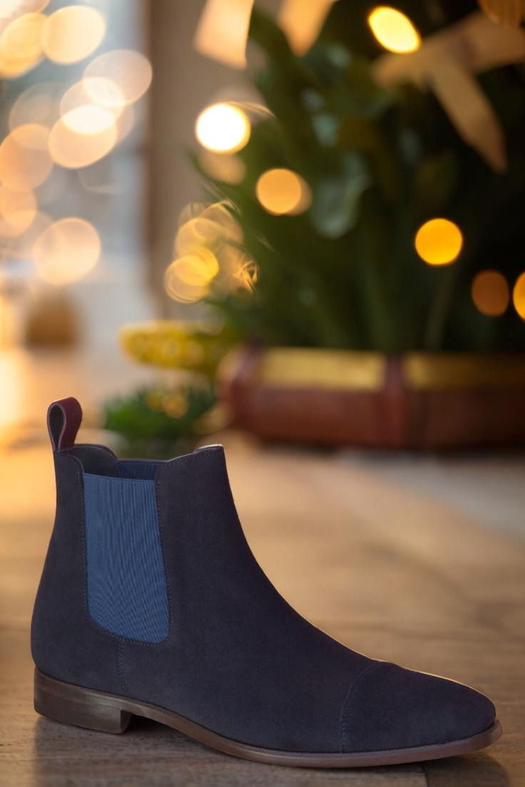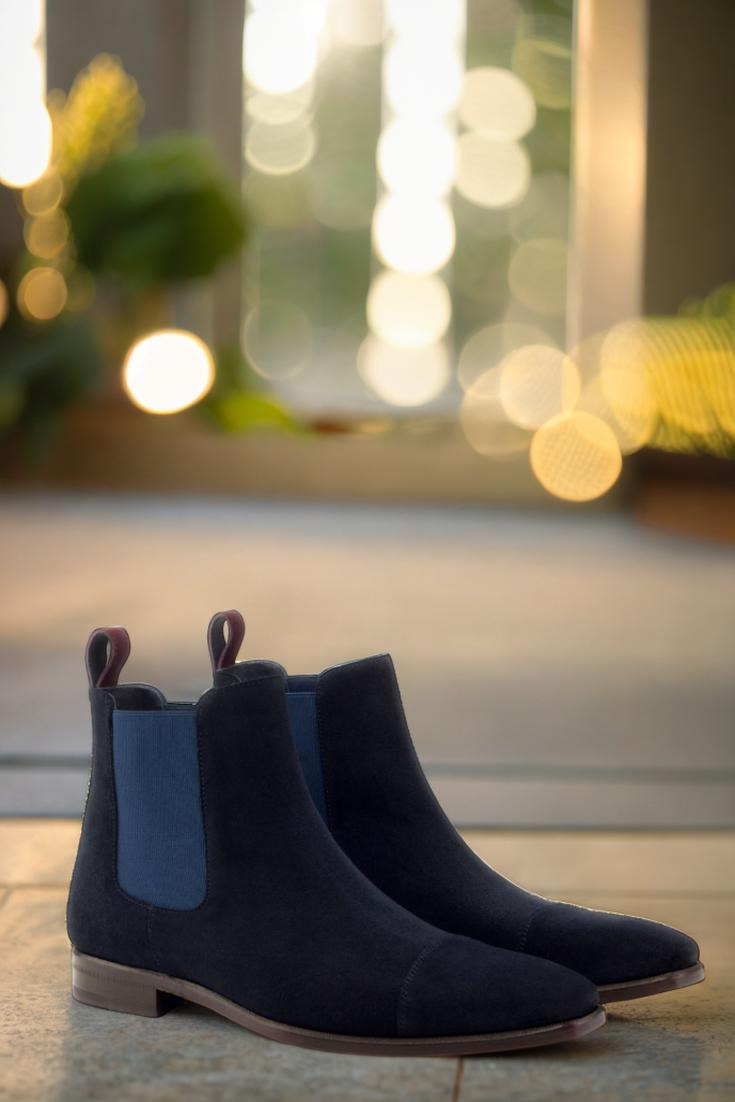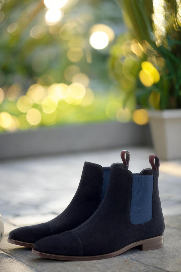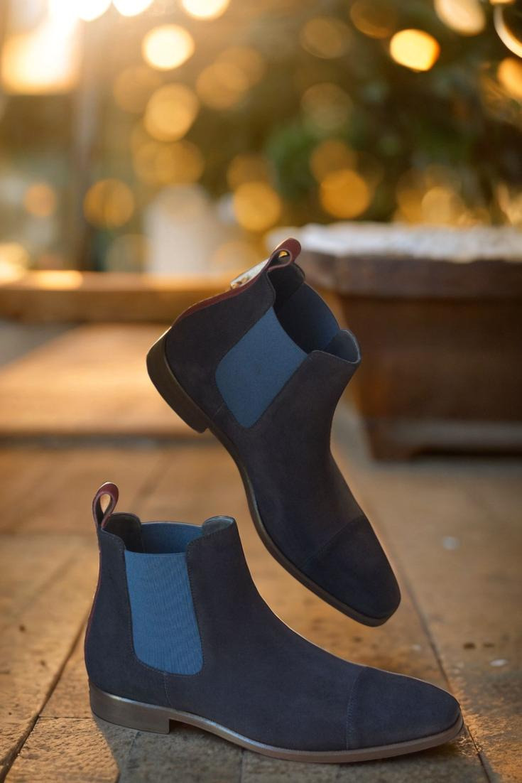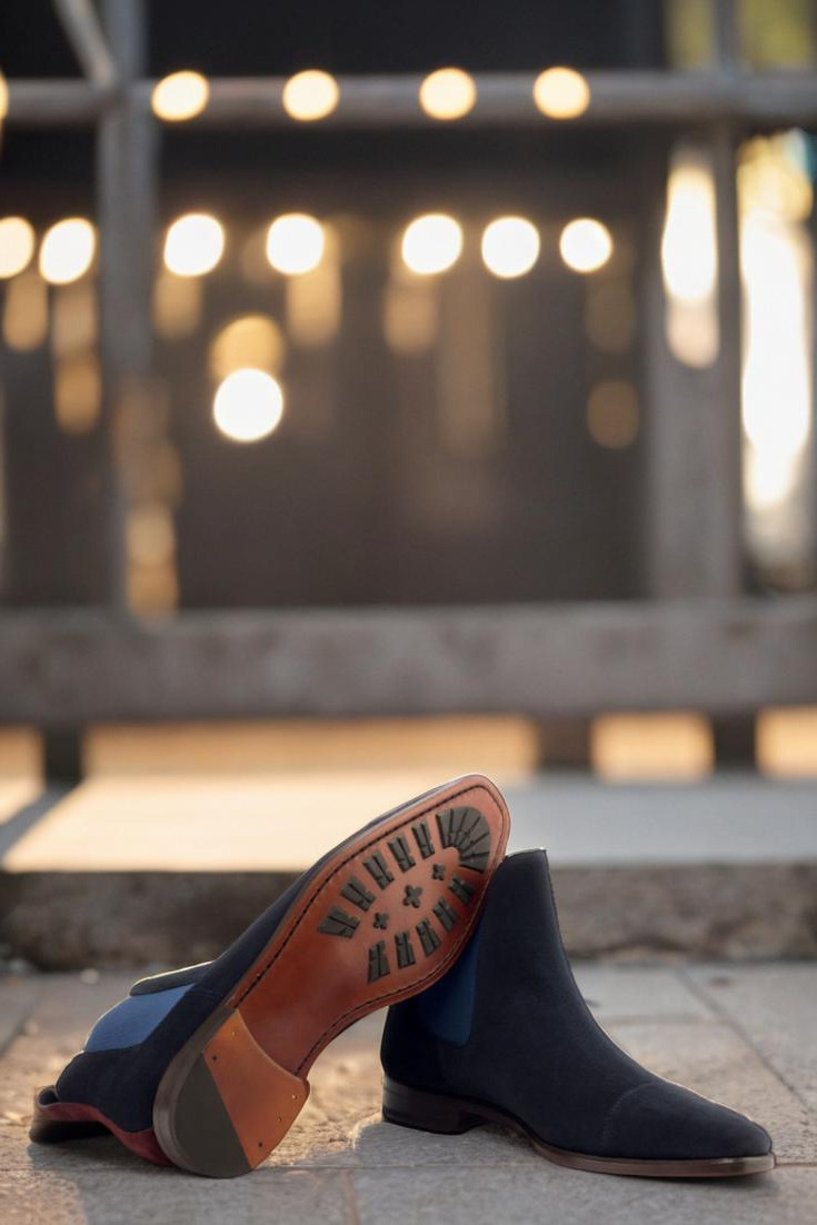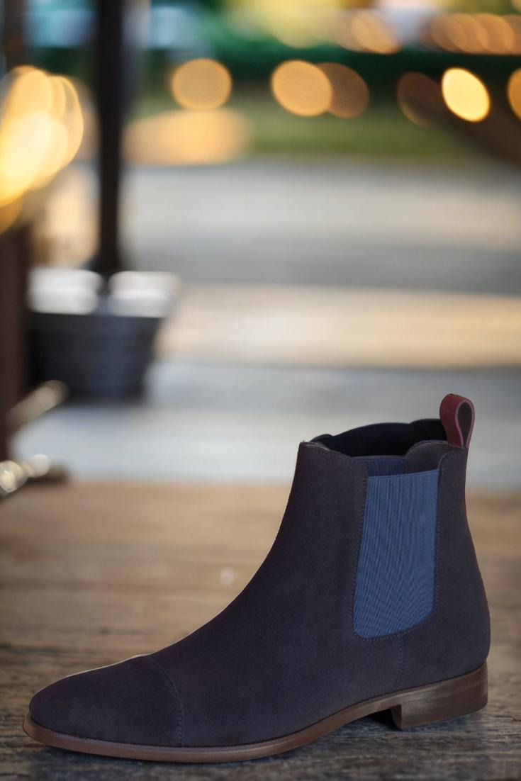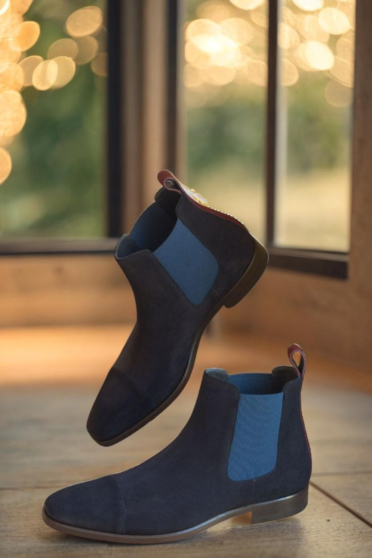 Step into luxury with The Fulton St. Chelsea Boot No. 2895 from Robert August. Featuring a sleek cap toe design in navy blue luxe suede, this boot exudes sophistication and style. The front, sides, and elastic detailing are all crafted from the same sumptuous navy blue luxe suede, creating a cohesive and polished look.