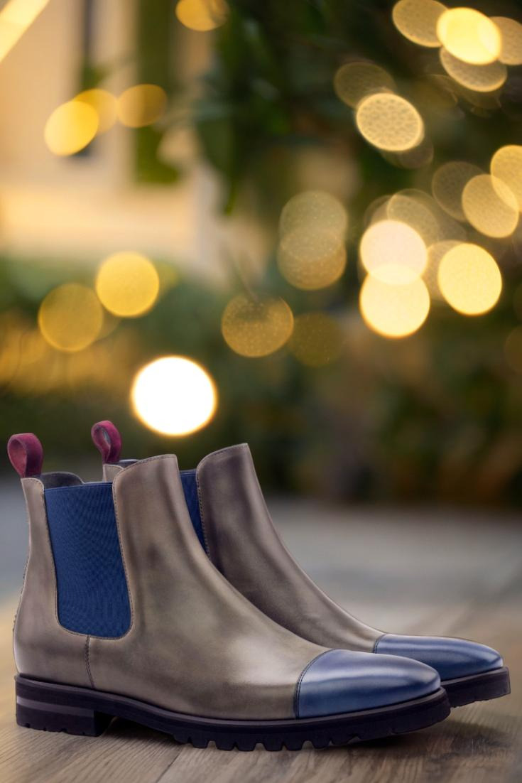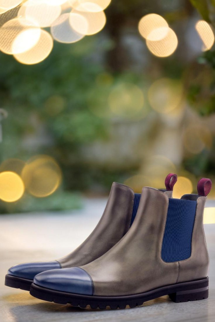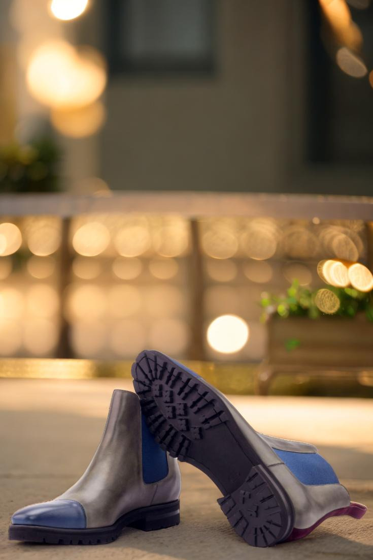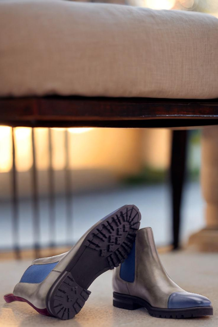 The toe cap in navy blue painted calf adds a pop of color and sophistication, while the front and sides in grey painted calf exude elegance. The back strap in wine kid suede is a luxurious touch that sets this boot apart from the rest. With elastic in navy blue and a lining in navy blue calf leather, every aspect of this boot is designed for comfort and style.