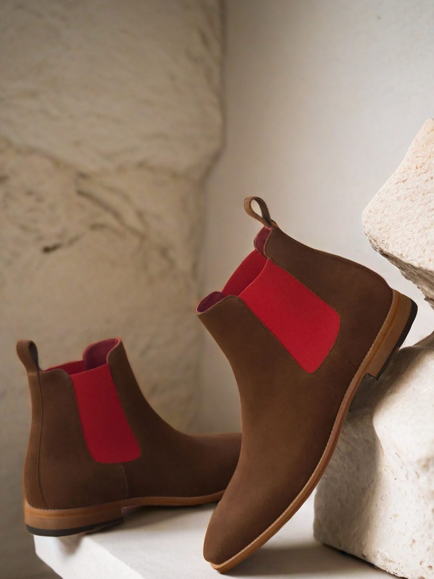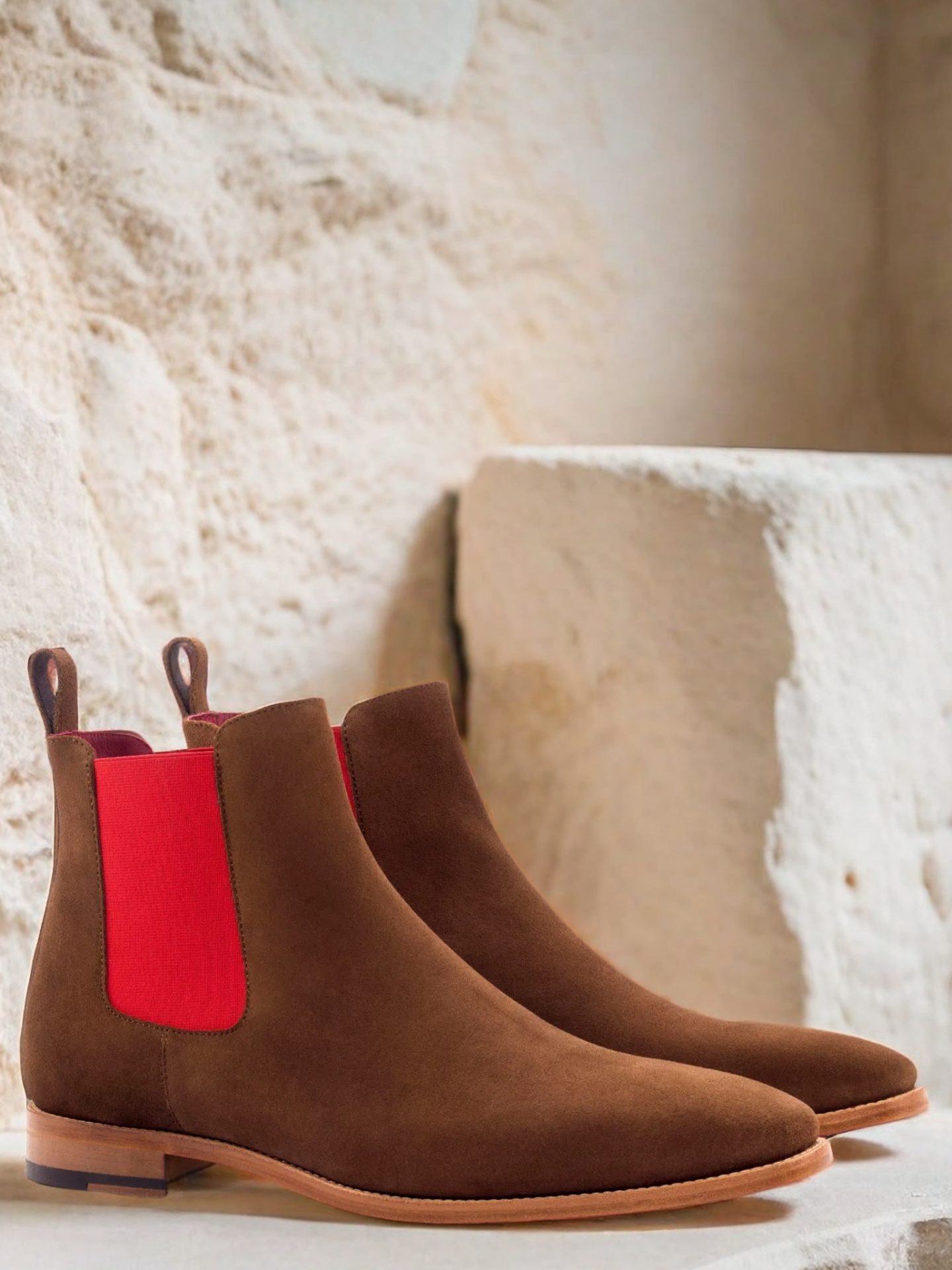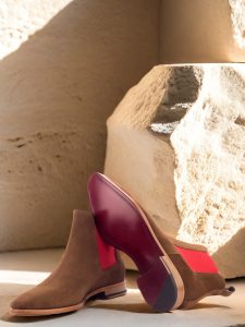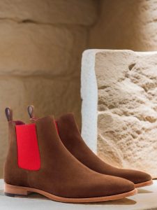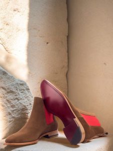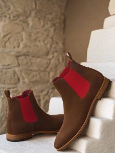 The front of the boot is crafted from medium brown luxe suede, while the sides and back strap feature an identical material. The brightly colored red elastic adds a subtle pop of color that will elevate any outfit; meanwhile, a red calf leather lining provides breathability and comfort throughout the day. For a true statement piece, there’s nothing like this dark red hand-painted leather sole – it’s sure to be the envy of all your friends when paired with any outfit! Finally, a natural leather outsole ensures durability and support when walking on tough terrain – perfect for those long days in the office or city streets!