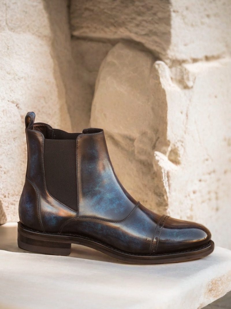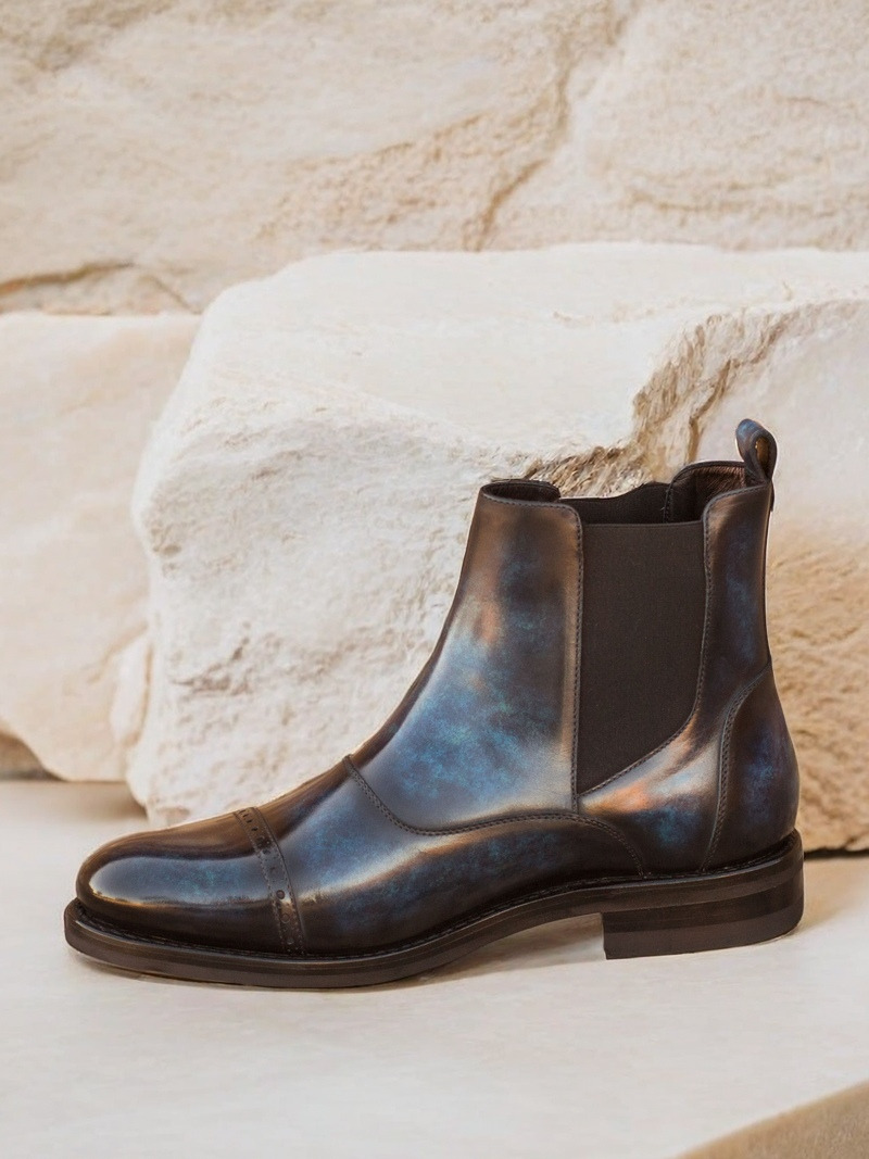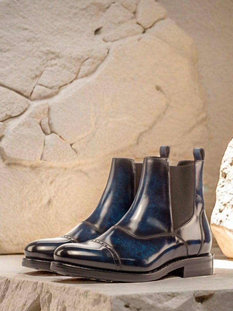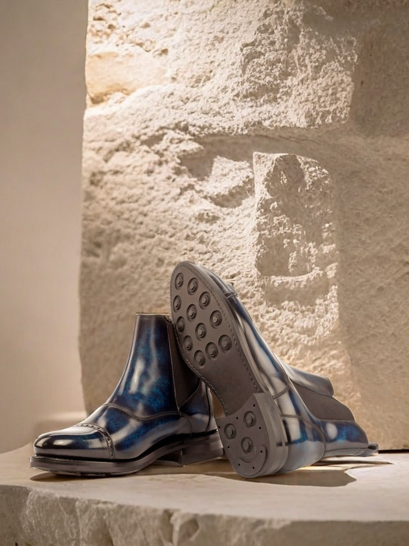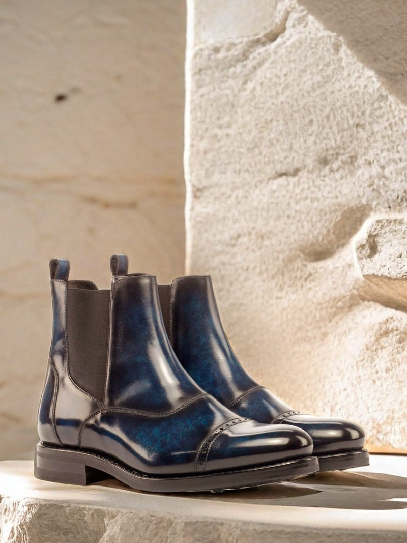Experience the perfect blend of style and practicality with The Halsted St. Chelsea Boot No. 3695 from Robert August. This versatile boot is made from the finest Italian Calf Leather, specially hand-finished with a striking Denim Blue Patina for a truly unique look. The Marble style patina adds an air of sophistication, making these boots perfect for both formal and casual occasions.